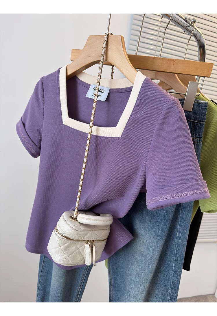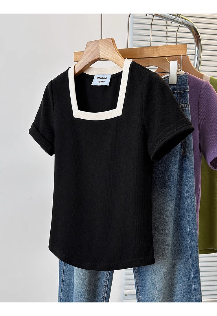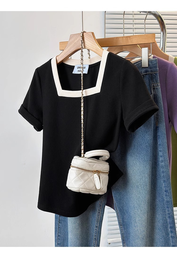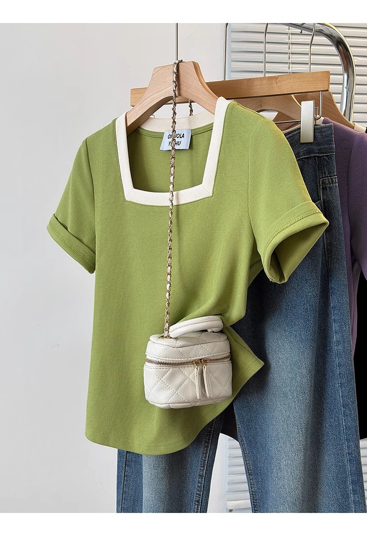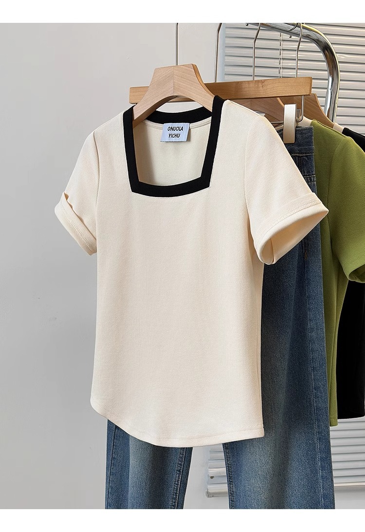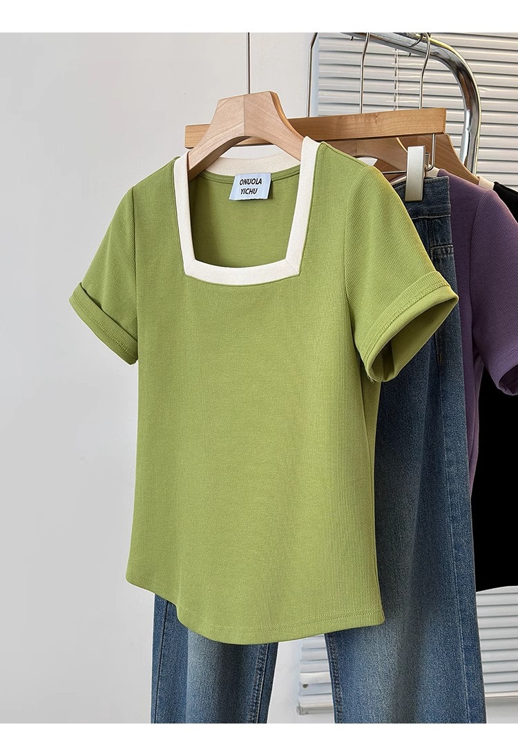 플러스 사이즈 통통녀 여성 패션 외국 스타일 스퀘어 칼라 반팔 티셔츠 여름 어깨 슬리밍면 티셔츠 재킷 200kg스토어 가기