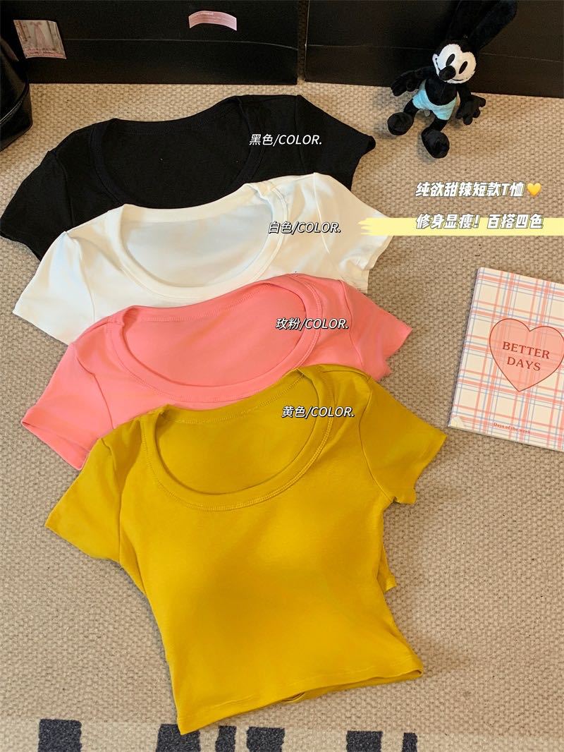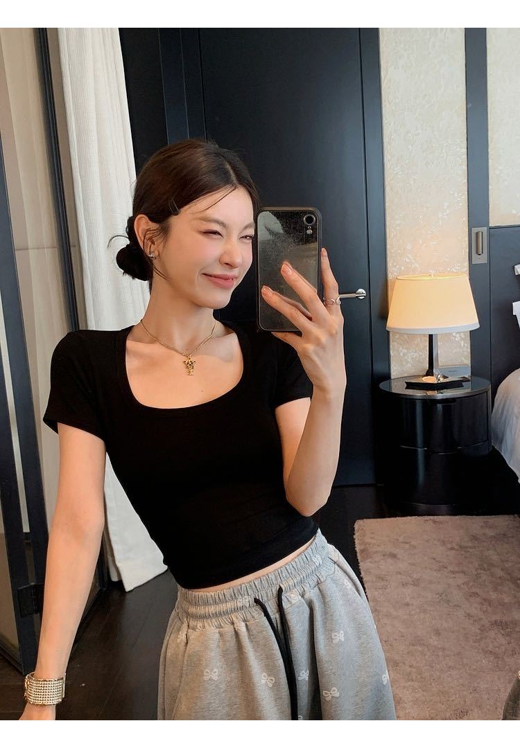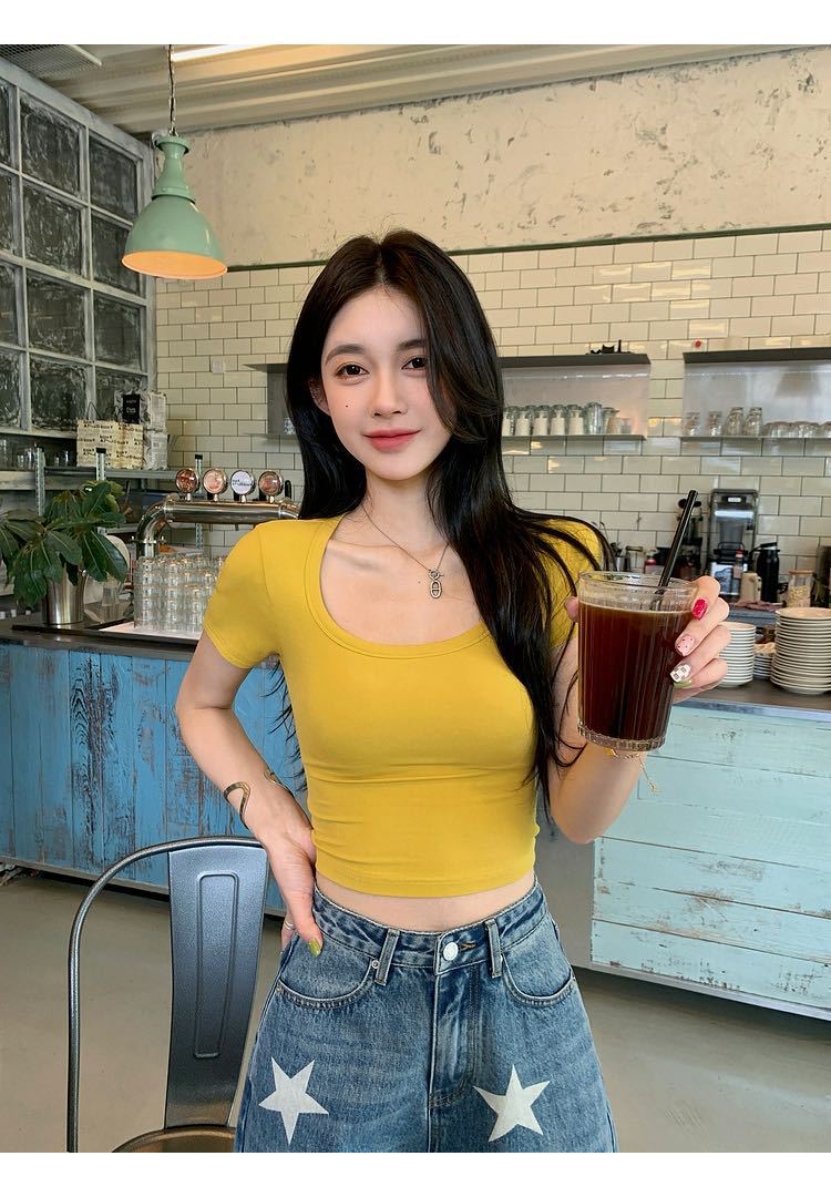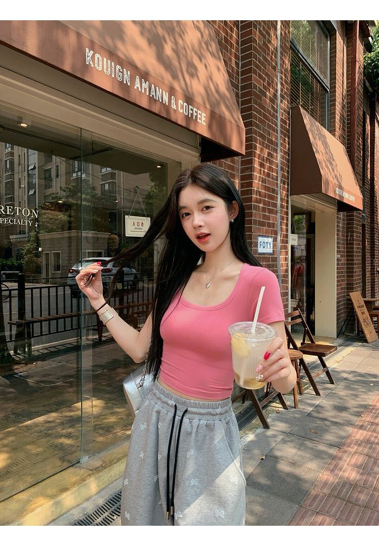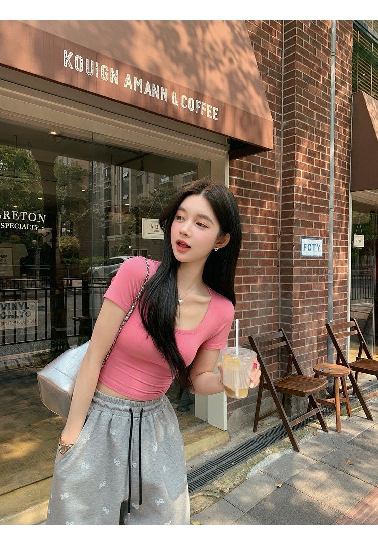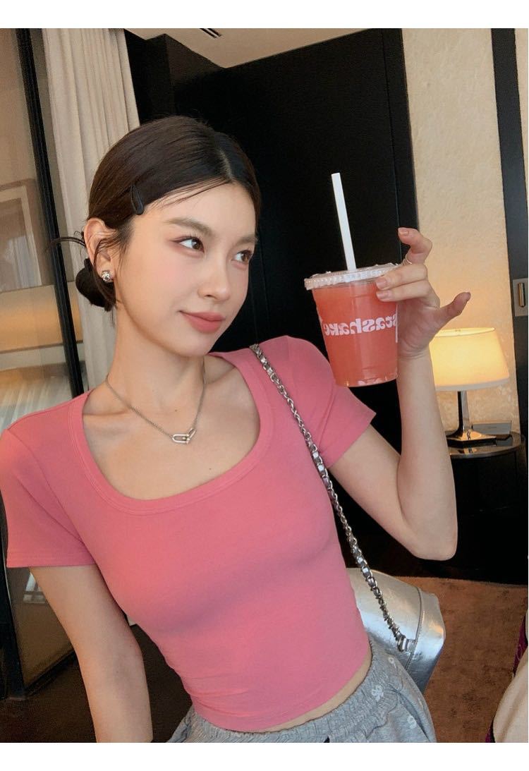 5041 # 레이온 어깨 반팔 티셔츠 여름 2025 새로운 도파민 착용 슬림 U-넥 쇼트 코트 여성스토어 가기