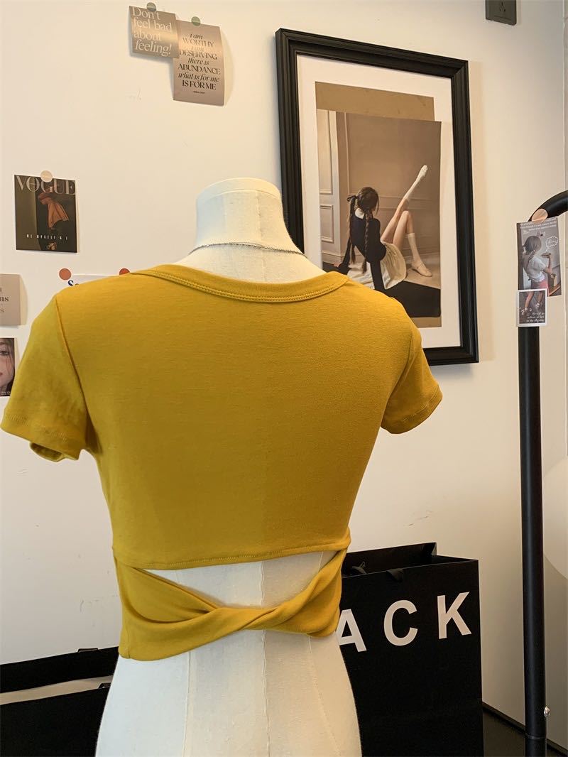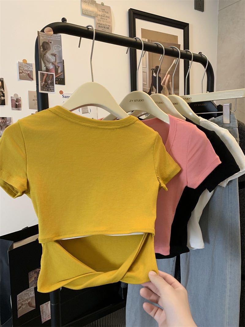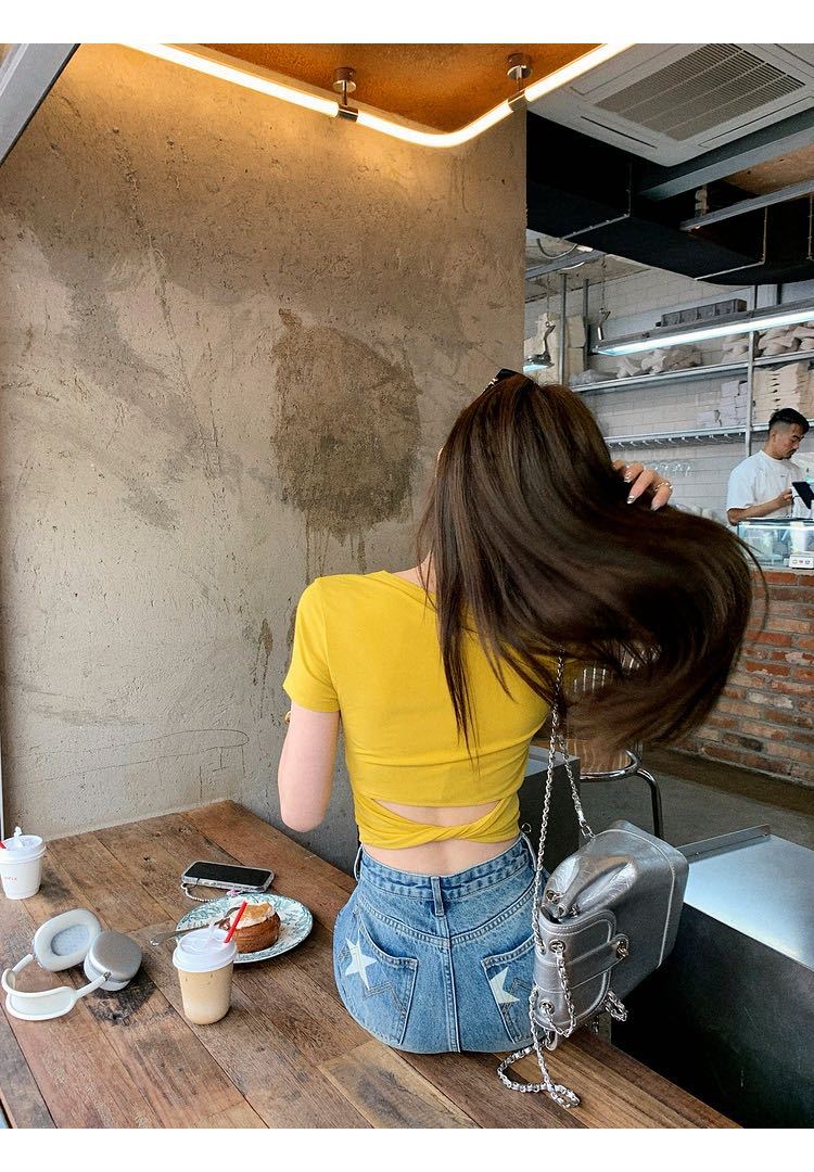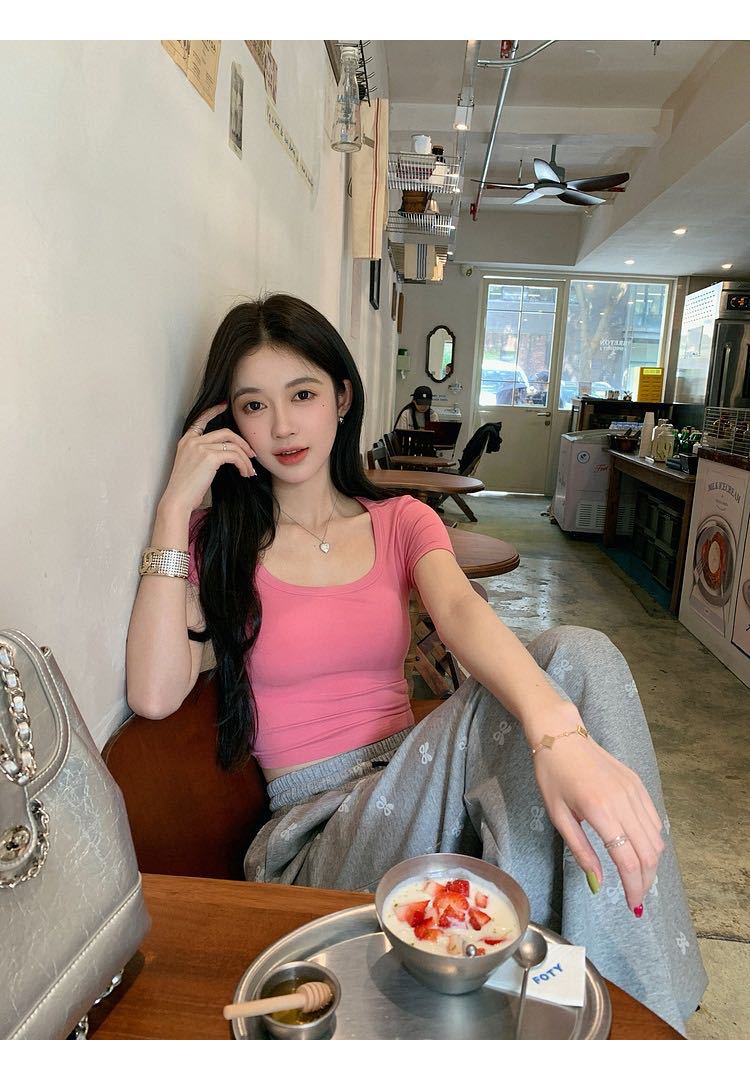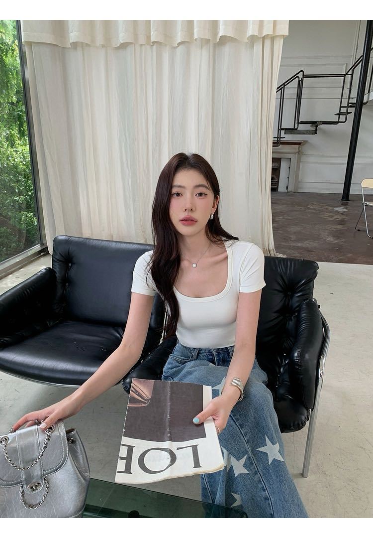 5041 # 레이온 어깨 반팔 티셔츠 여름 2025 새로운 도파민 착용 슬림 U-넥 쇼트 코트 여성스토어 가기