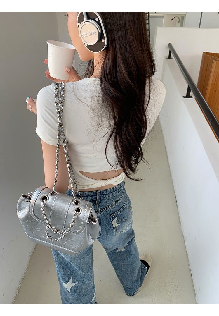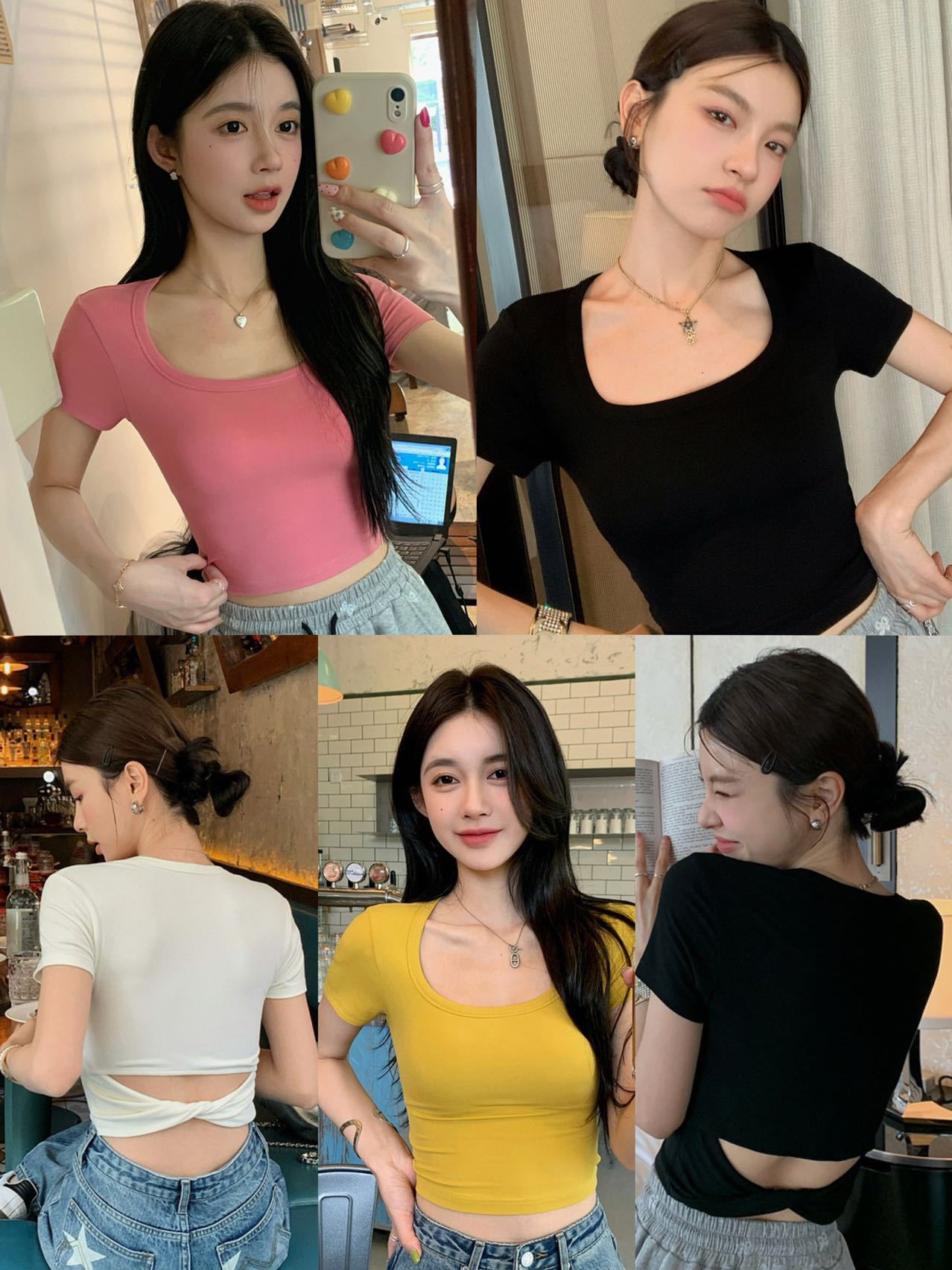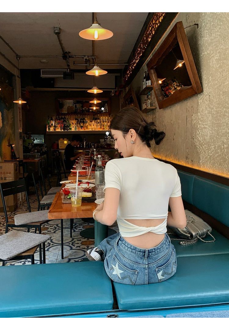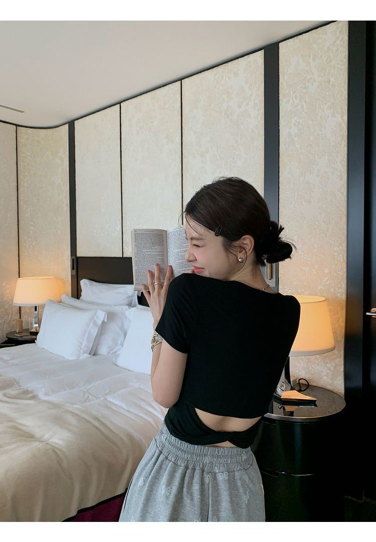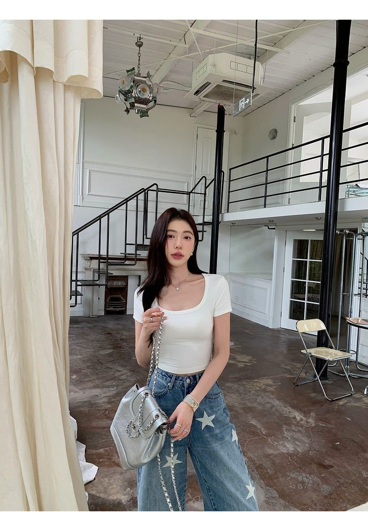 5041 # 레이온 어깨 반팔 티셔츠 여름 2025 새로운 도파민 착용 슬림 U-넥 쇼트 코트 여성스토어 가기