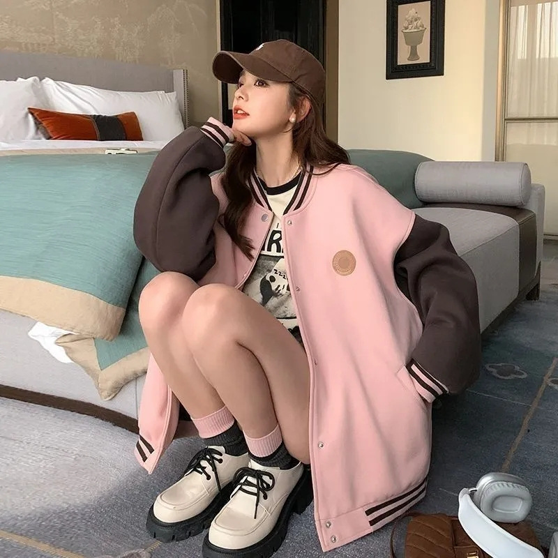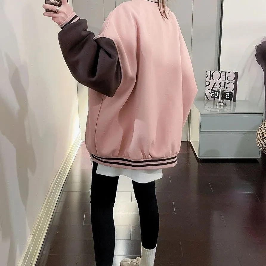 핑크 야구 세트 코트 여자 2024 가을 새로운 미국 대학 스타일 거리 홍콩 스타일 세련된 재킷 탑스토어 가기