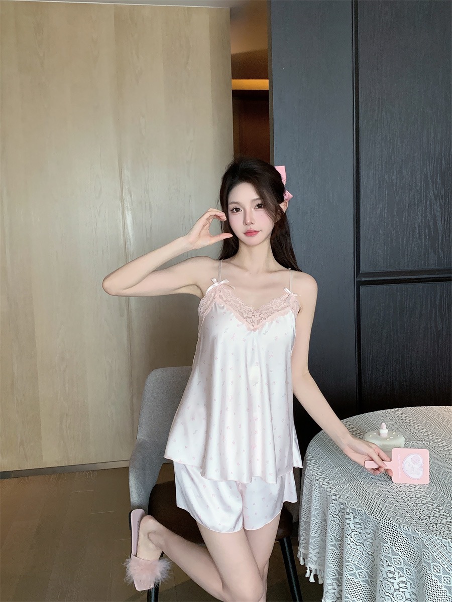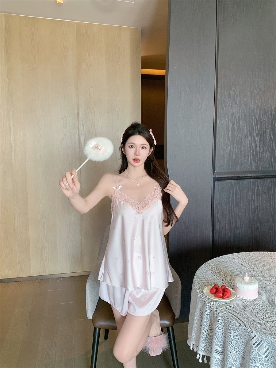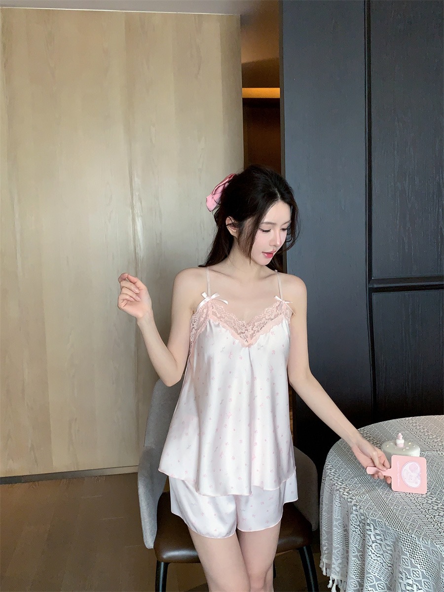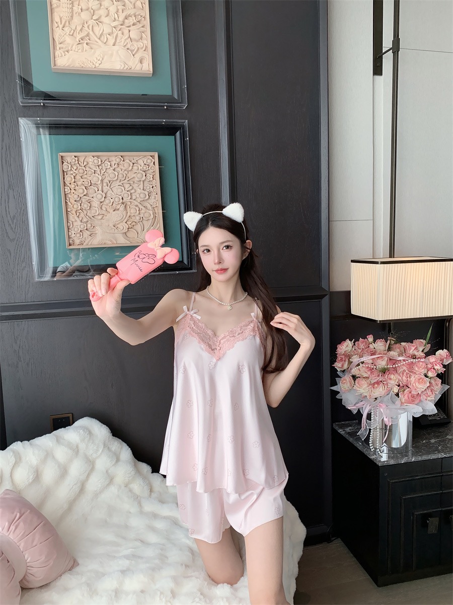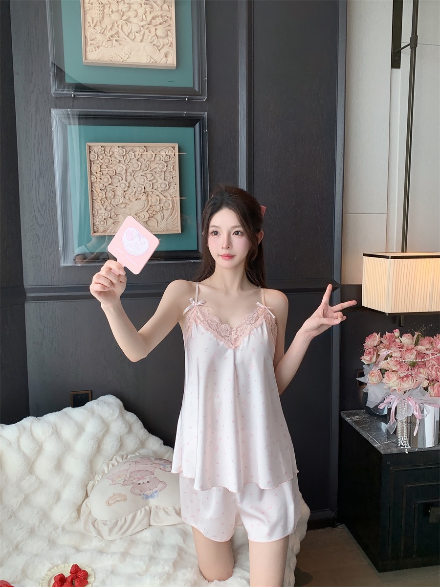 여성 여름 아이스 실크 잠옷, 순수하고 매혹적인 멜빵 반바지, 홈웨어, 프린트 잠옷 세트, 레이스, 소녀스럽고 핑크빛, 달콤하고 사랑스러운스토어 가기