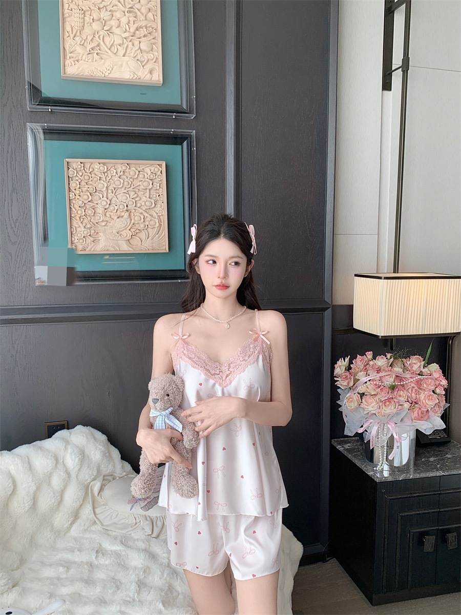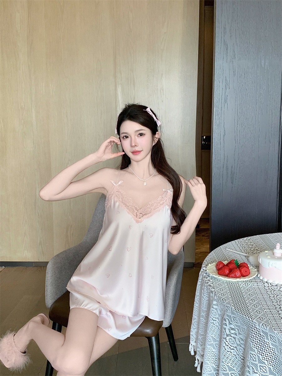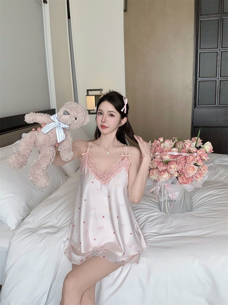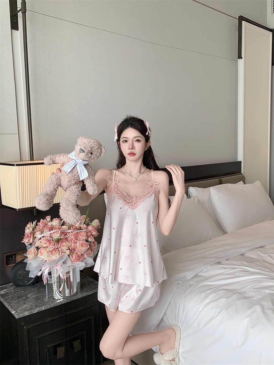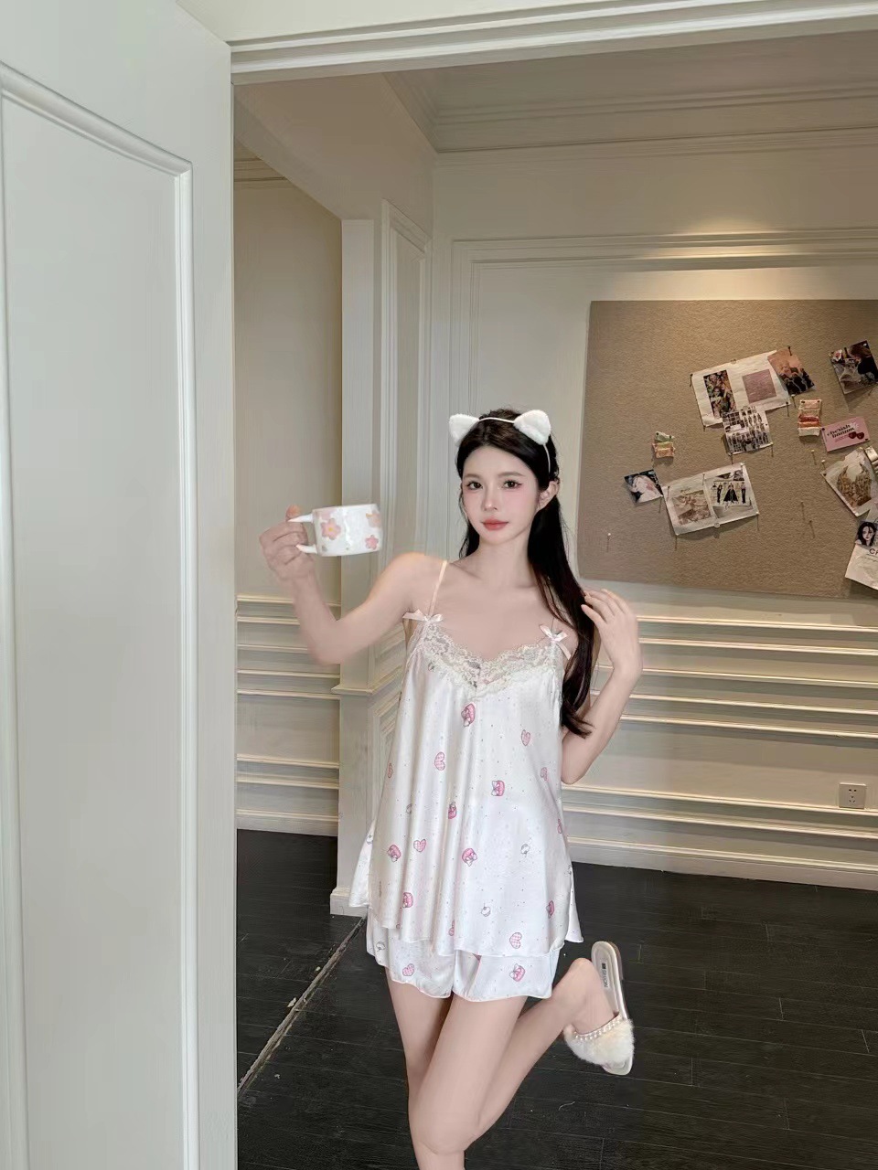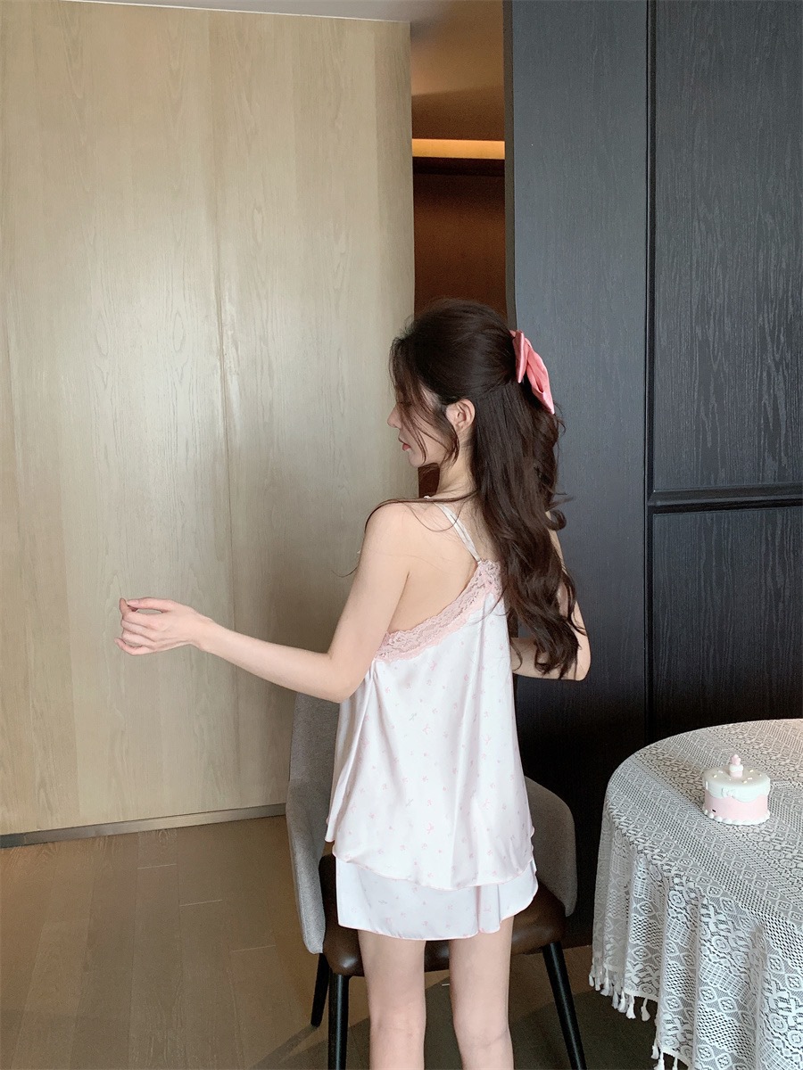 여성 여름 아이스 실크 잠옷, 순수하고 매혹적인 멜빵 반바지, 홈웨어, 프린트 잠옷 세트, 레이스, 소녀스럽고 핑크빛, 달콤하고 사랑스러운스토어 가기