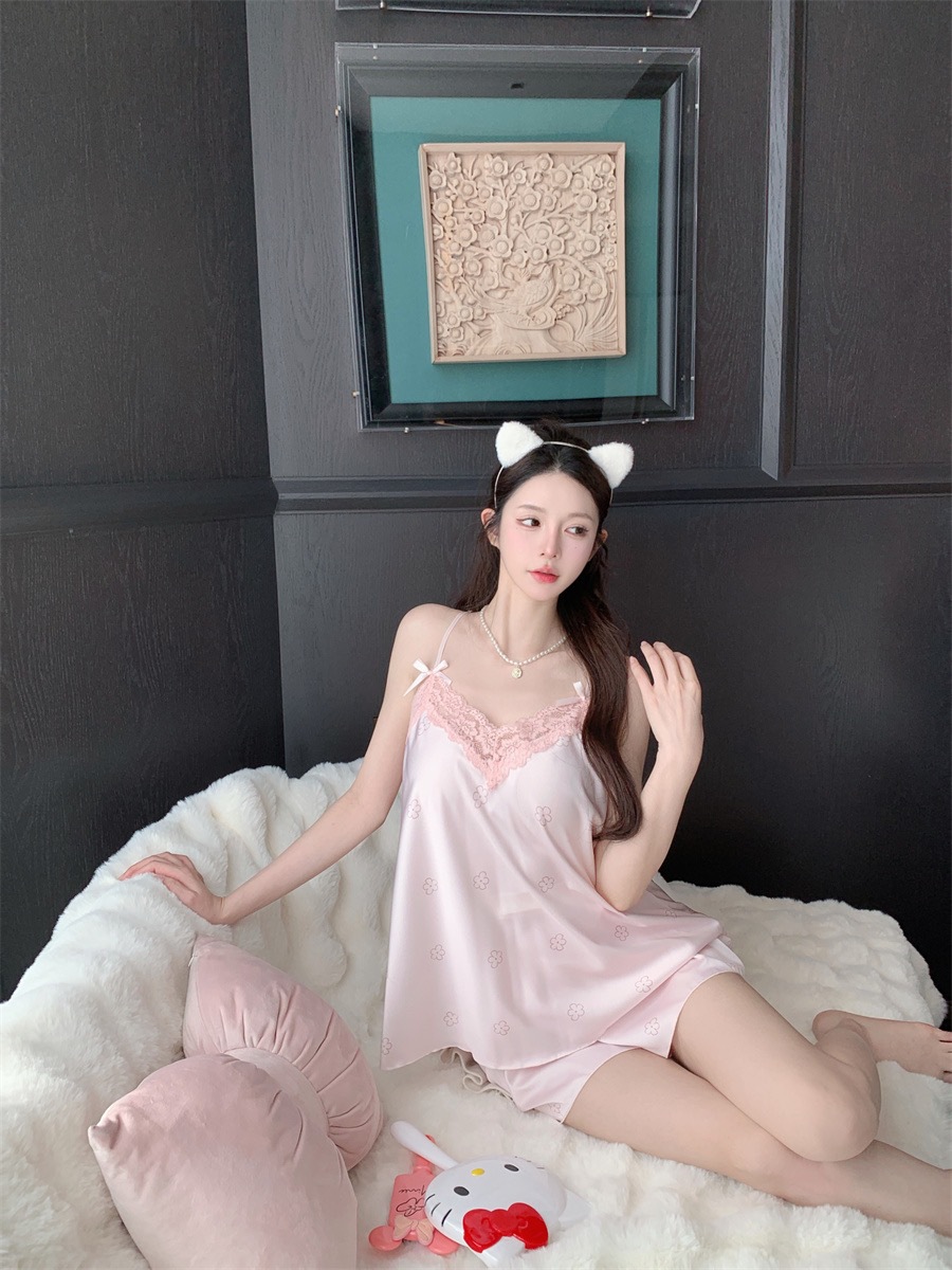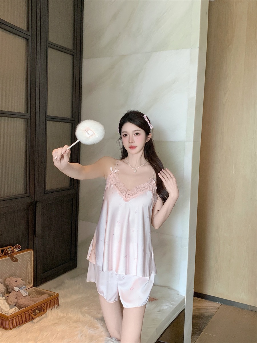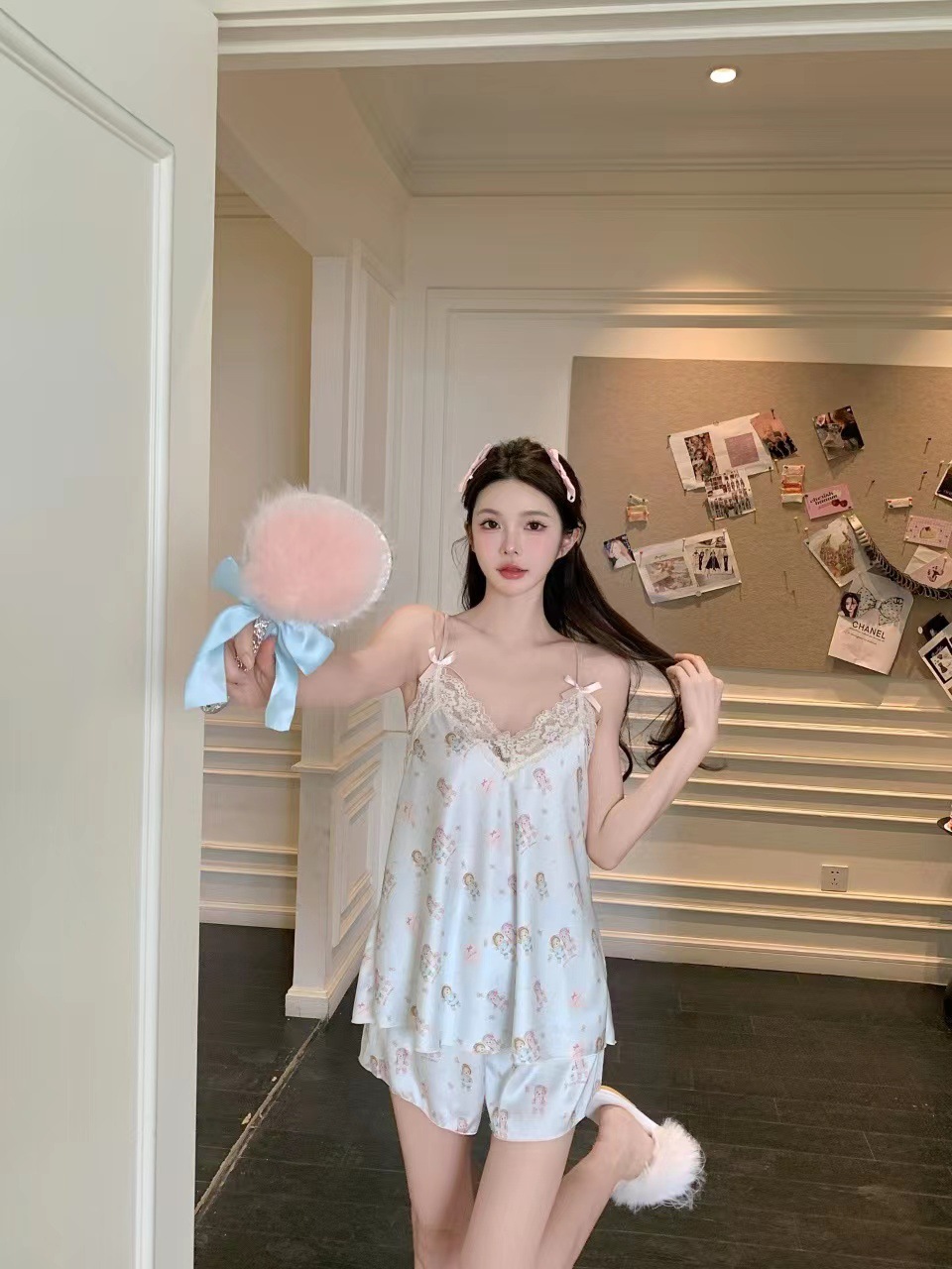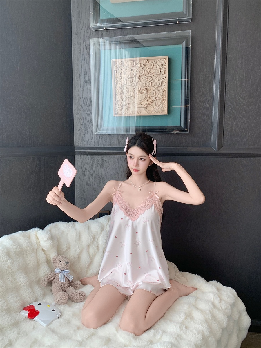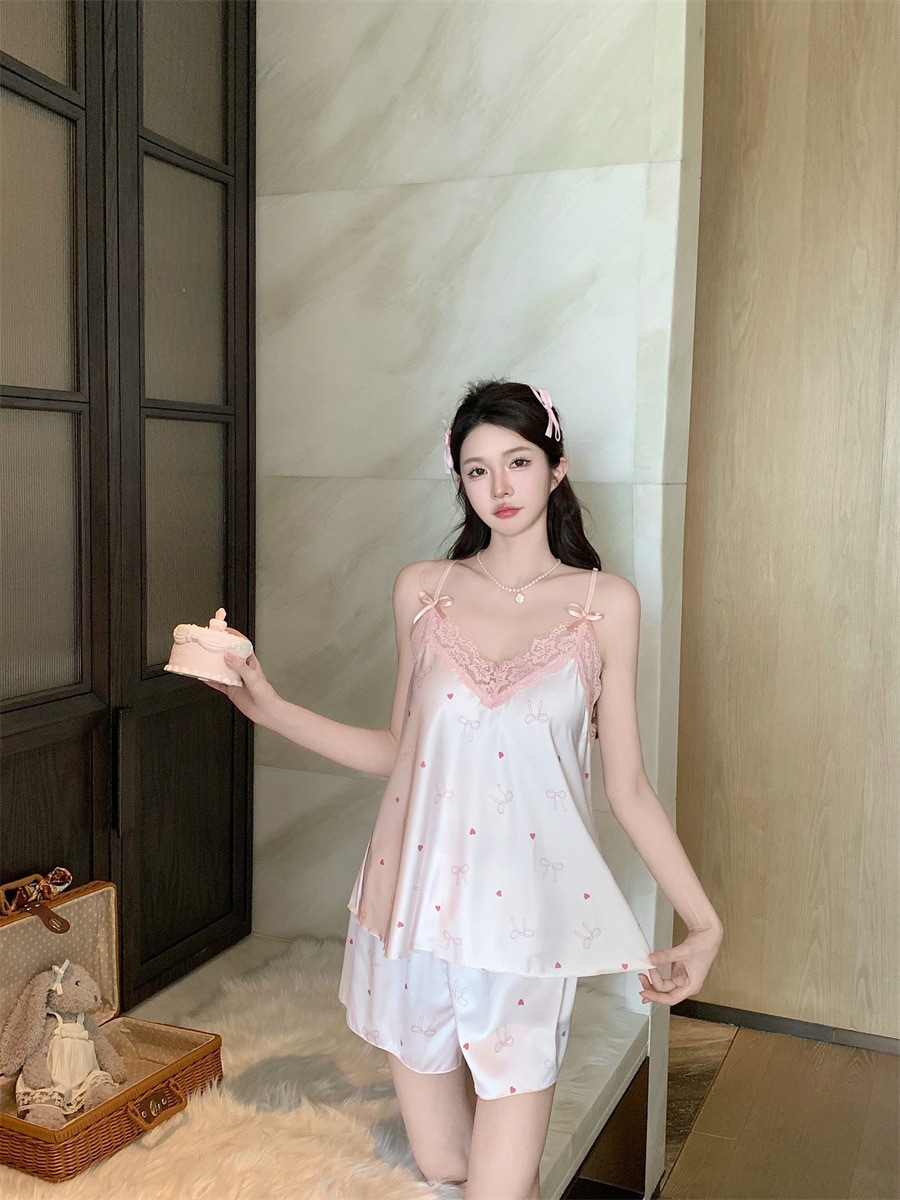여성 여름 아이스 실크 잠옷, 순수하고 매혹적인 멜빵 반바지, 홈웨어, 프린트 잠옷 세트, 레이스, 소녀스럽고 핑크빛, 달콤하고 사랑스러운스토어 가기