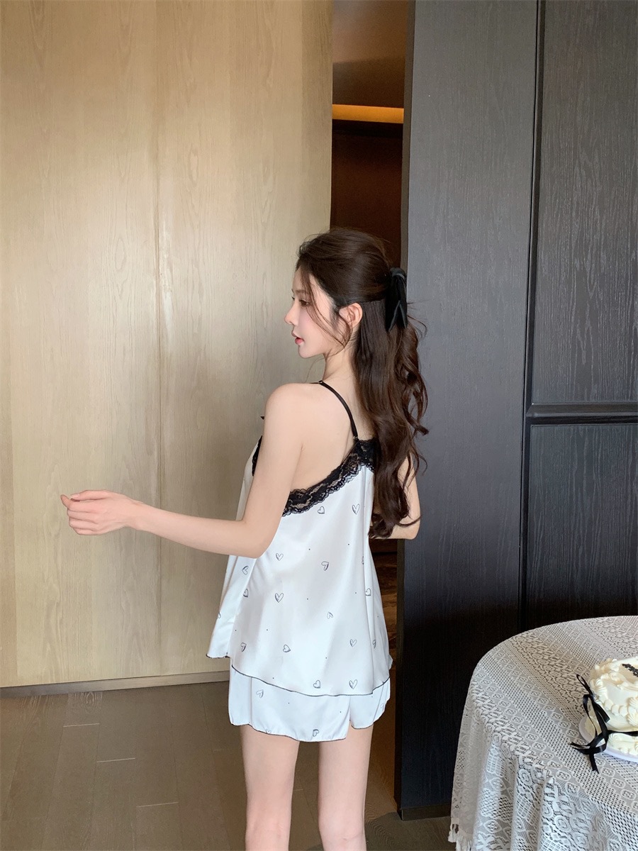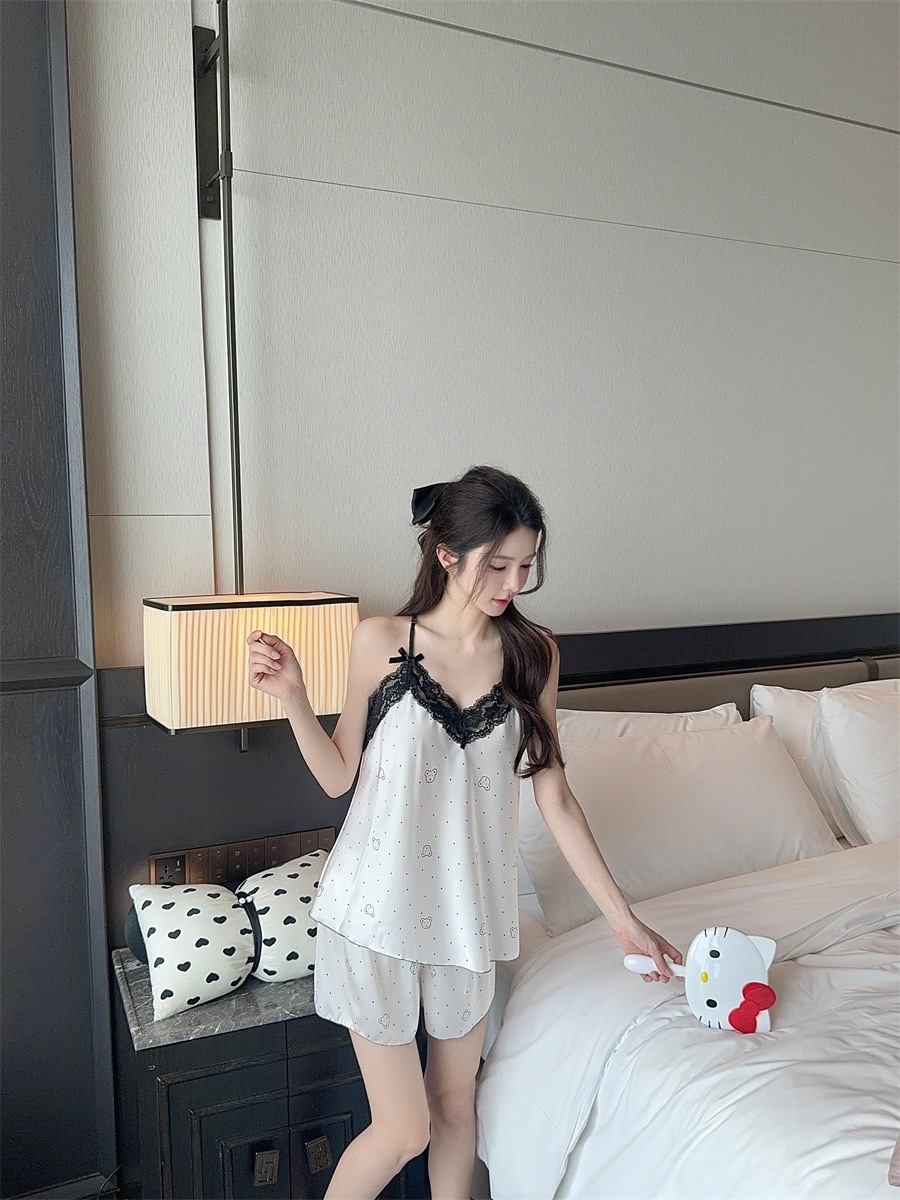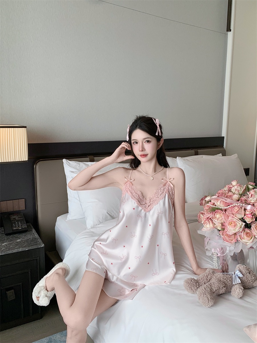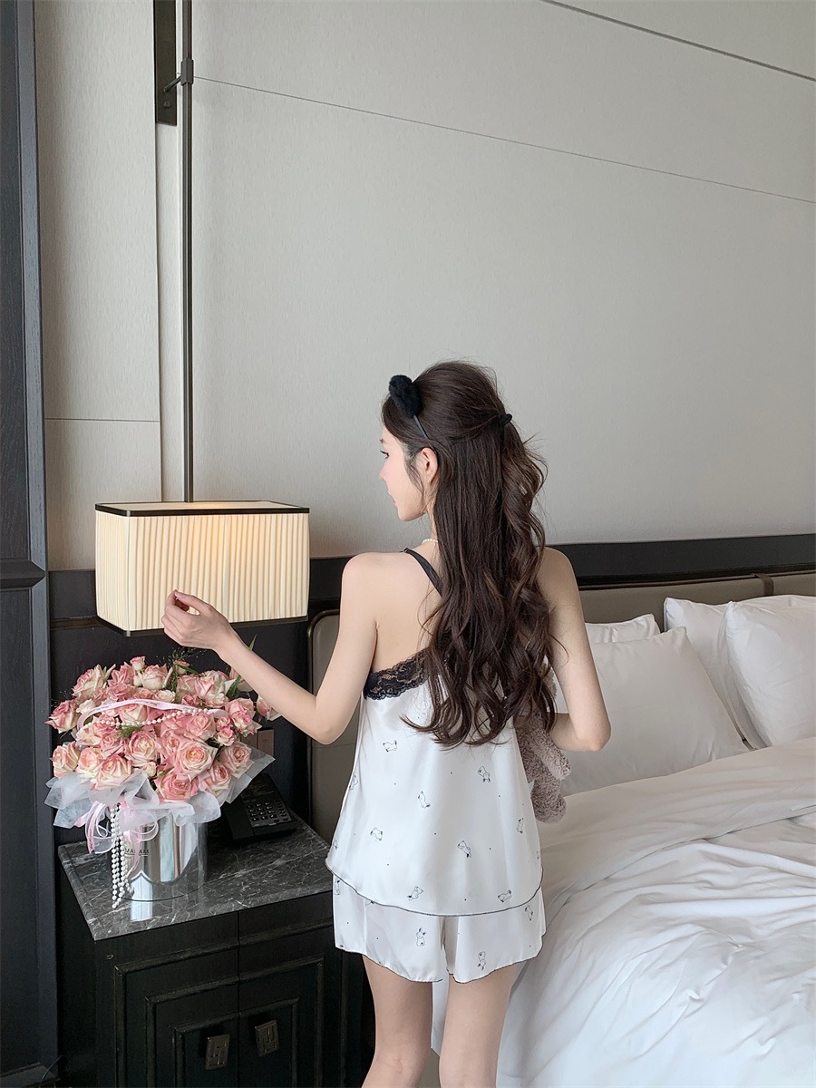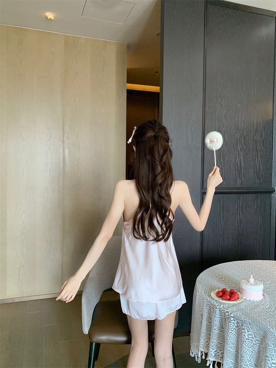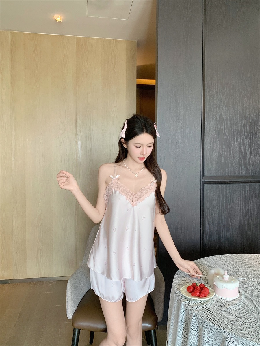 여성 여름 아이스 실크 잠옷, 순수하고 매혹적인 멜빵 반바지, 홈웨어, 프린트 잠옷 세트, 레이스, 소녀스럽고 핑크빛, 달콤하고 사랑스러운스토어 가기