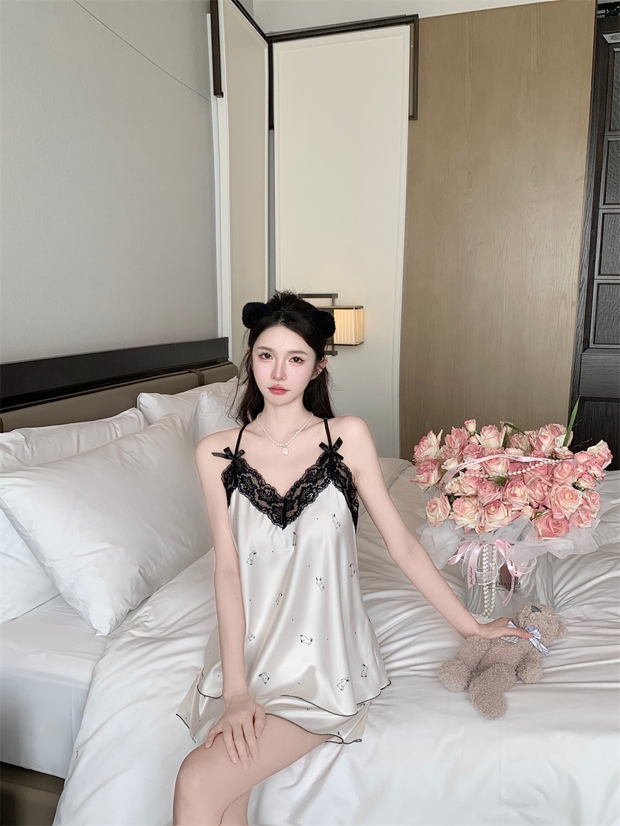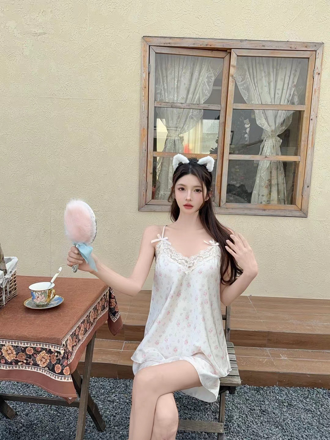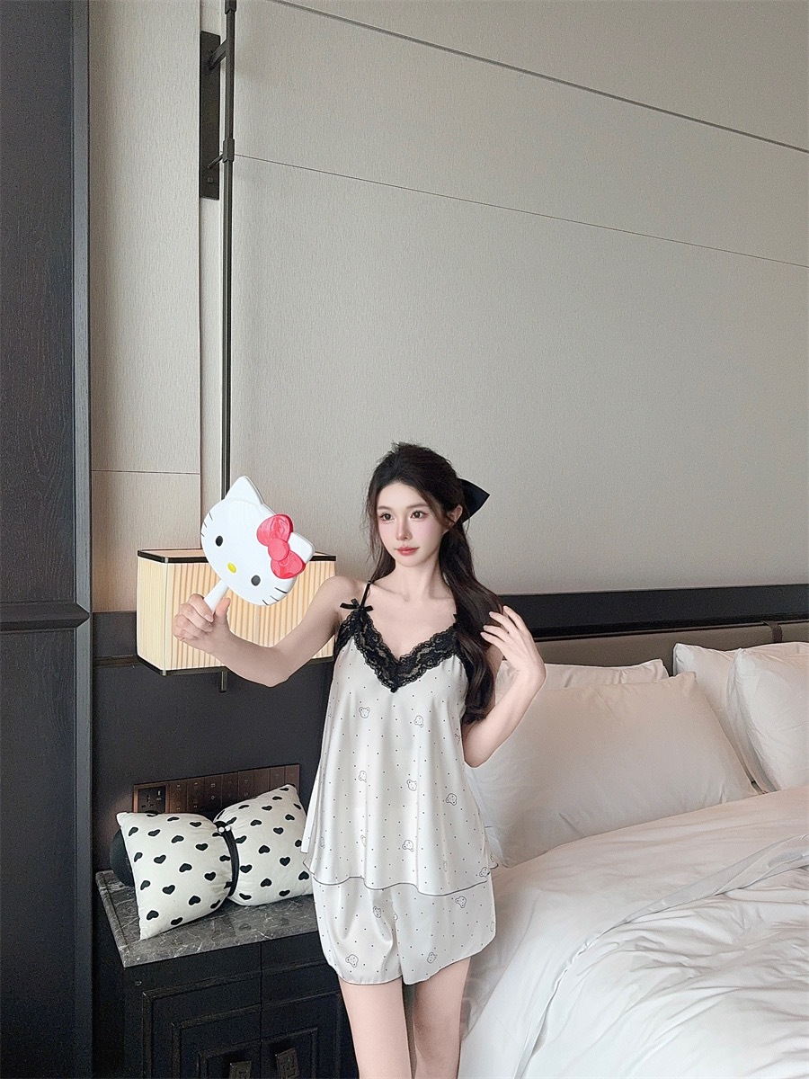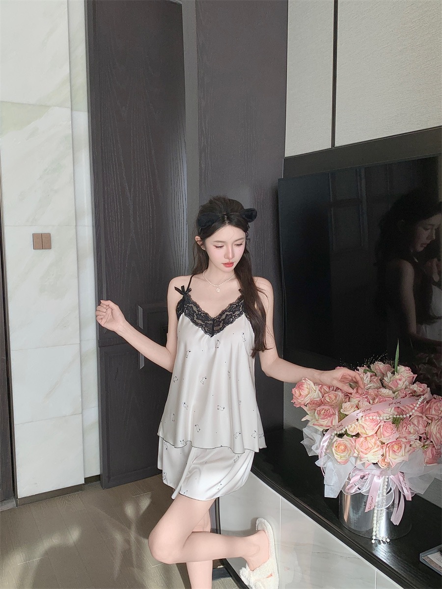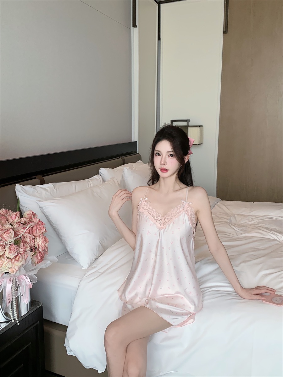 여성 여름 아이스 실크 잠옷, 순수하고 매혹적인 멜빵 반바지, 홈웨어, 프린트 잠옷 세트, 레이스, 소녀스럽고 핑크빛, 달콤하고 사랑스러운스토어 가기