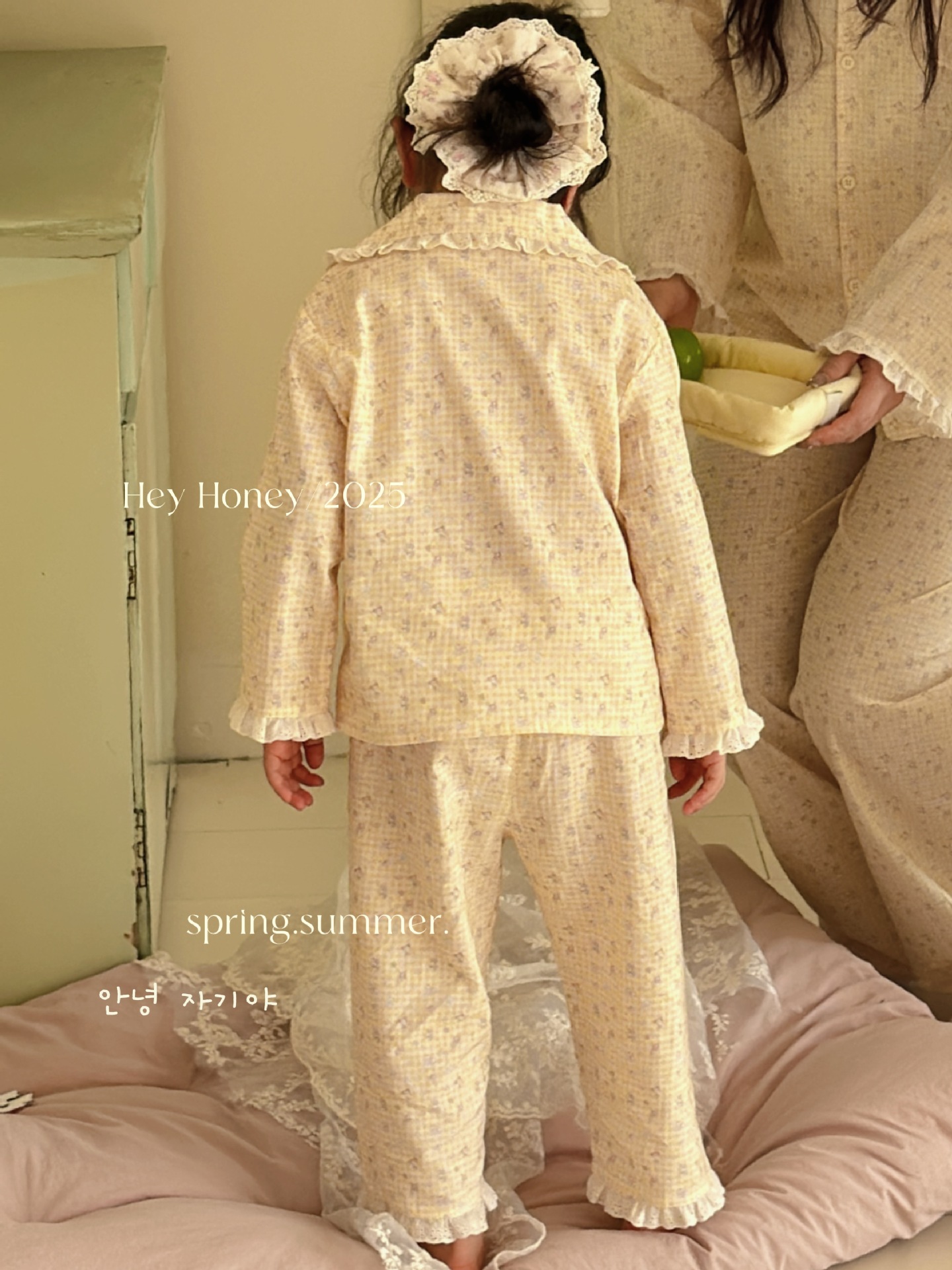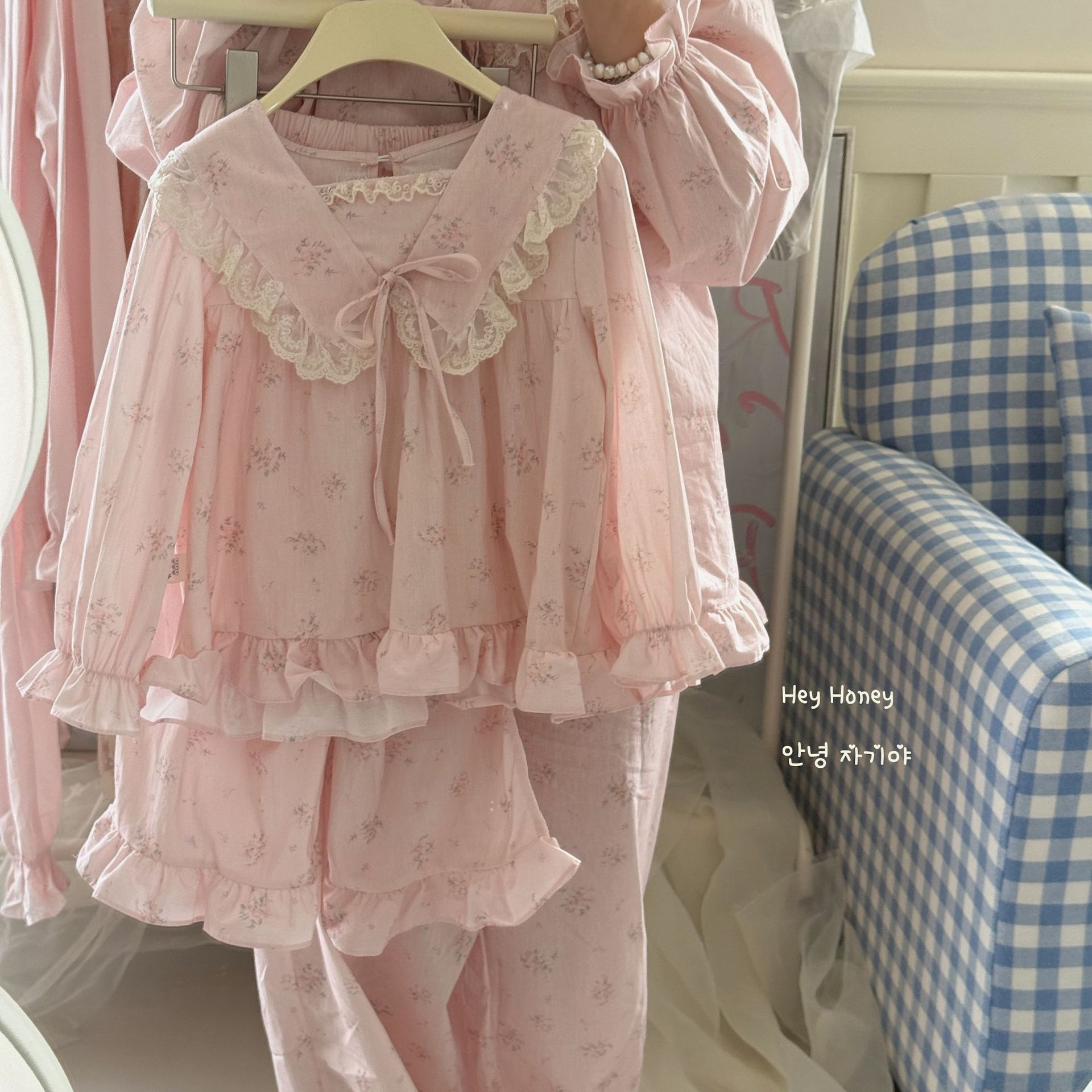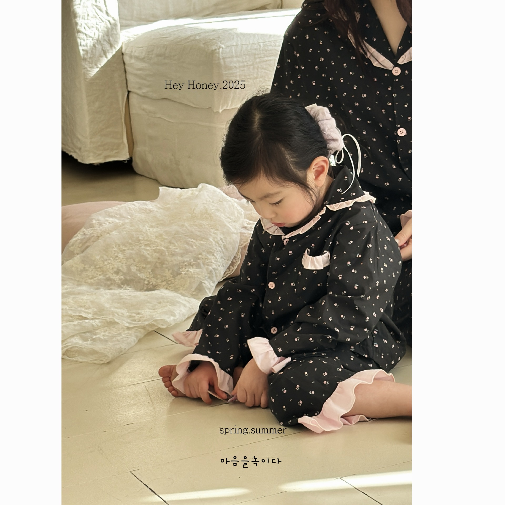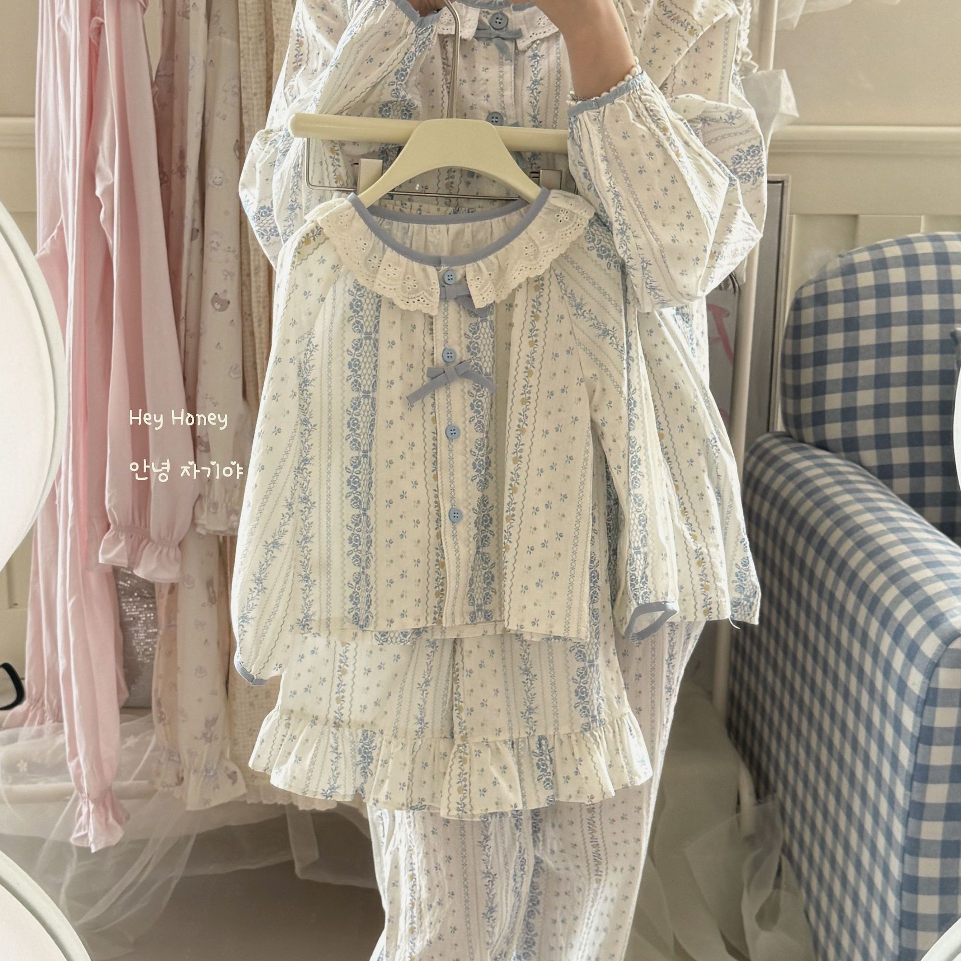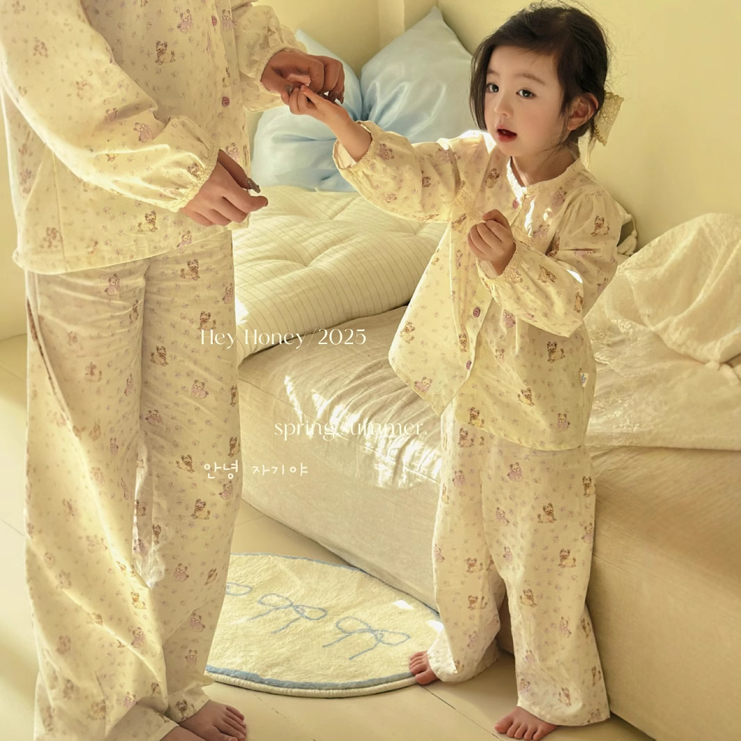 재고 있음 Hey Sweetheart 25 봄 얇은 크고 작은 볼륨 어린이 소녀 꽃 한국 싱글 브레스트 부모-자식 잠옷 홈웨어