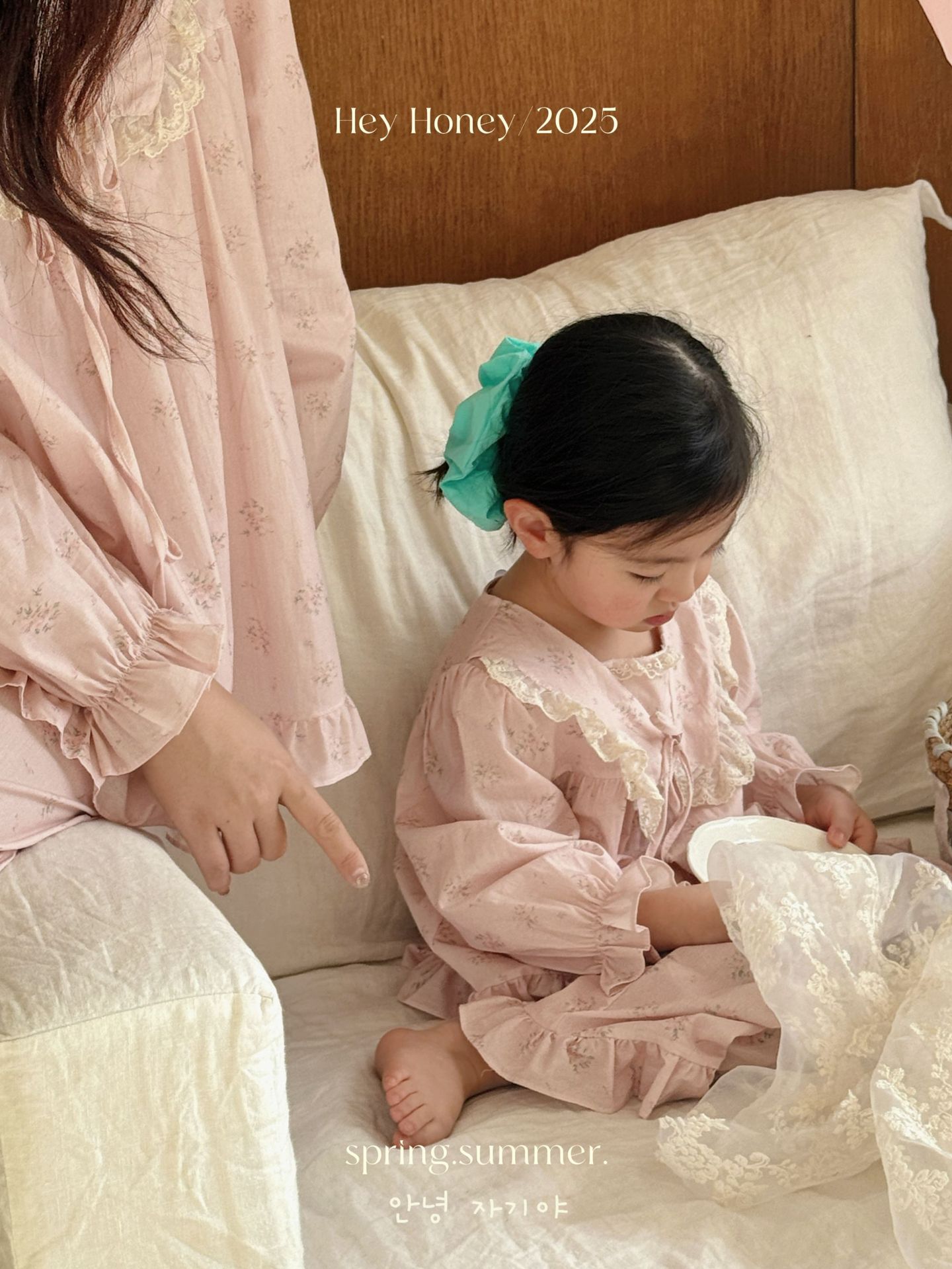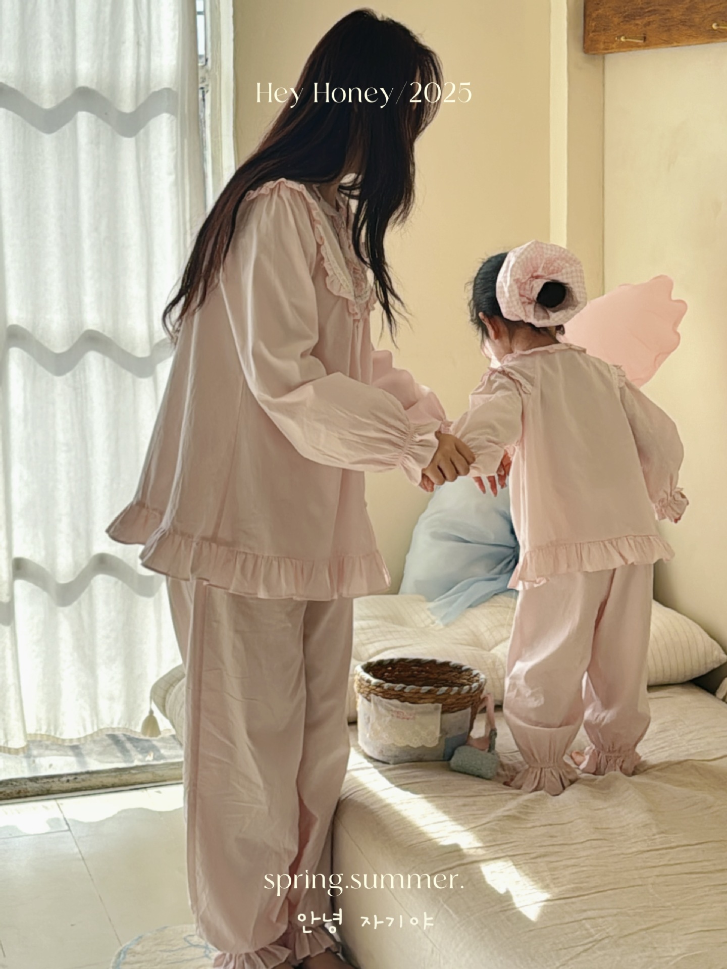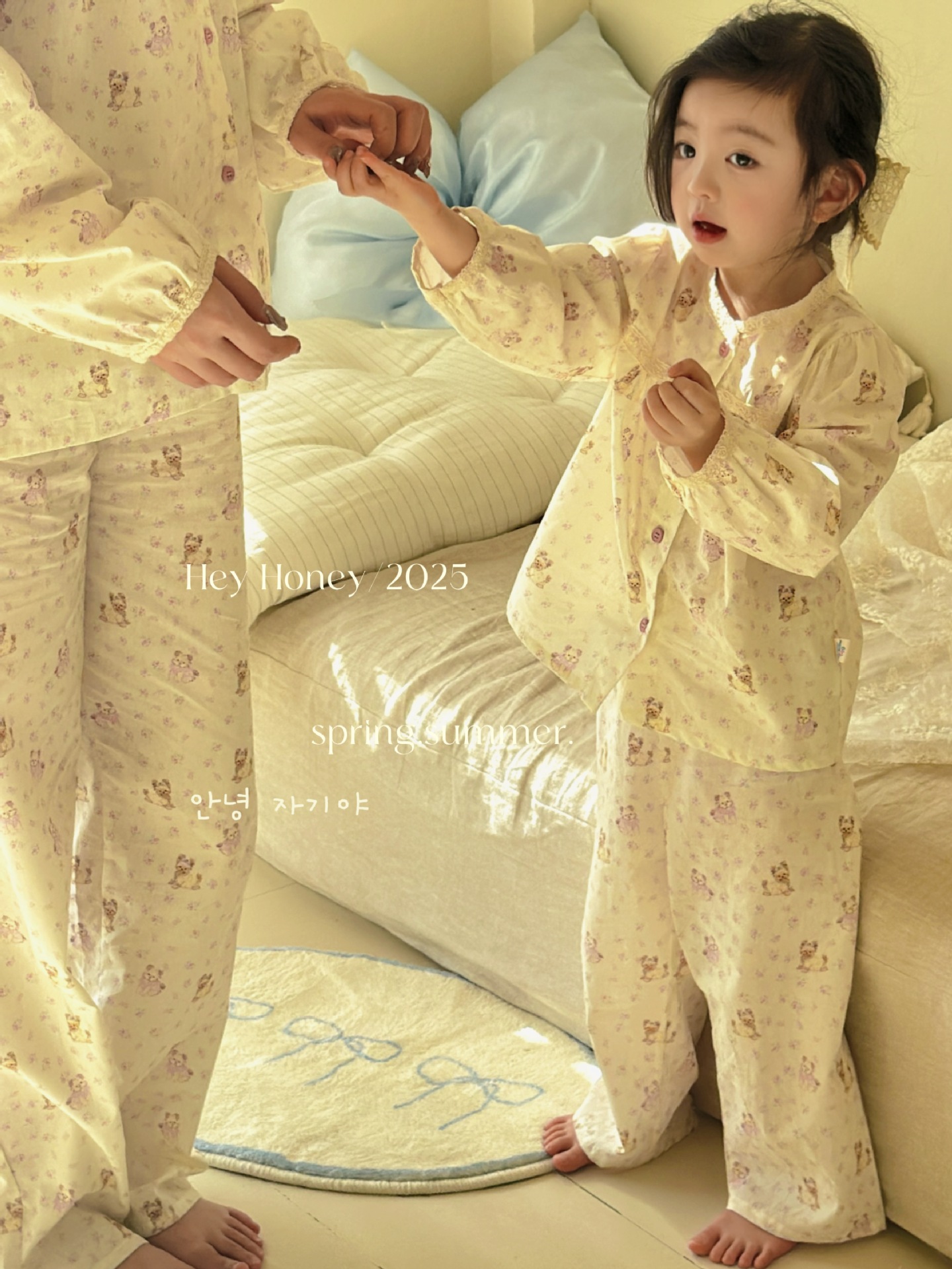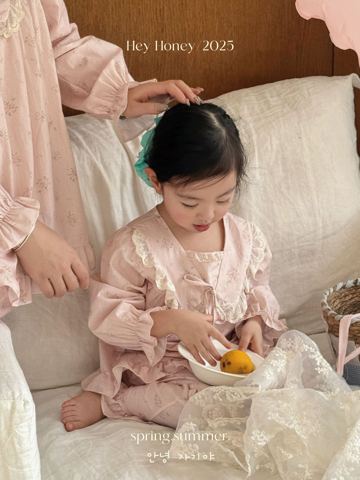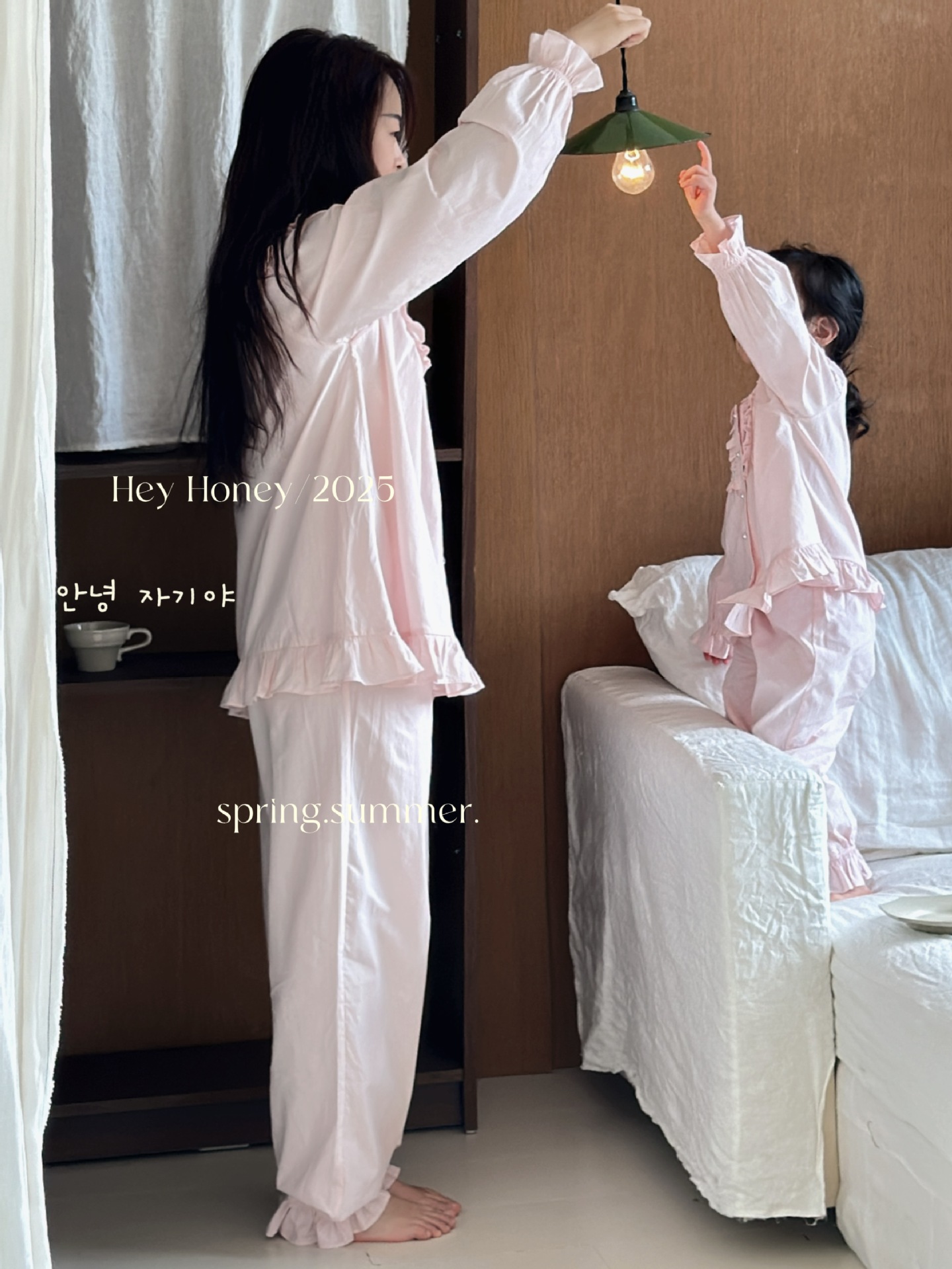 재고 있음 Hey Sweetheart 25 봄 얇은 크고 작은 볼륨 어린이 소녀 꽃 한국 싱글 브레스트 부모-자식 잠옷 홈웨어