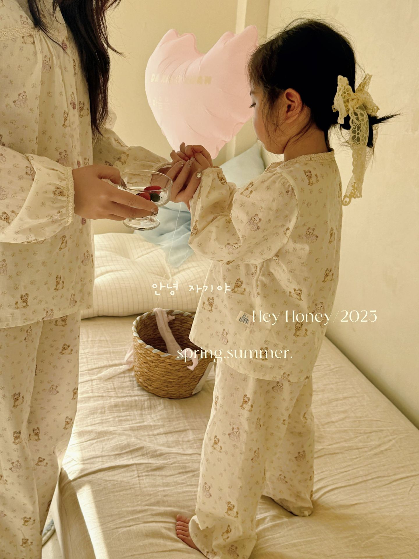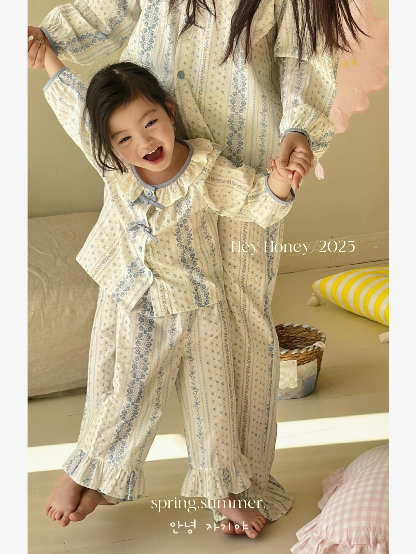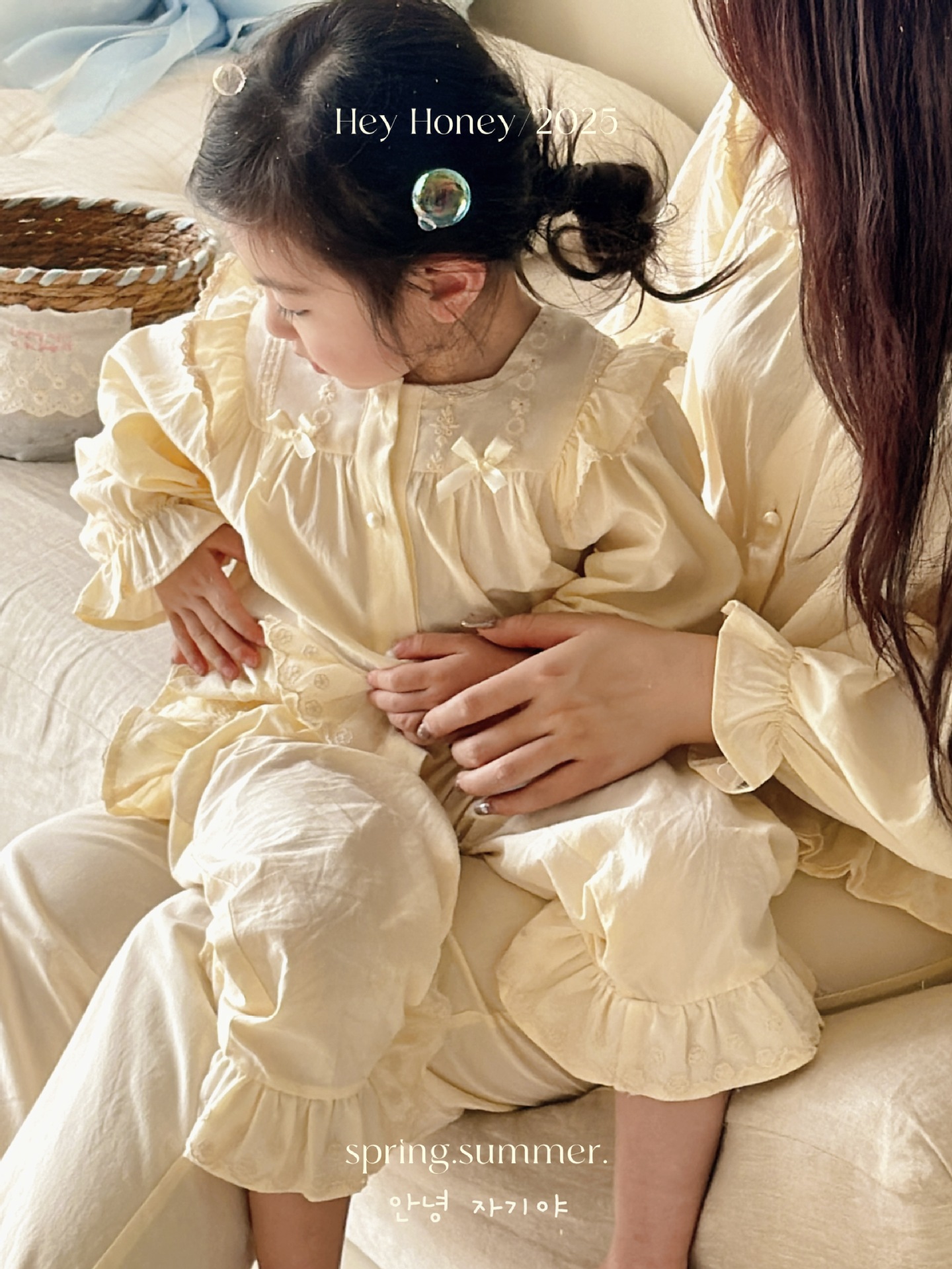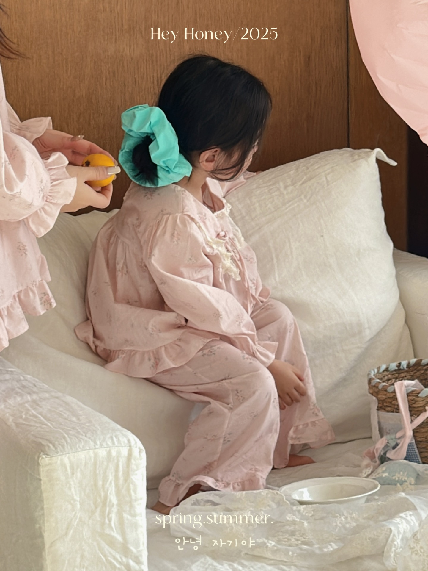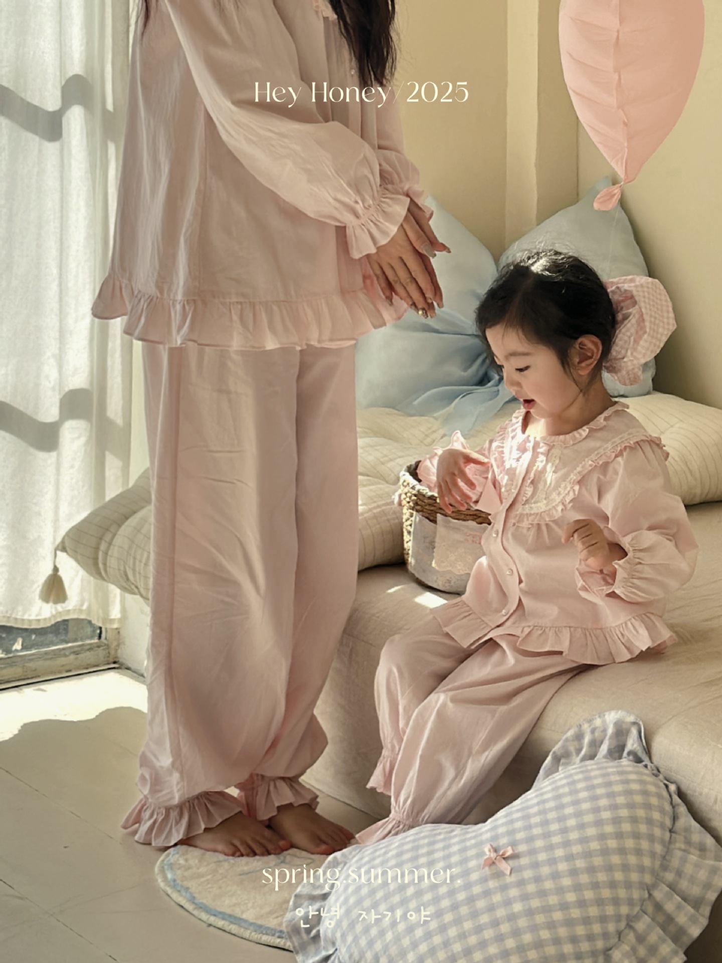재고 있음 Hey Sweetheart 25 봄 얇은 크고 작은 볼륨 어린이 소녀 꽃 한국 싱글 브레스트 부모-자식 잠옷 홈웨어