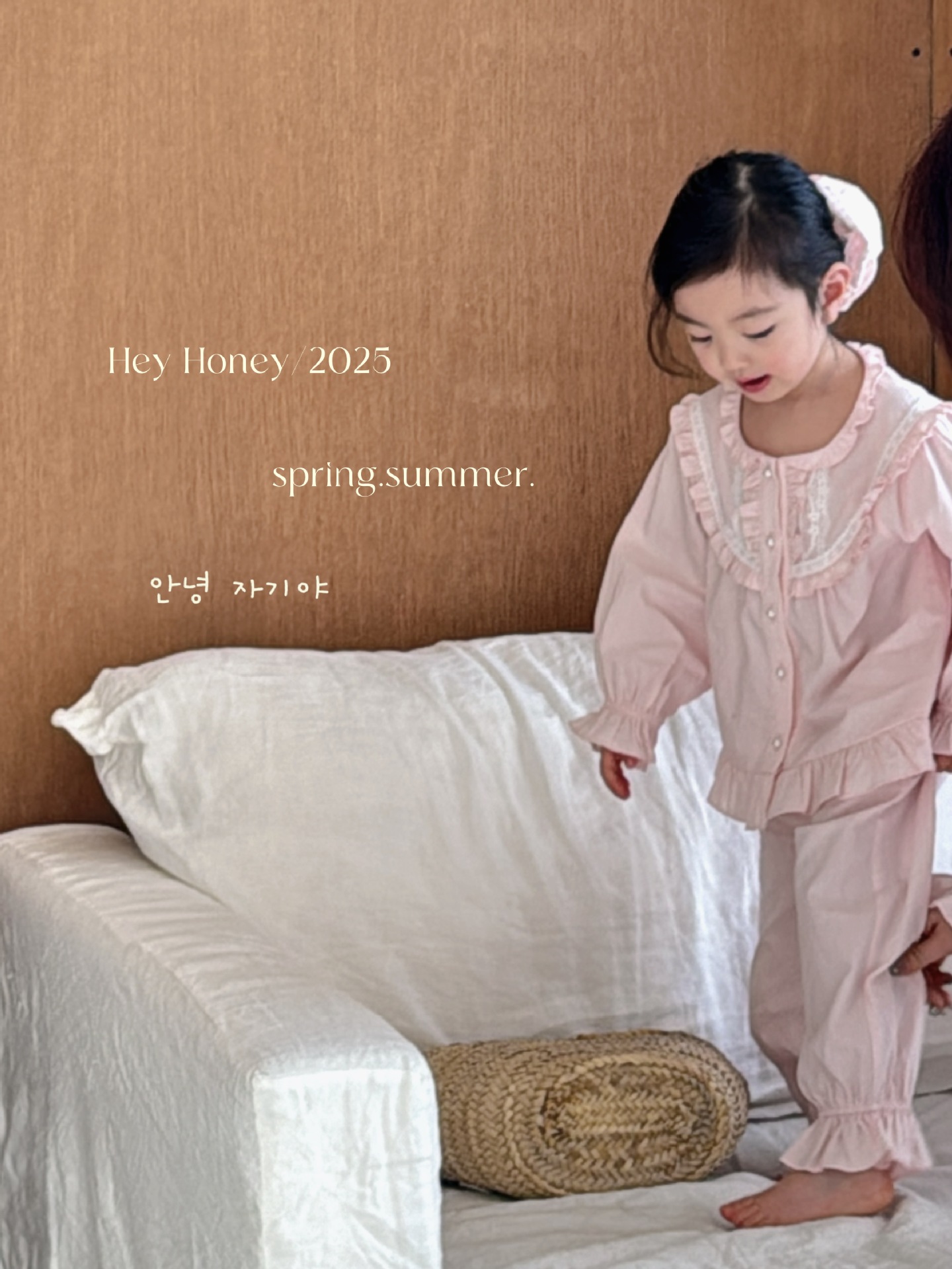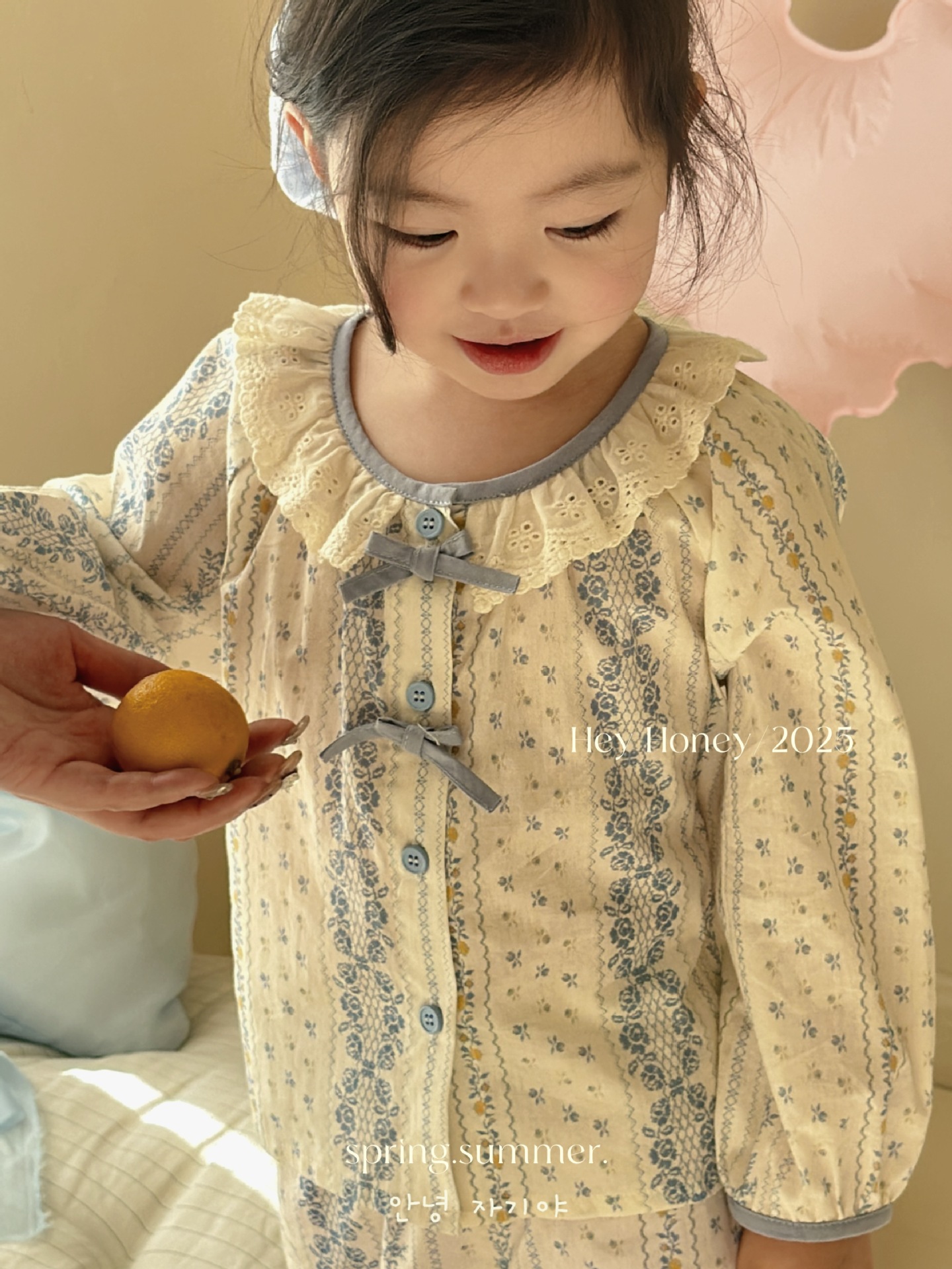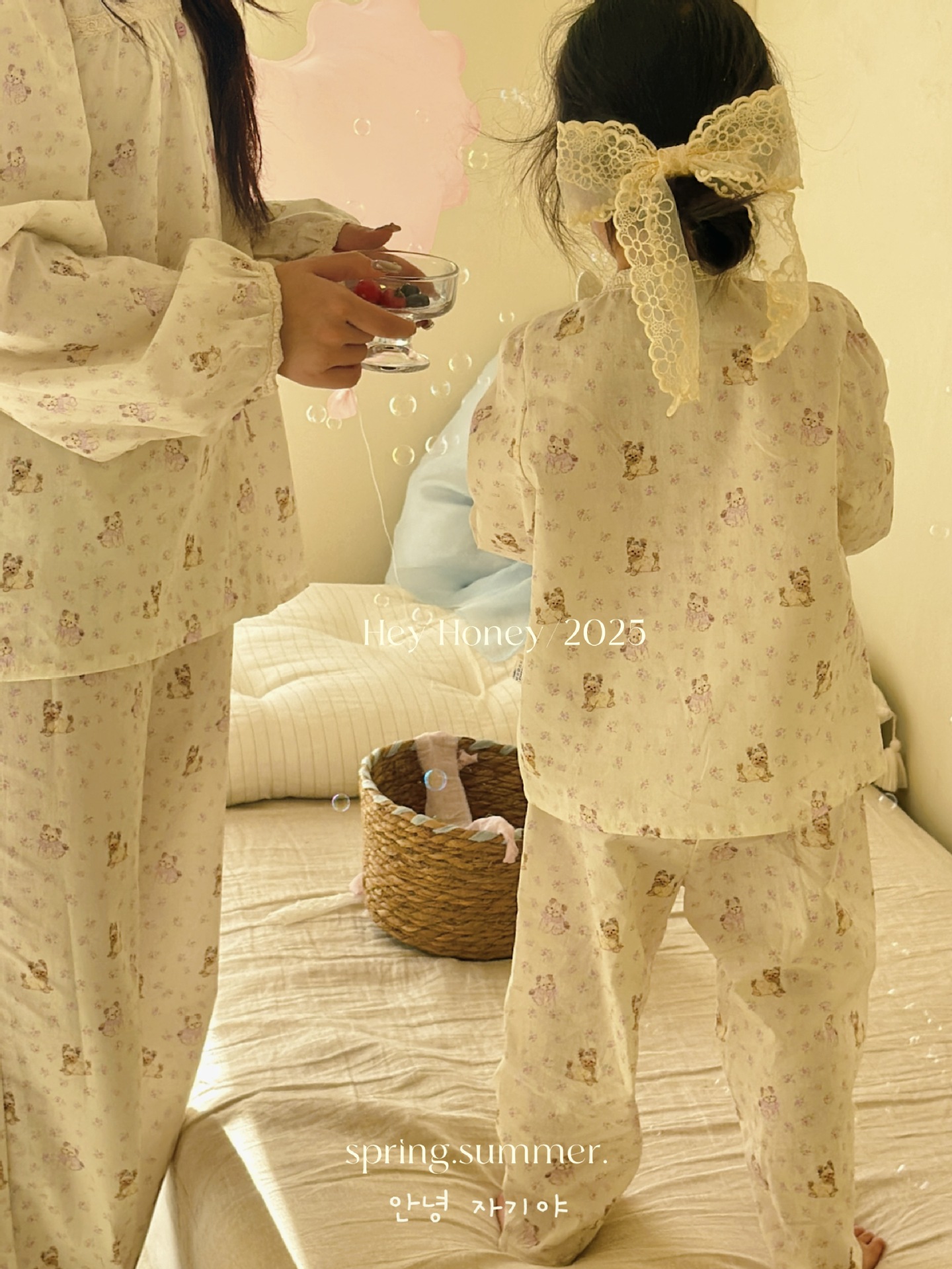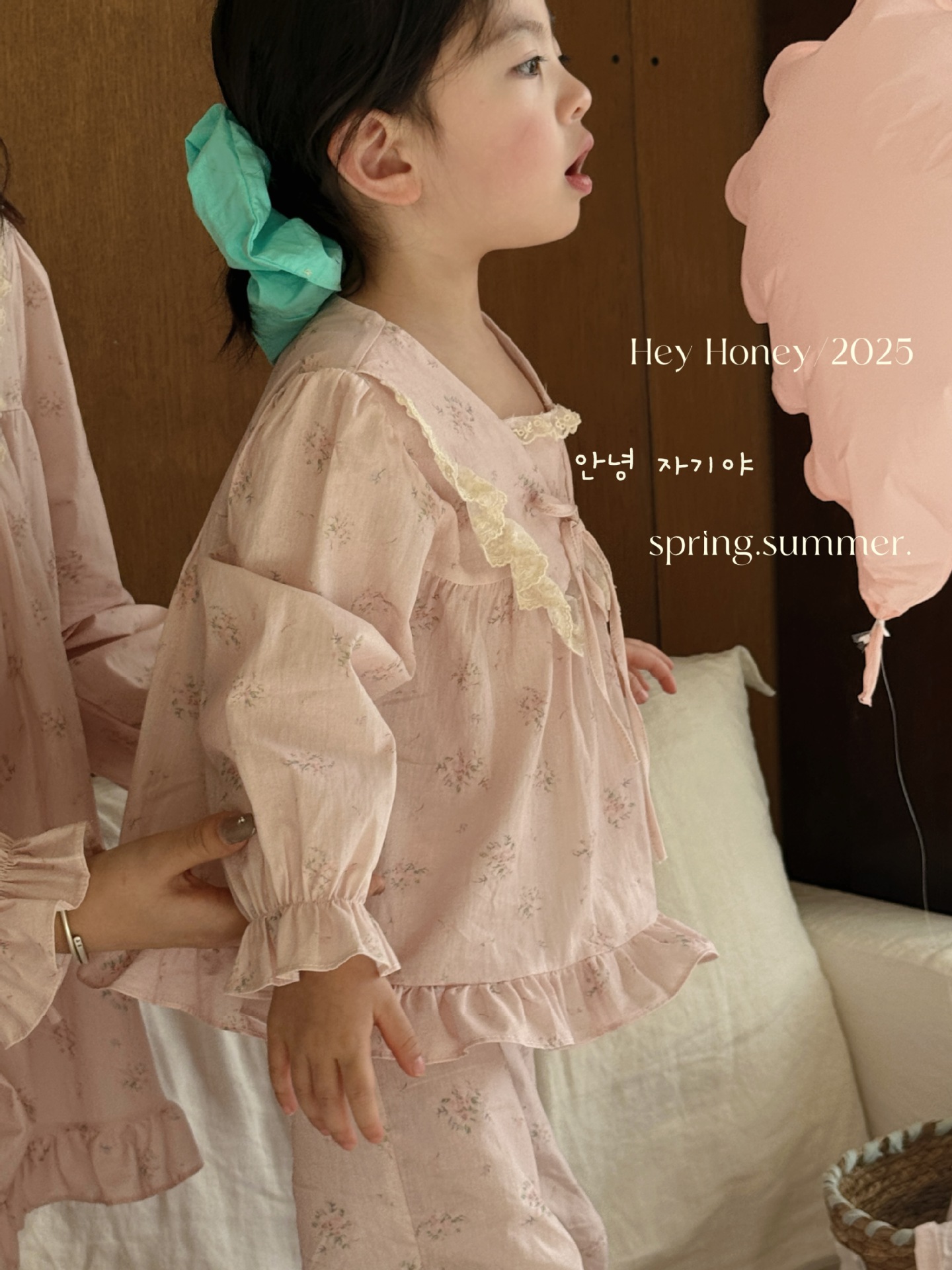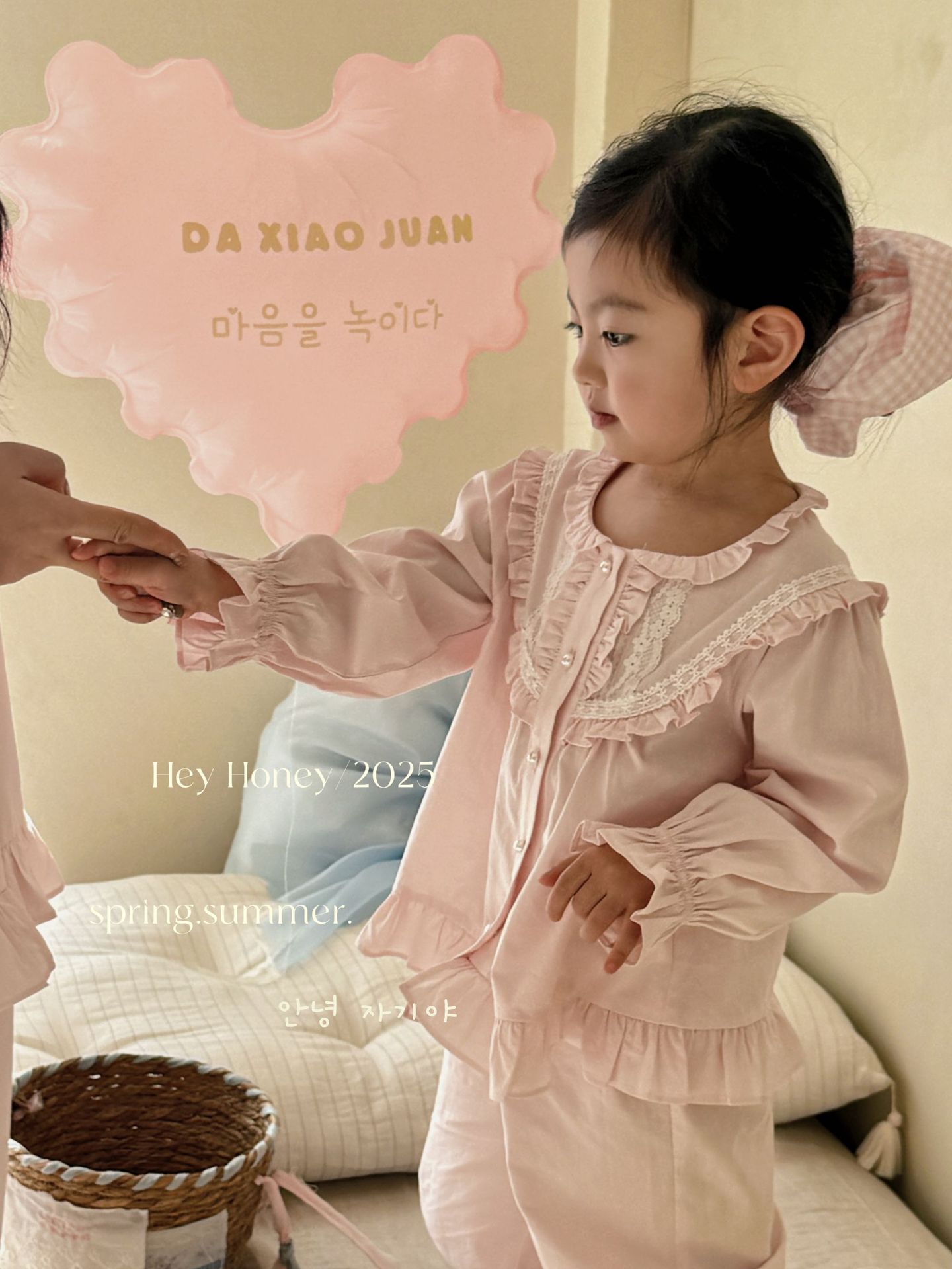 재고 있음 Hey Sweetheart 25 봄 얇은 크고 작은 볼륨 어린이 소녀 꽃 한국 싱글 브레스트 부모-자식 잠옷 홈웨어
