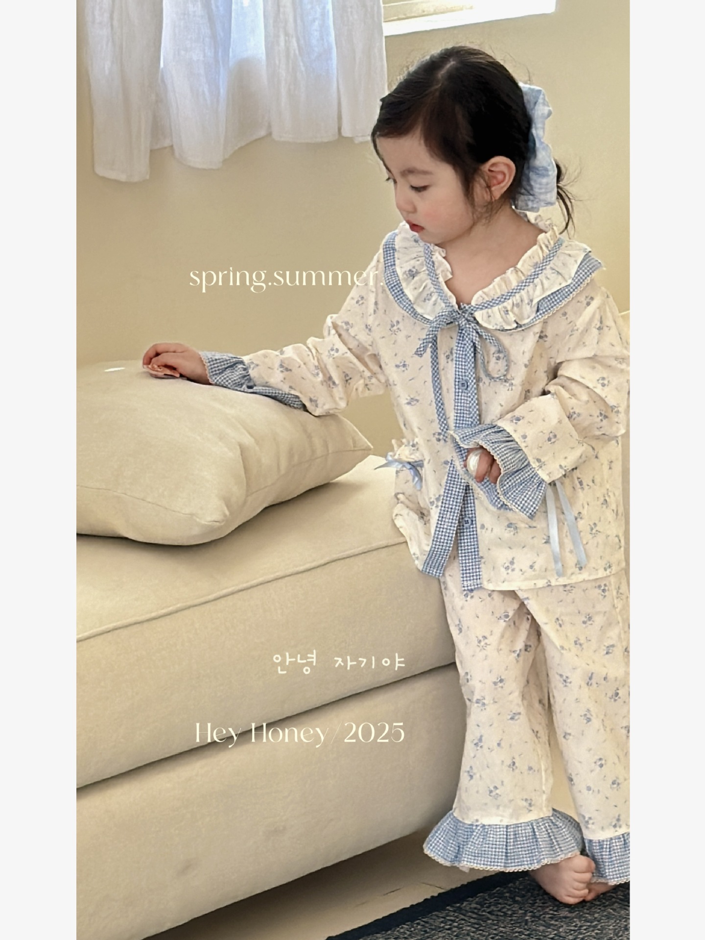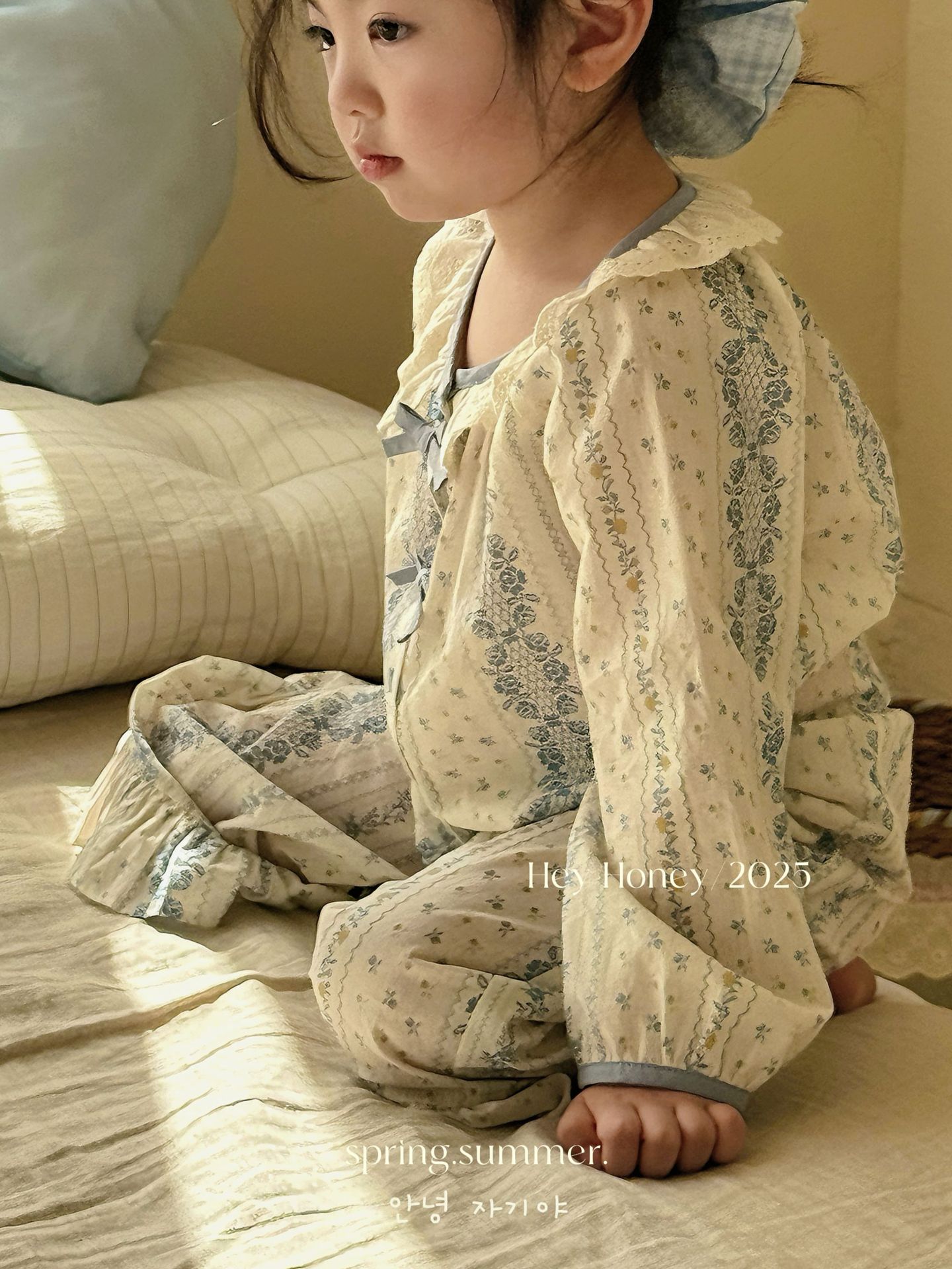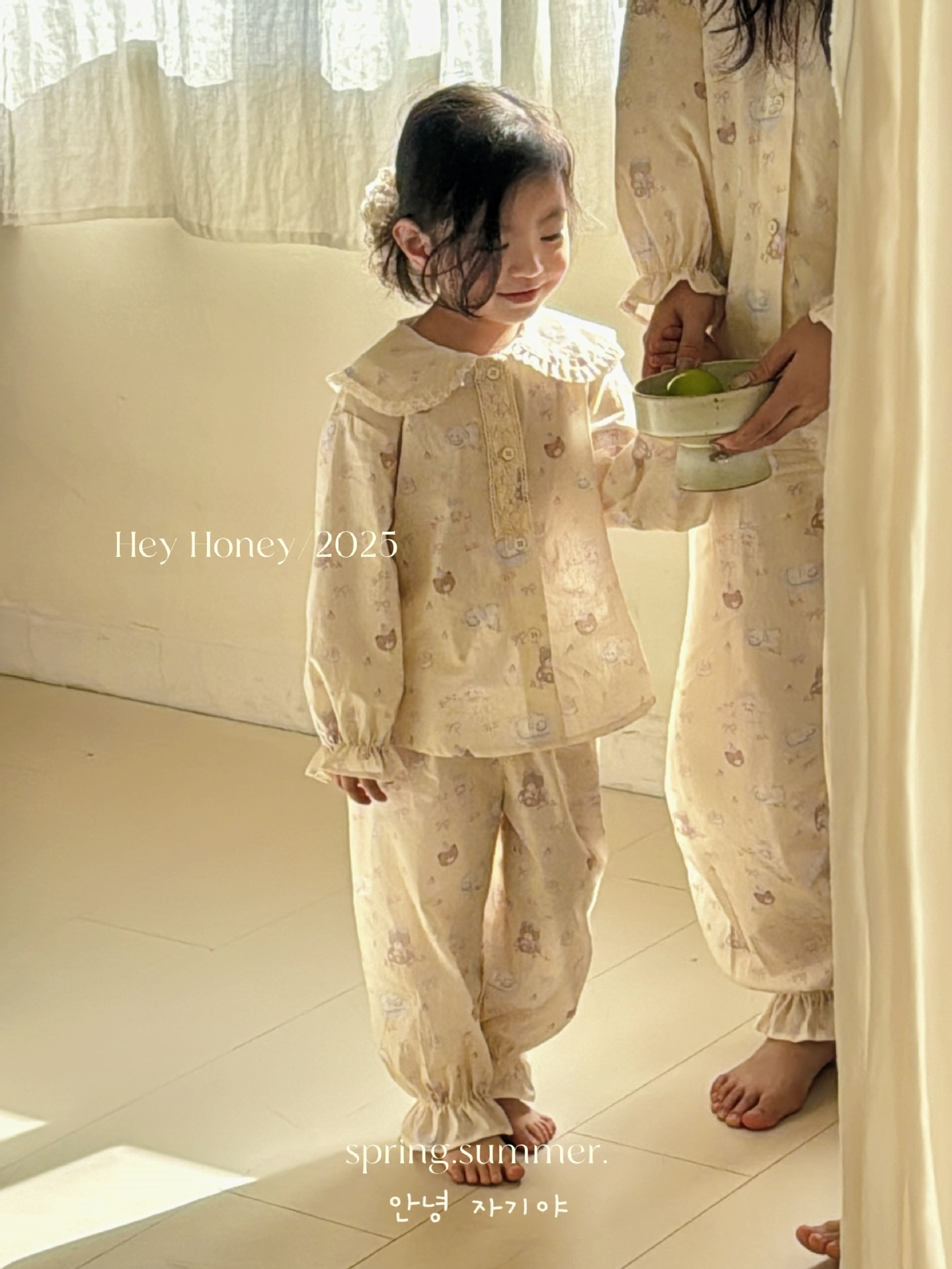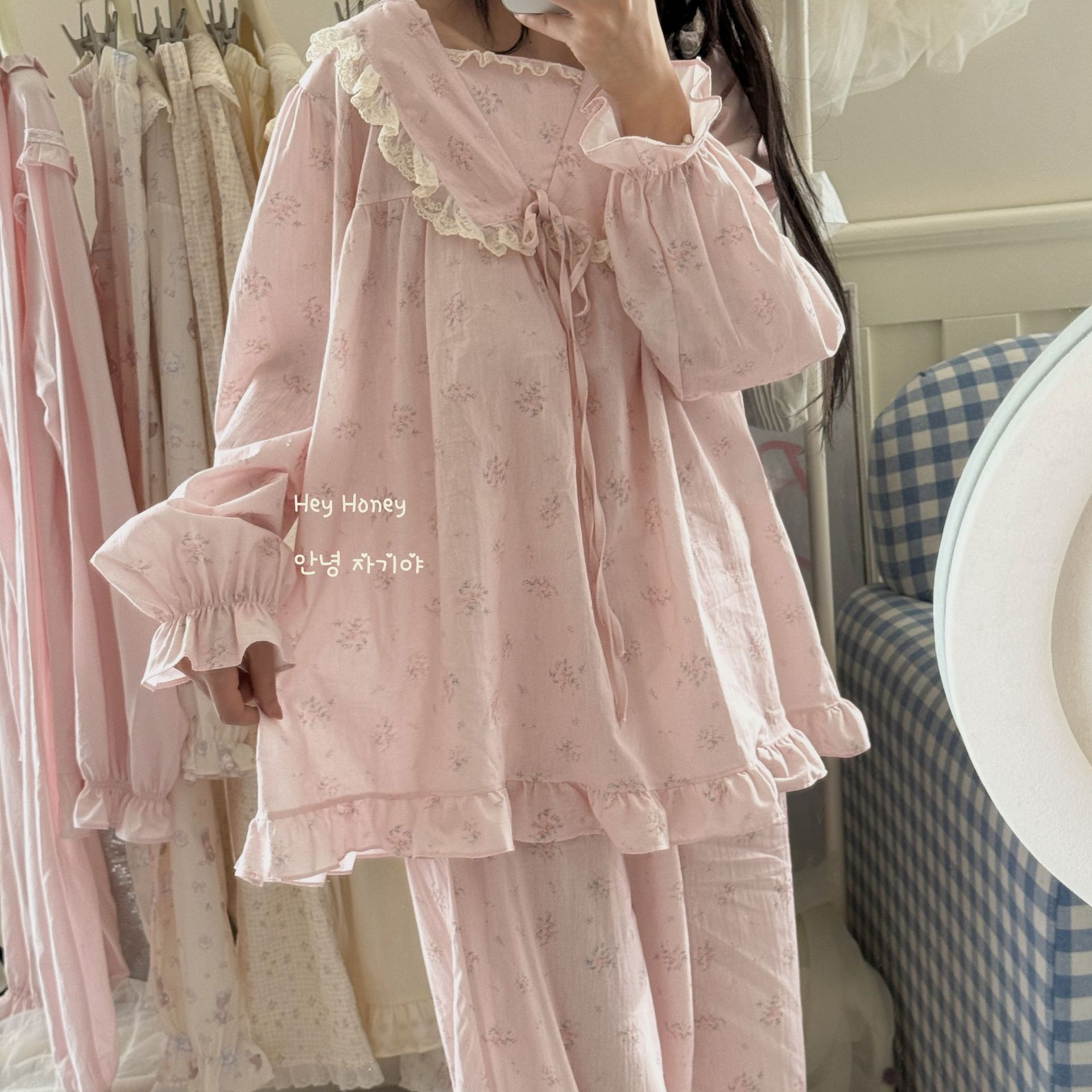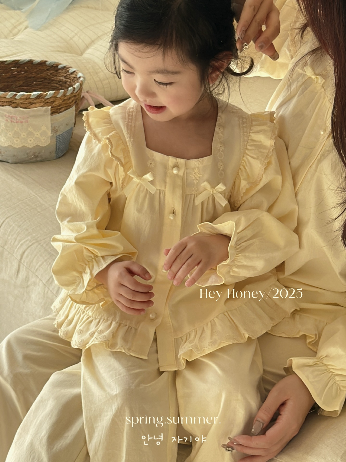 재고 있음 Hey Sweetheart 25 봄 얇은 크고 작은 볼륨 어린이 소녀 꽃 한국 싱글 브레스트 부모-자식 잠옷 홈웨어