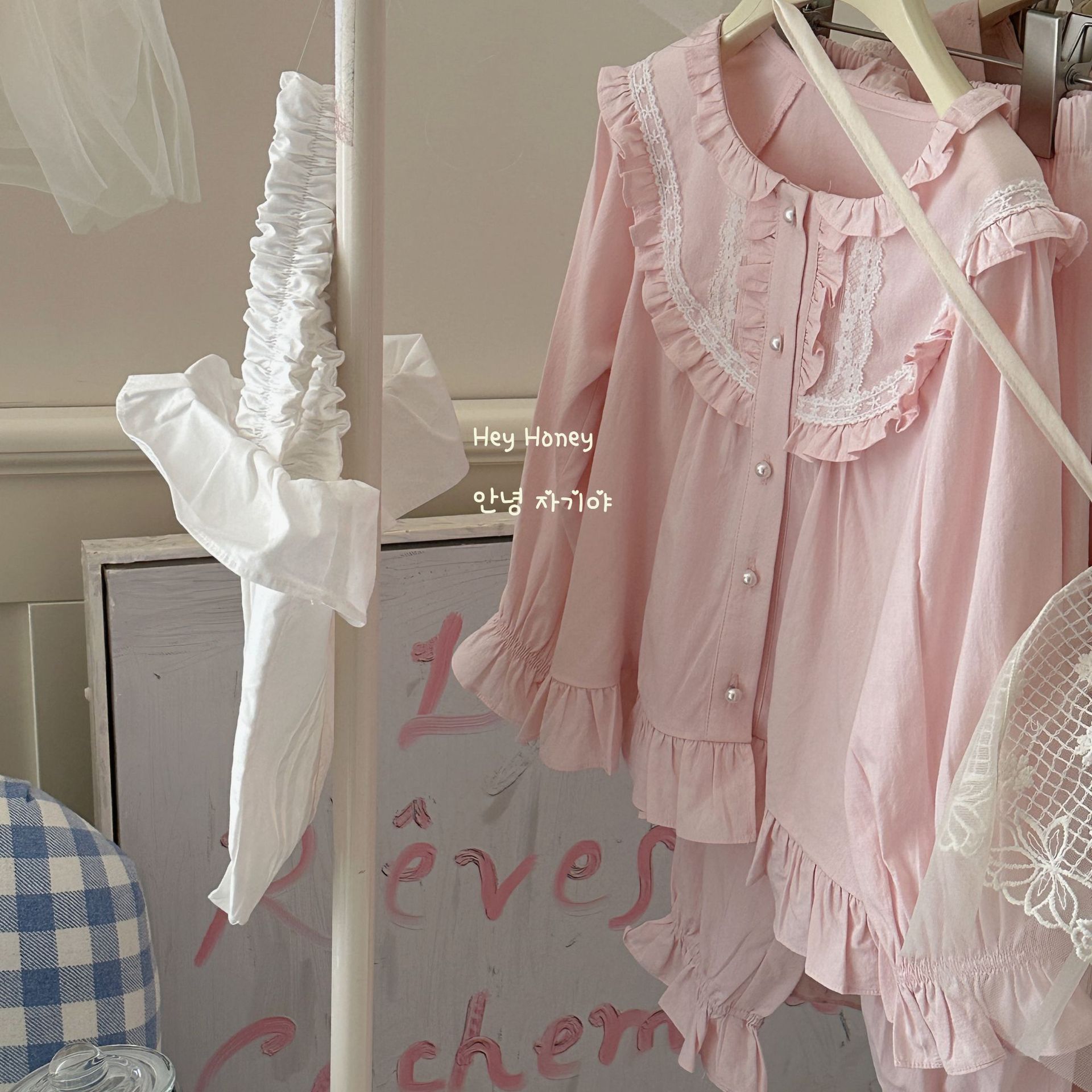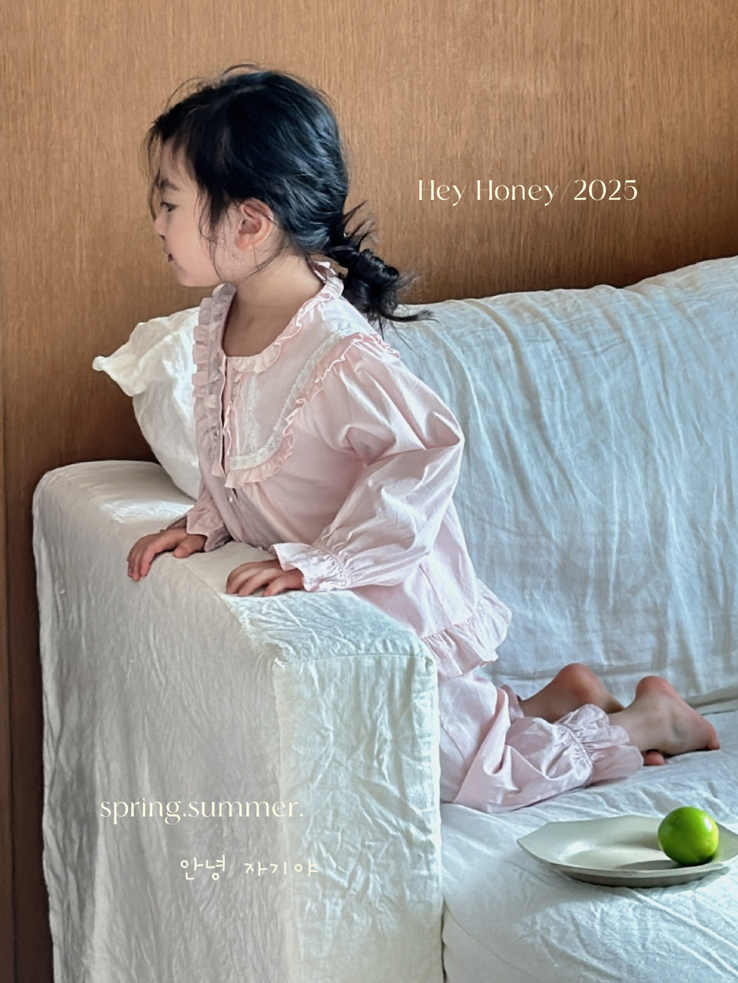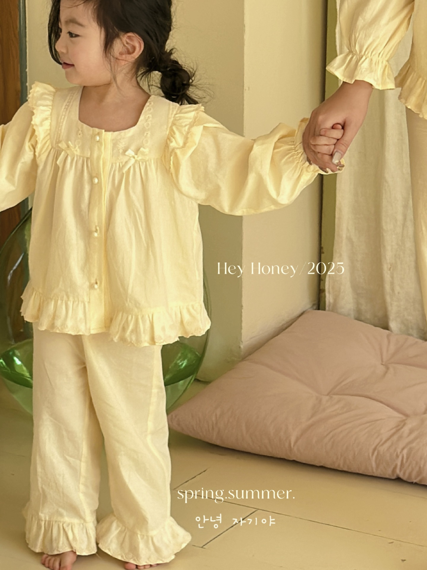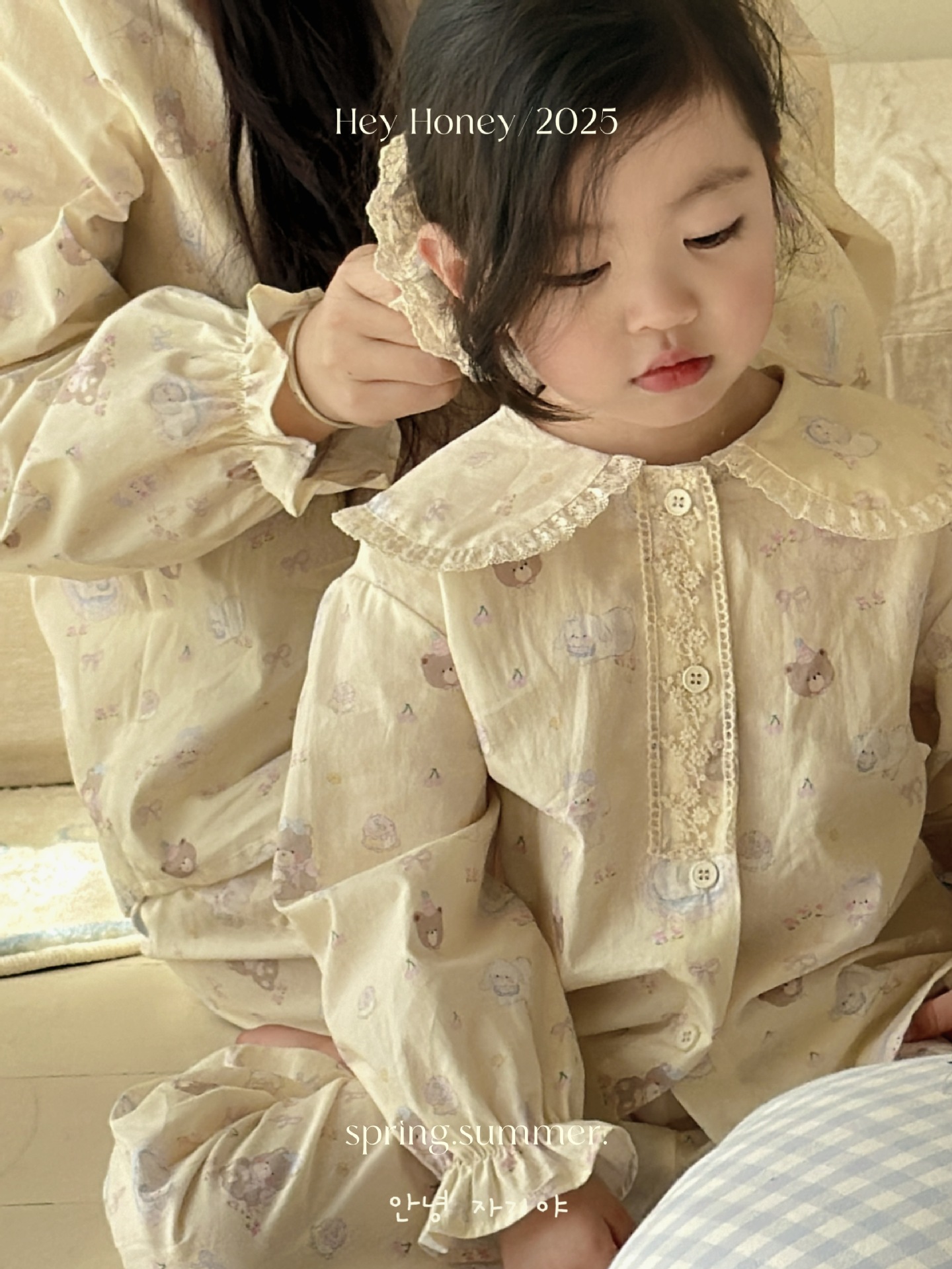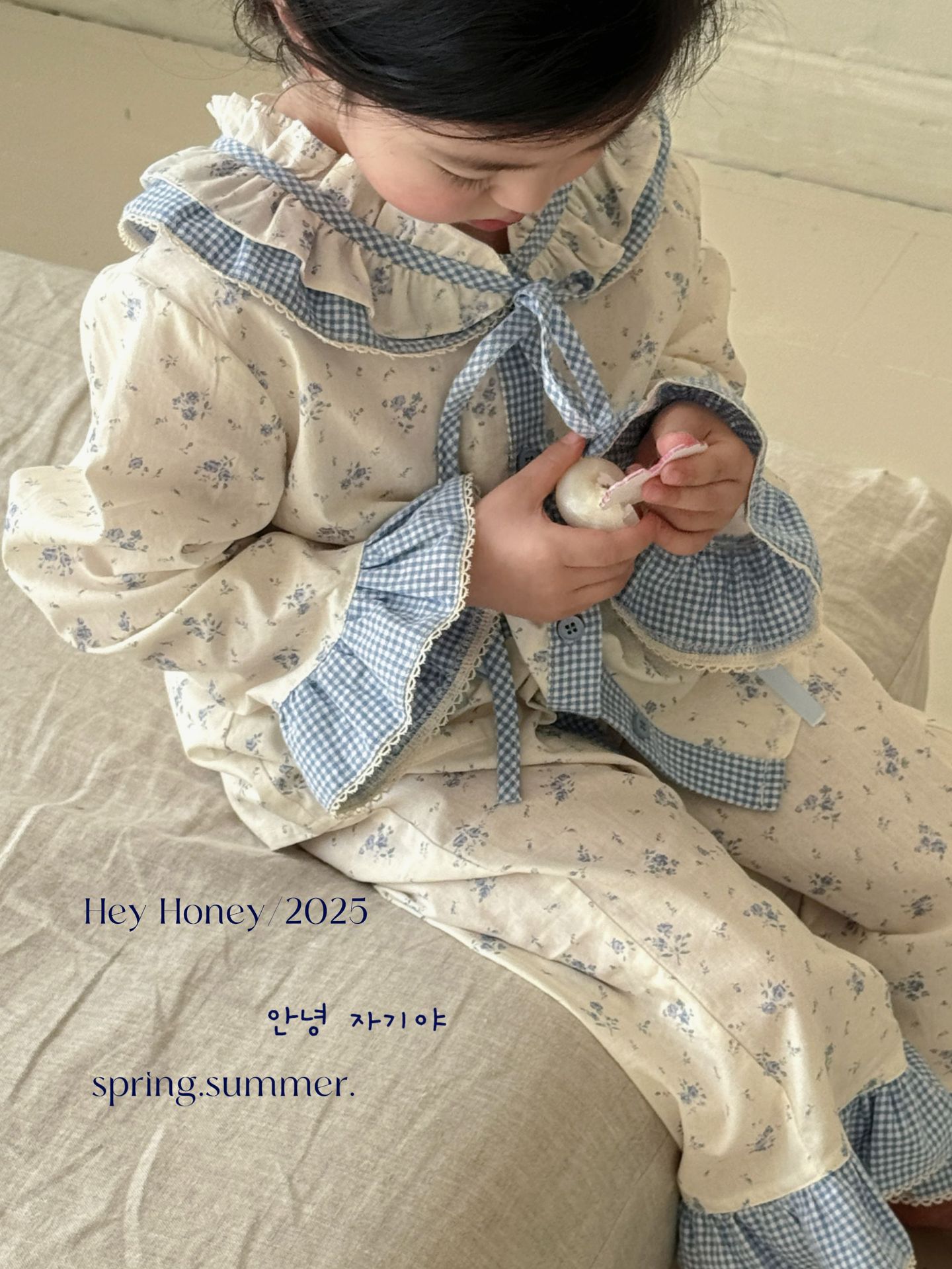 재고 있음 Hey Sweetheart 25 봄 얇은 크고 작은 볼륨 어린이 소녀 꽃 한국 싱글 브레스트 부모-자식 잠옷 홈웨어