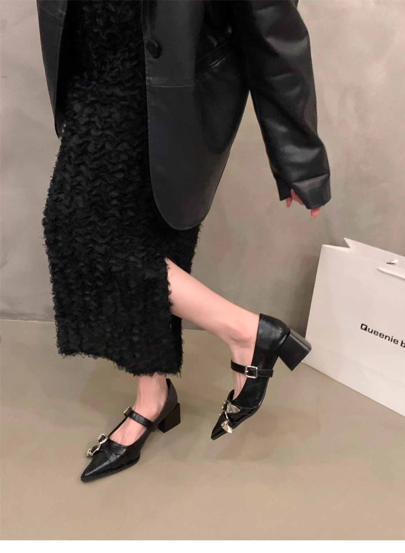 2025 여름 신상 뾰족코 메리제인 여성화 두꺼운 굽 단화 한국 스타일 캐주얼 단색 패션화 초극세사 안감