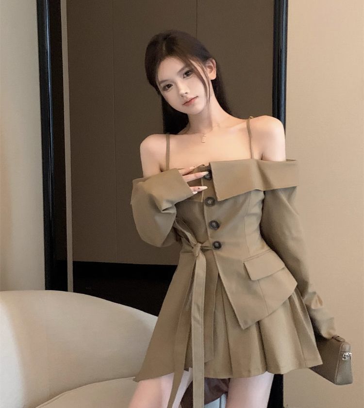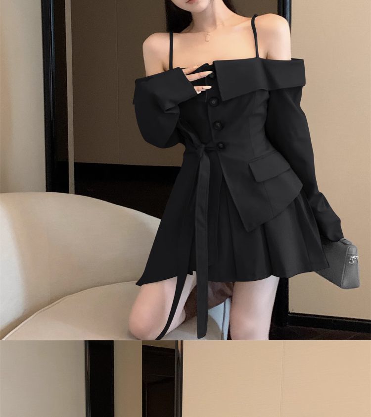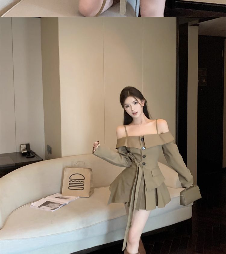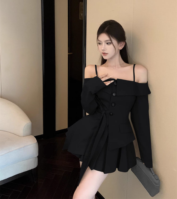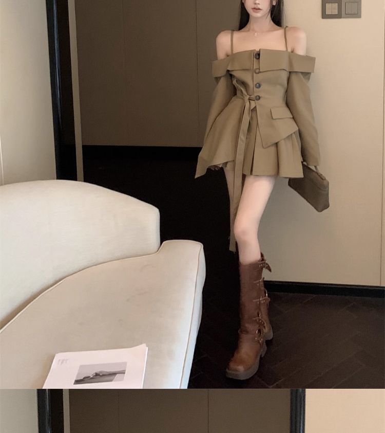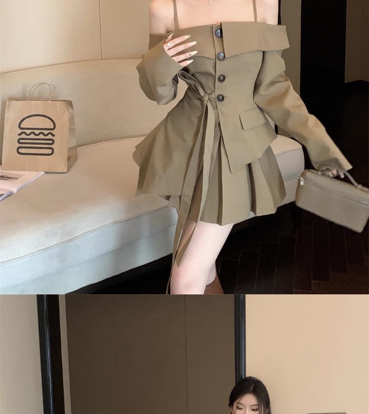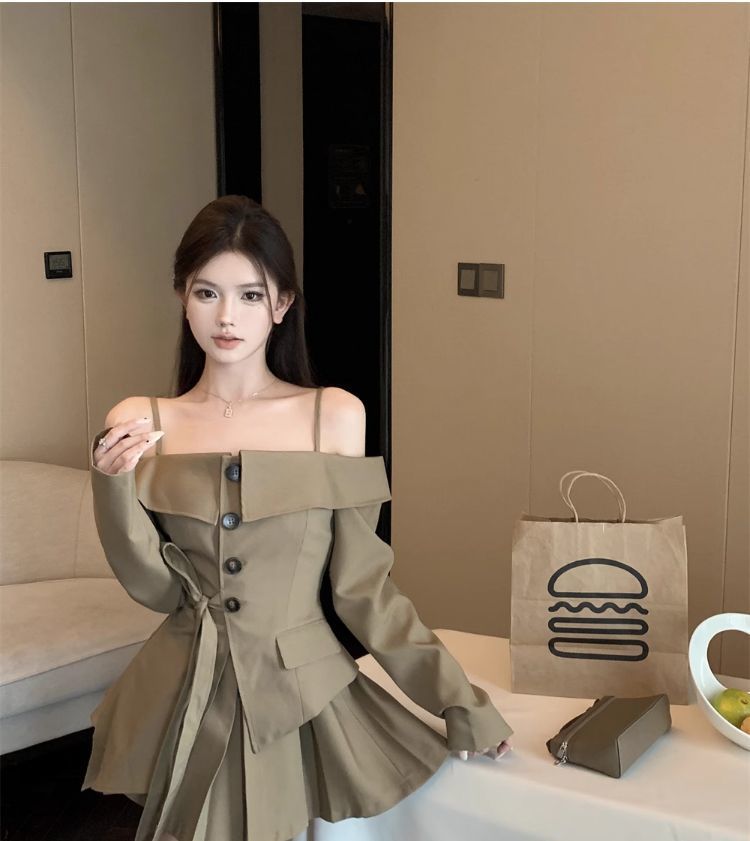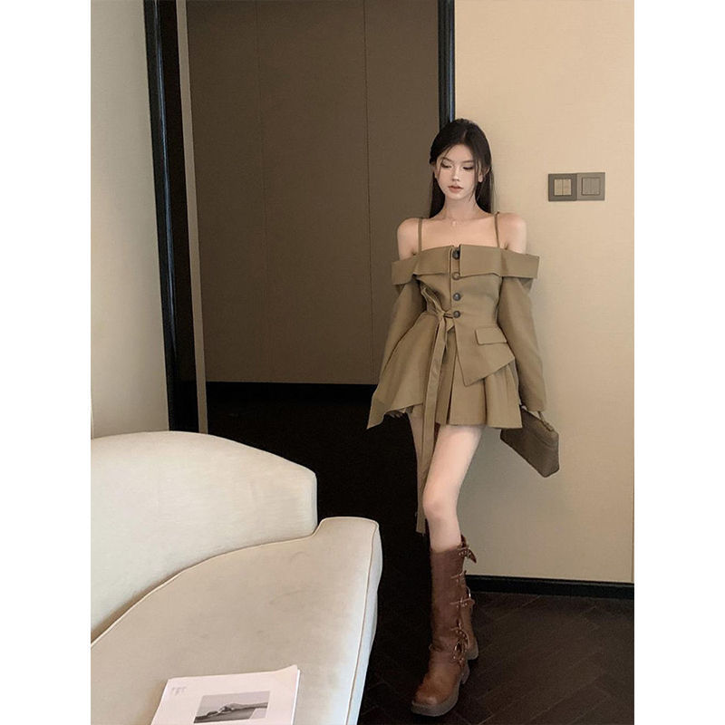 우아한 오프 숄더 불규칙한 긴팔 세트 재킷 여성의 봄과 가을 2025 새로운 주름 치마 투피스 세트스토어 가기