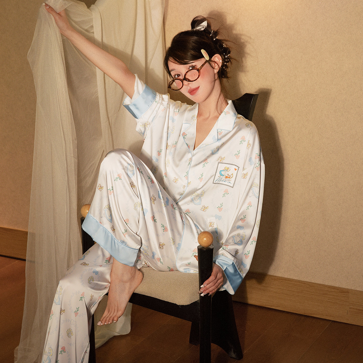 룬마 정품 합동 앨리스 봄과 여름 잠옷 여성용 긴 소매 소프트 아이스 실크 홈 의류 카디건 세트