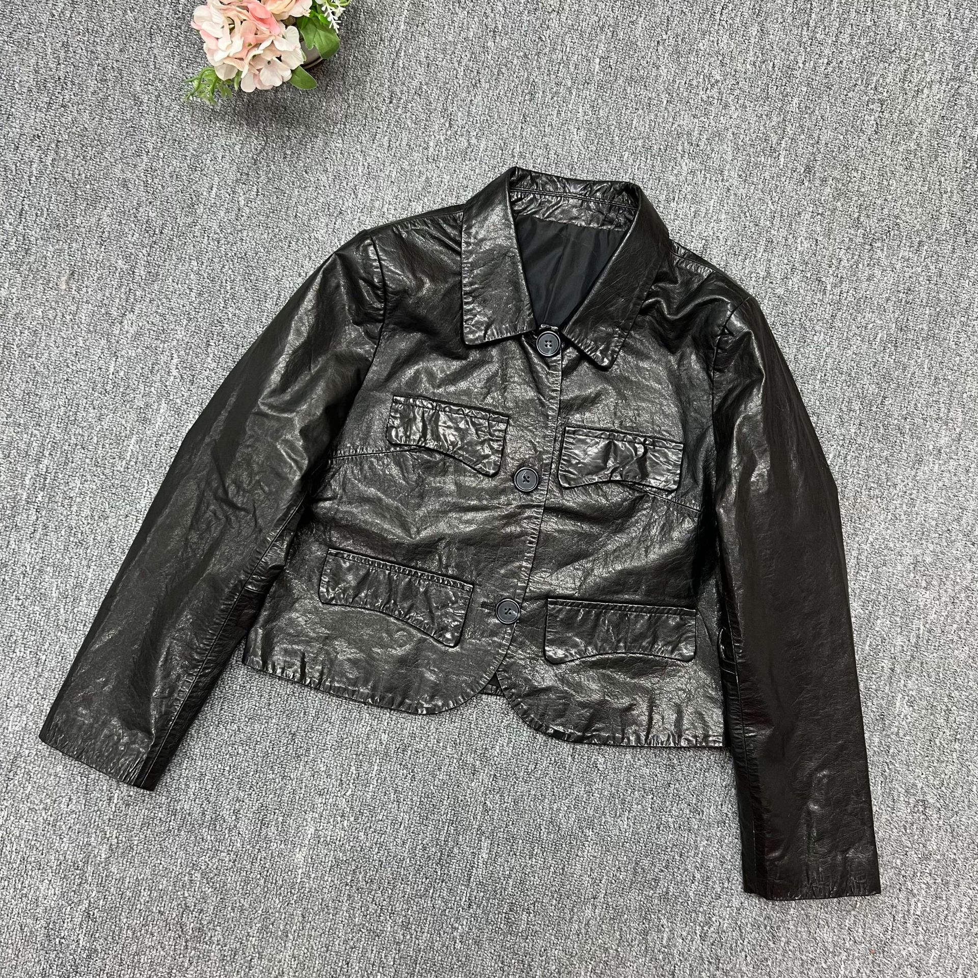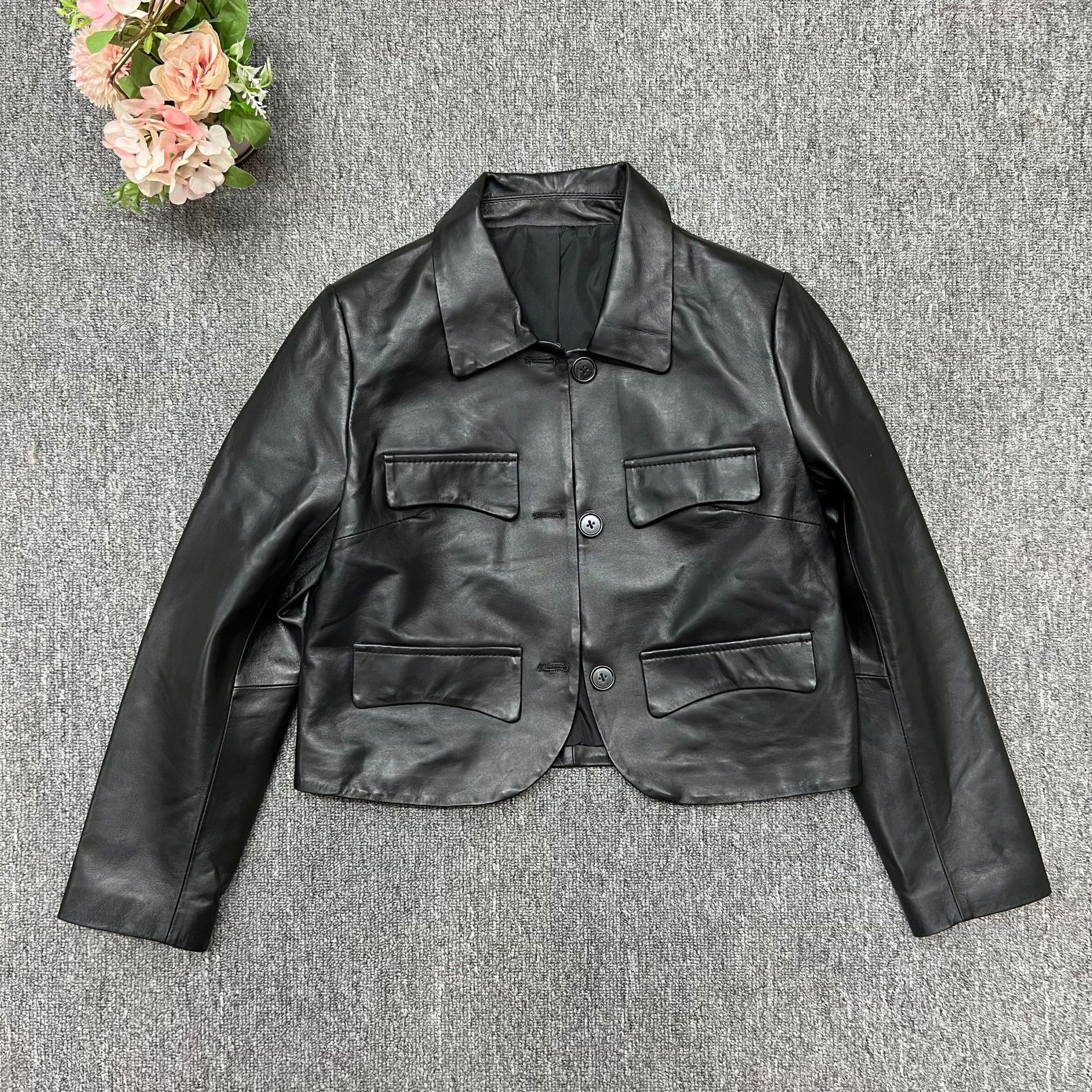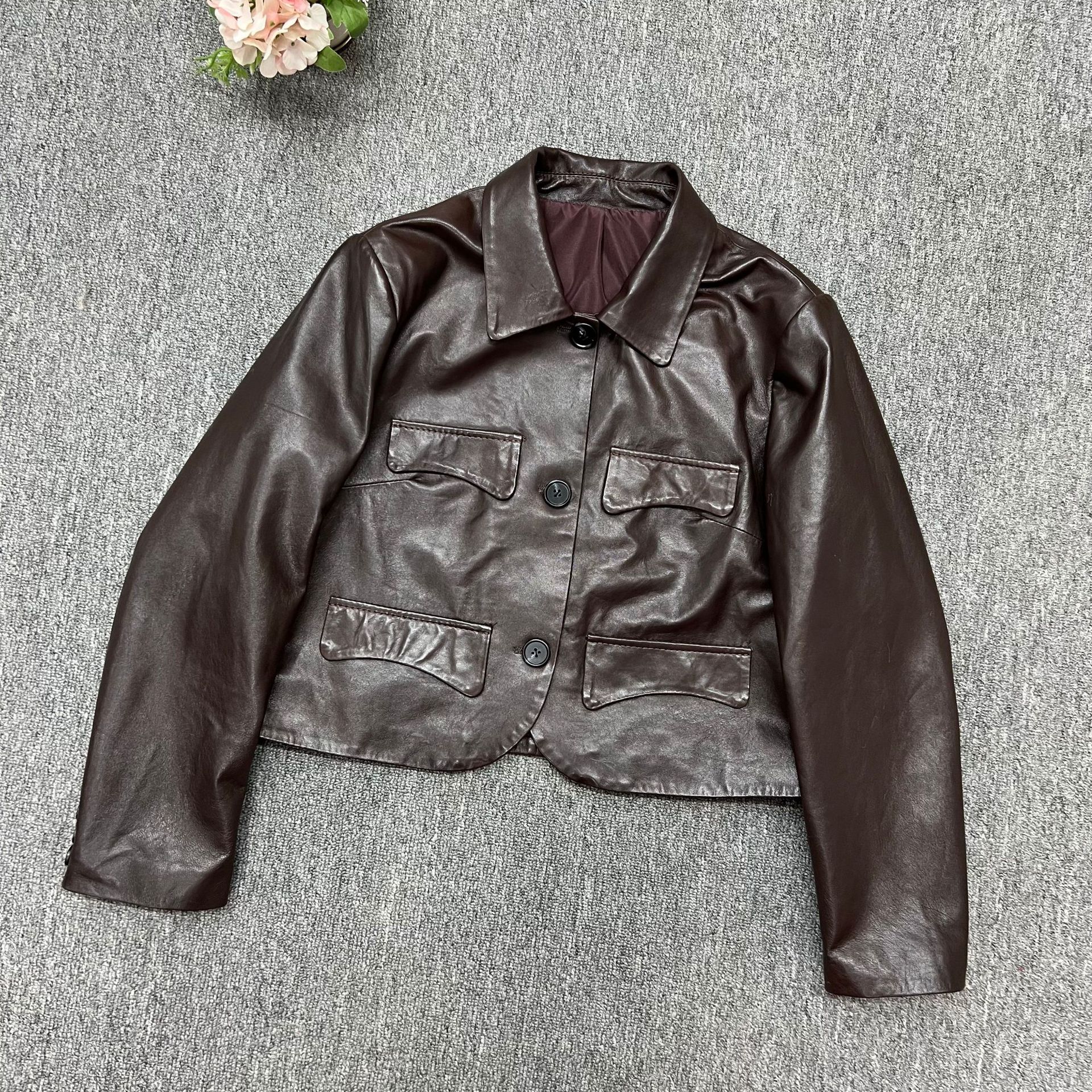 2025 봄 새로운 야채 탄화 가죽 여성용 옷깃 올 매치 솔리드 컬러 양가죽 자켓 짧은 패션 재킷 트렌디스토어 가기