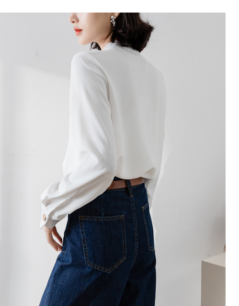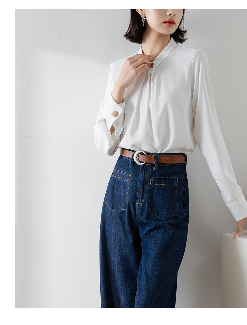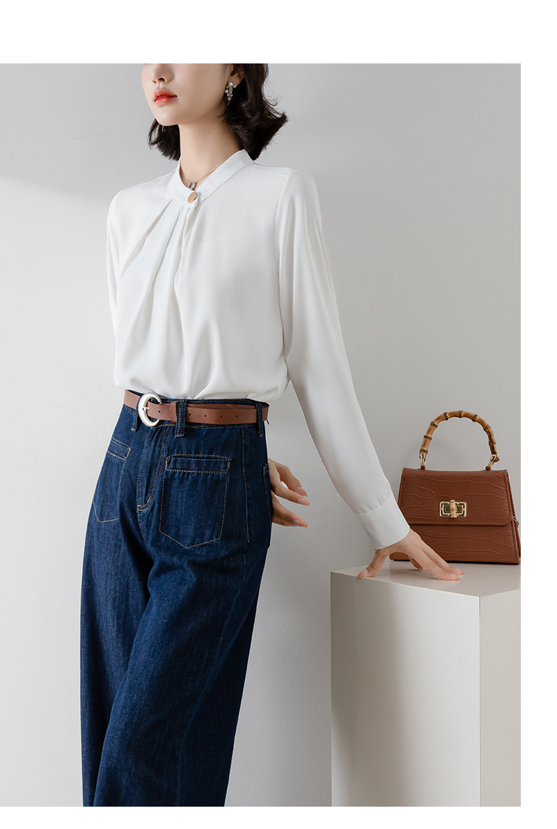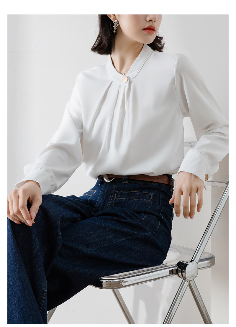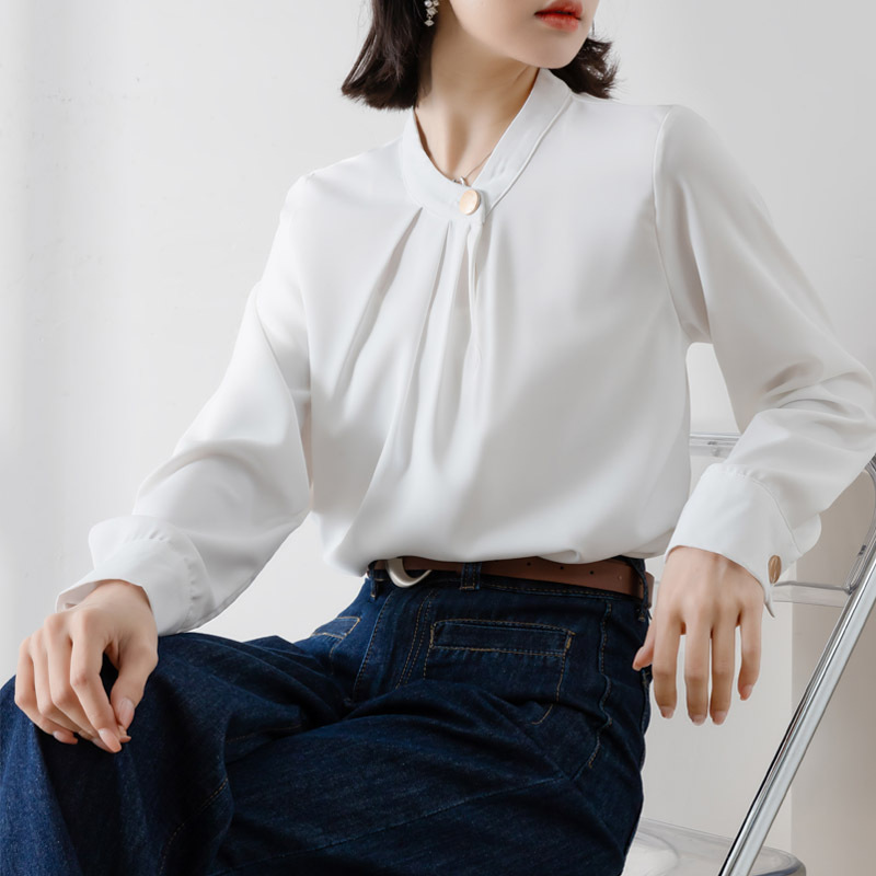 2025년 봄/가을 신상품 원버튼 스탠드 칼라 고급 새틴 주름방지 화이트 셔츠, 프로페셔널 OL 쉬폰 셔츠스토어 가기