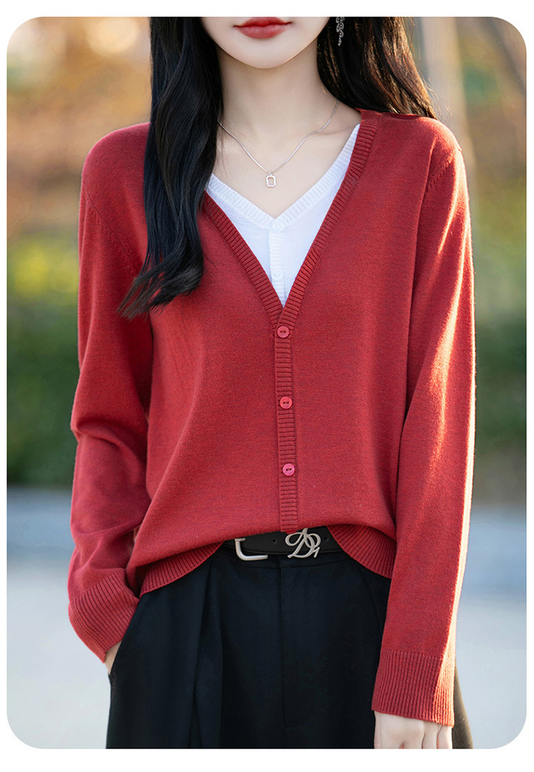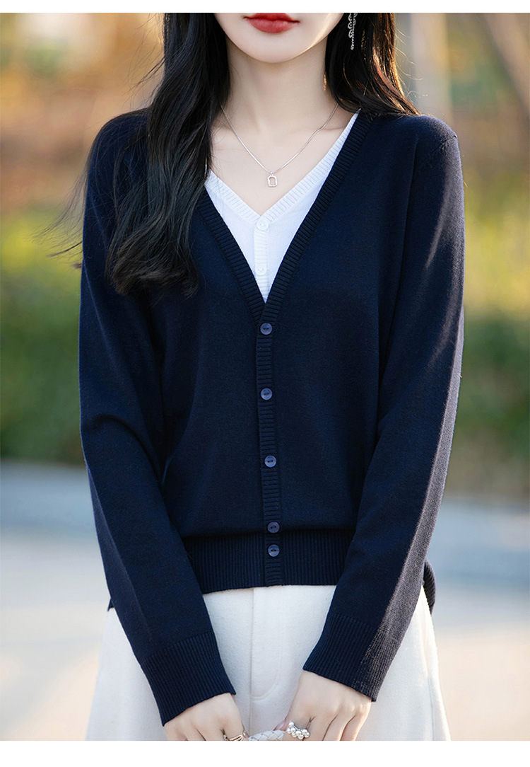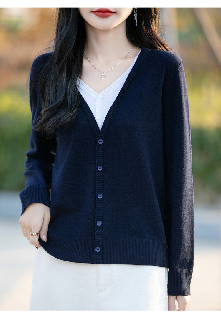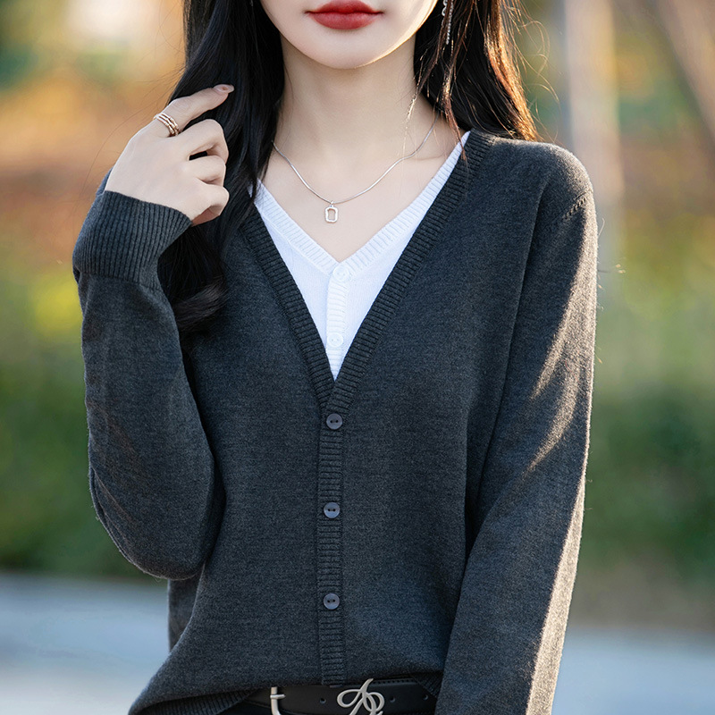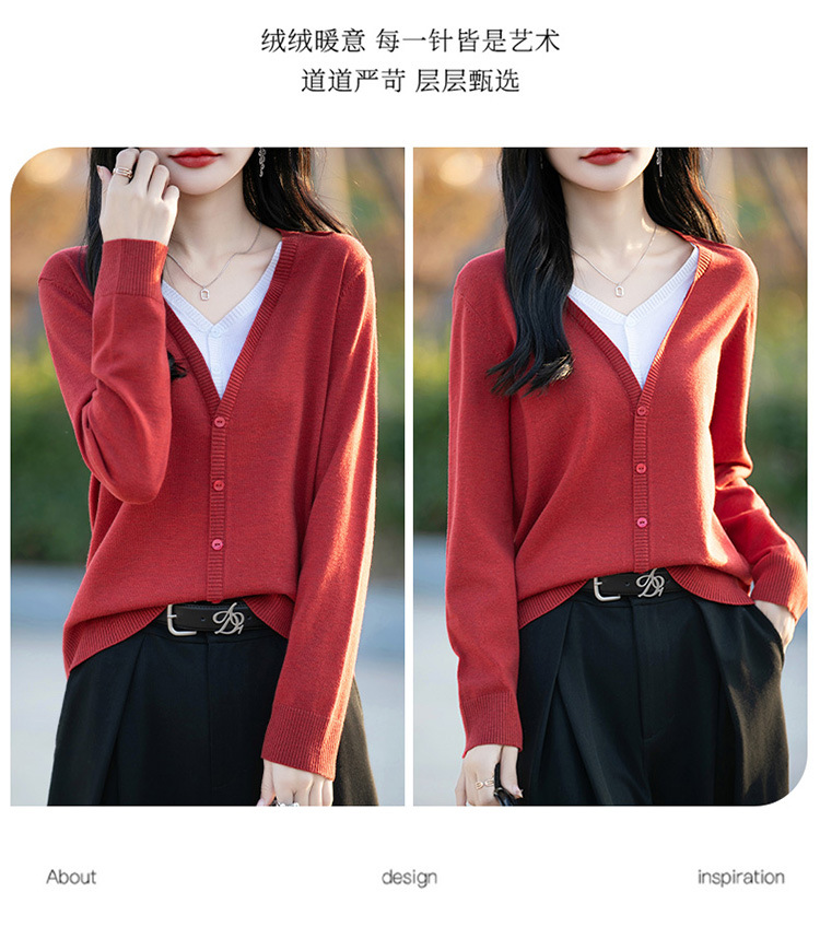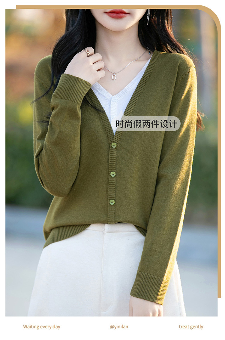 봄 새로운 V-Neck 가짜 2 조각 양모 카디건 여성의 느슨한 짧은 재킷 니트 외주 디자인 스웨터 얇은스토어 가기