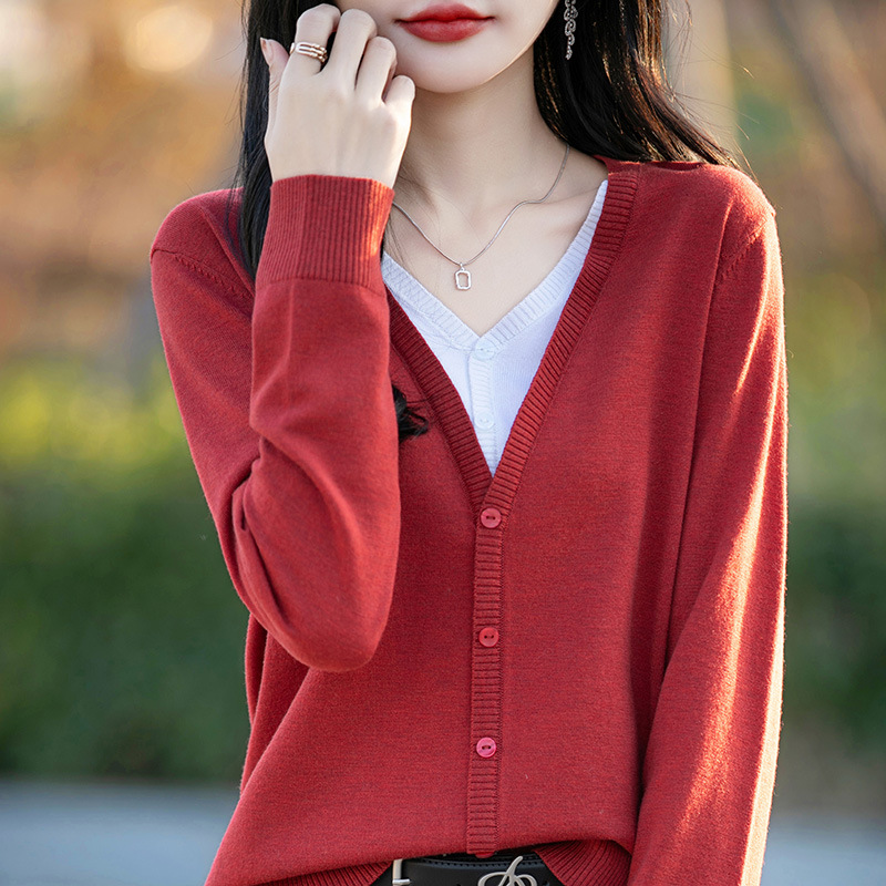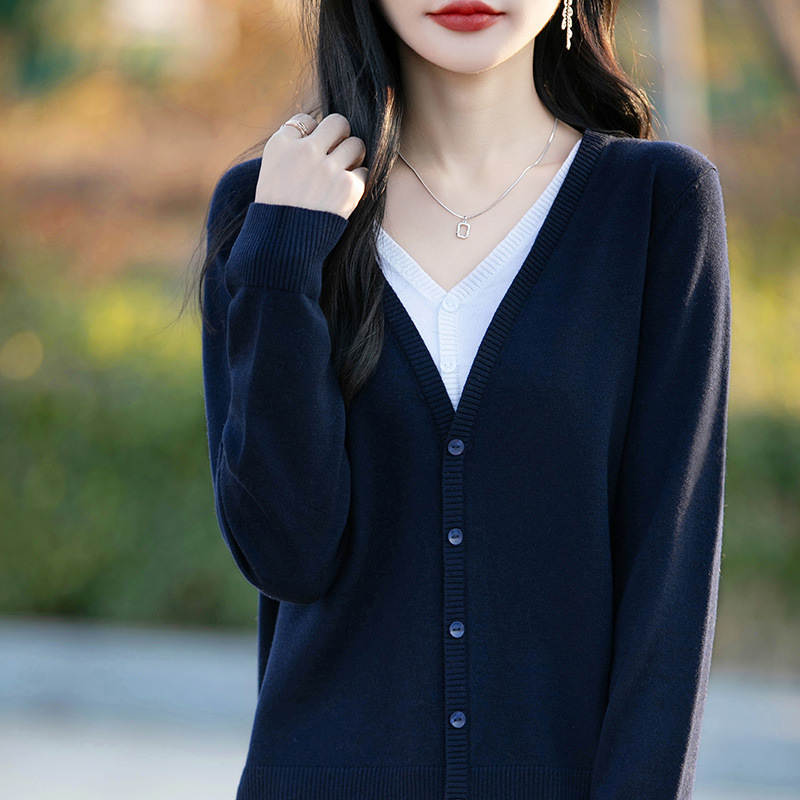 봄 새로운 V-Neck 가짜 2 조각 양모 카디건 여성의 느슨한 짧은 재킷 니트 외주 디자인 스웨터 얇은