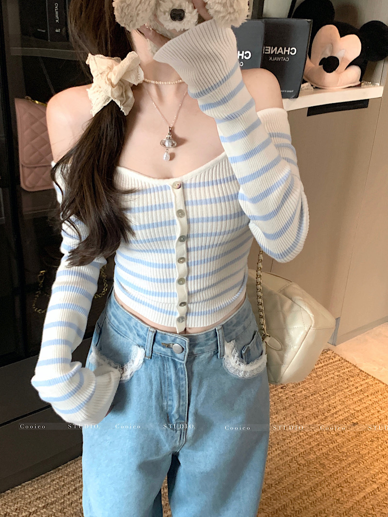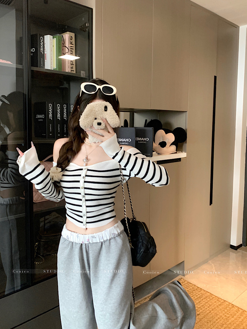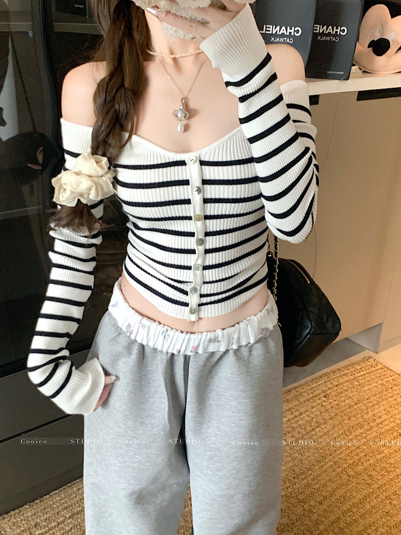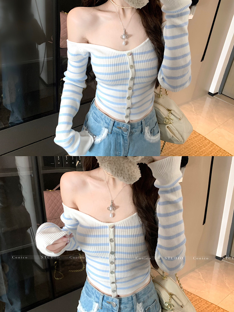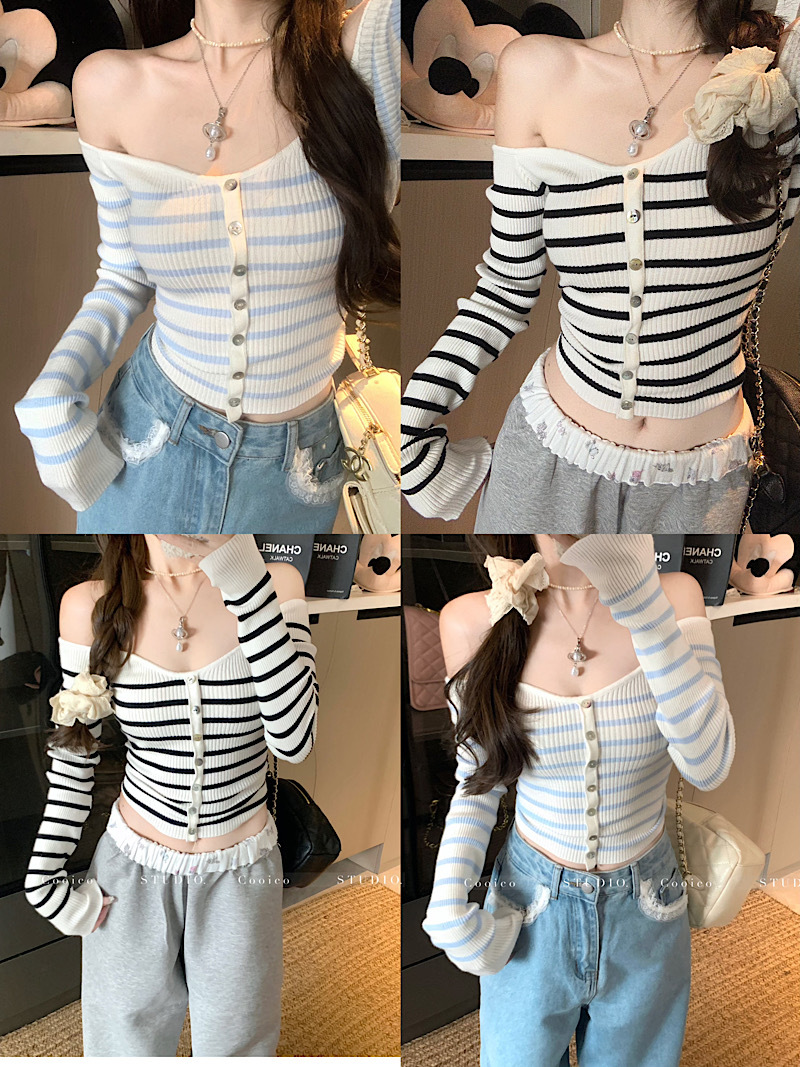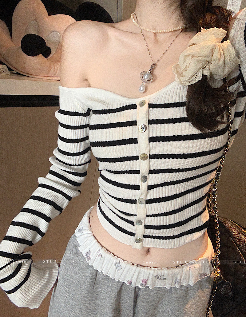 순수한 욕망 스타일 오프 숄더 스트라이프 니트 스웨터 여성의 봄 디자인 센스 슬림 핏 내면베이스 셔츠 쇼트 탑