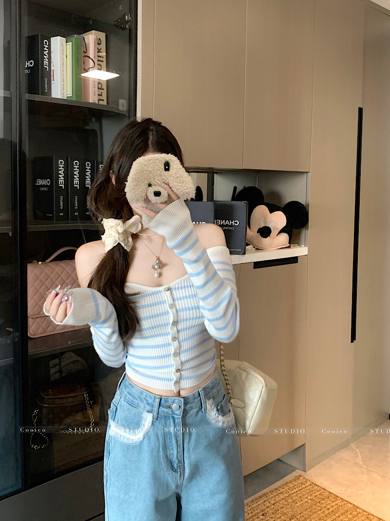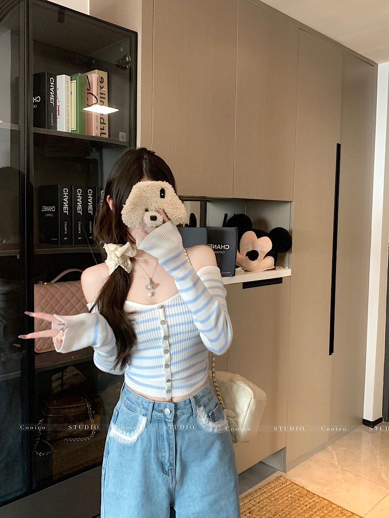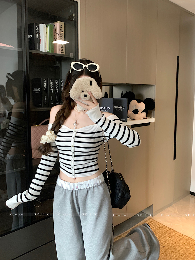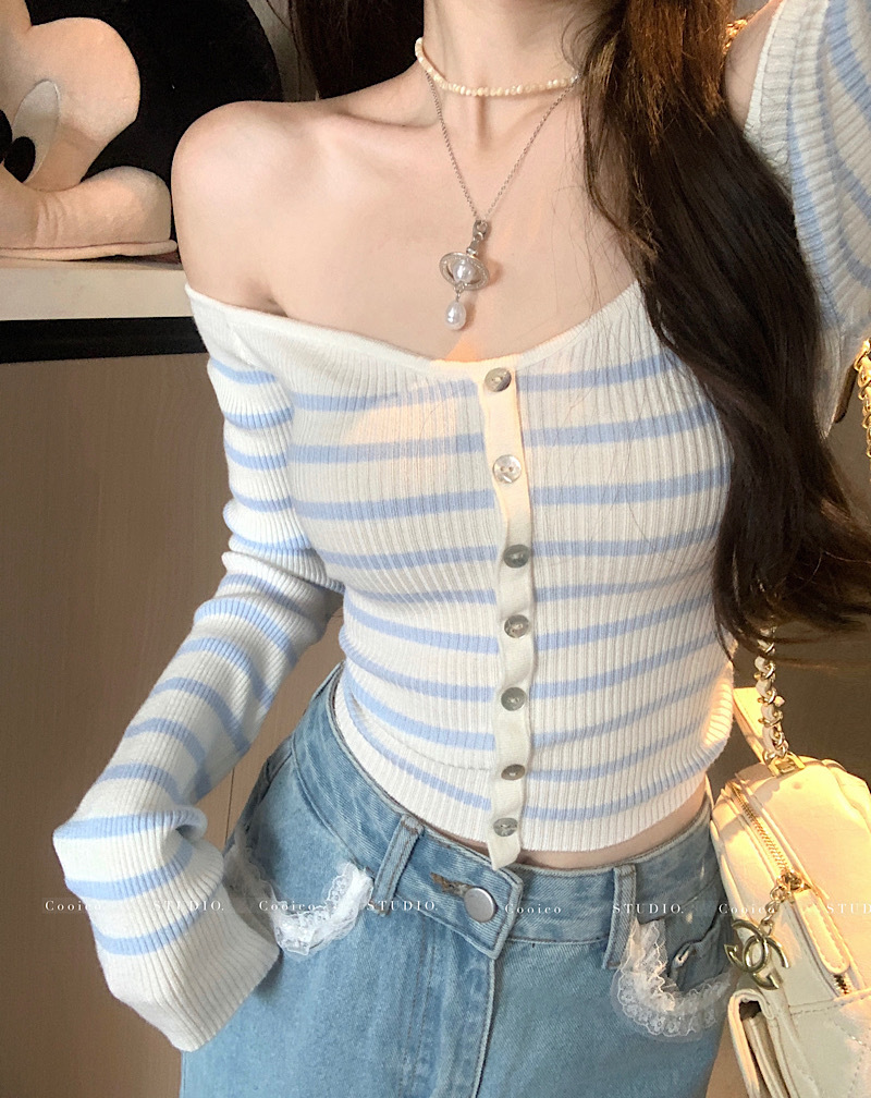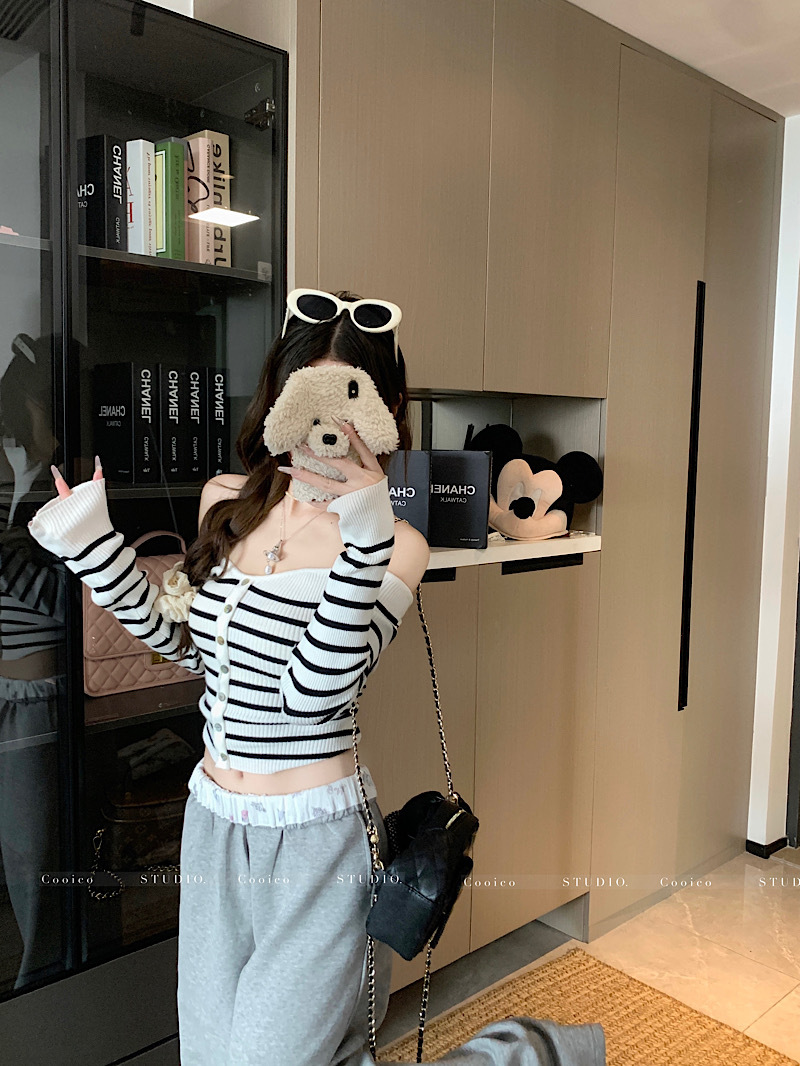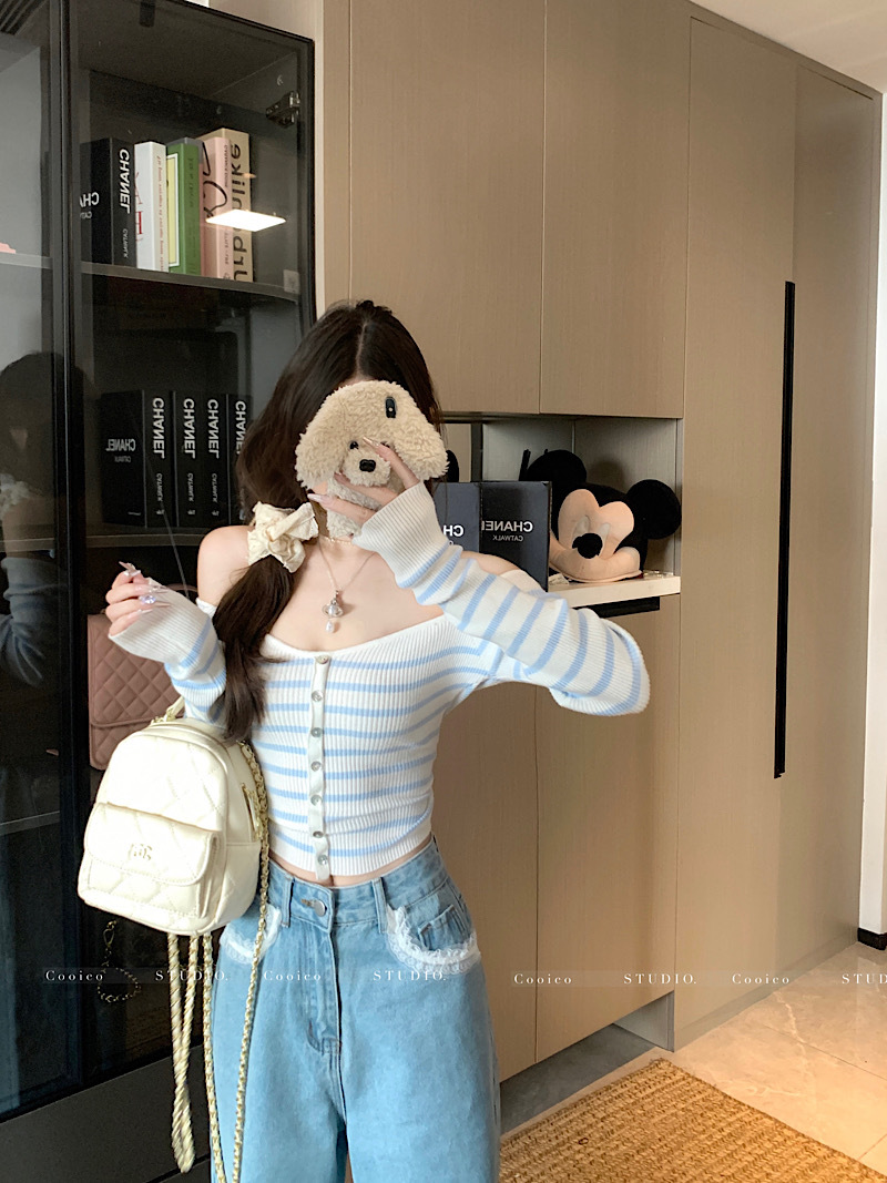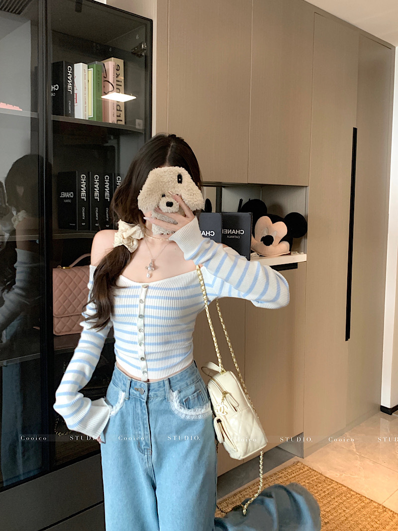 순수한 욕망 스타일 오프 숄더 스트라이프 니트 스웨터 여성의 봄 디자인 센스 슬림 핏 내면베이스 셔츠 쇼트 탑
