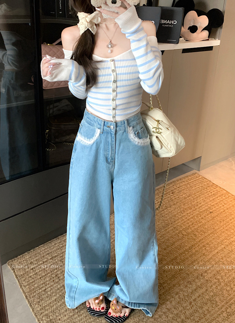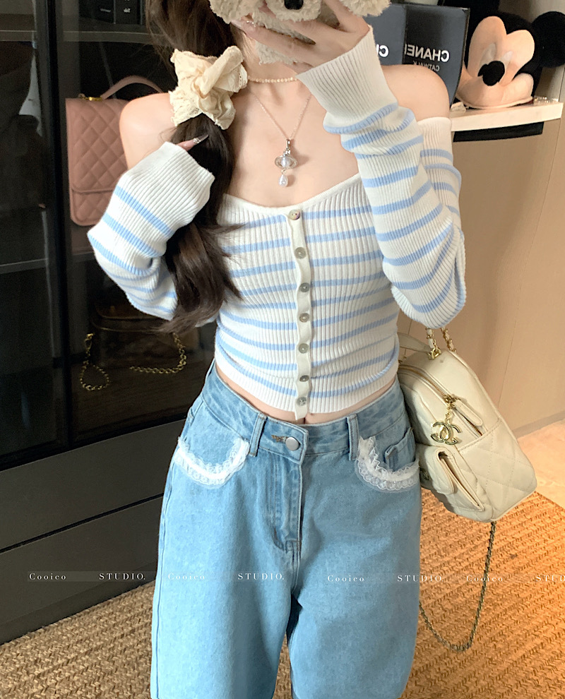 순수한 욕망 스타일 오프 숄더 스트라이프 니트 스웨터 여성의 봄 디자인 센스 슬림 핏 내면베이스 셔츠 쇼트 탑스토어 가기