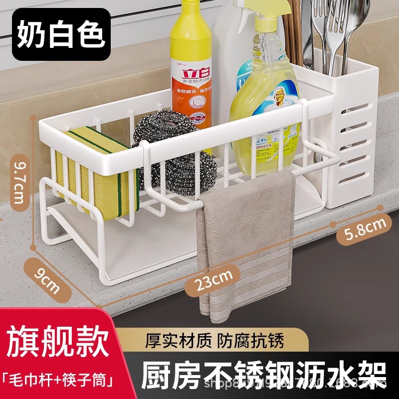 • [플래그십 모델] 밀크 화이트⭐스테인레스 배수 바구니 + 수건 걸이 + 젓가락 꽂이 (두껍고 굵게)