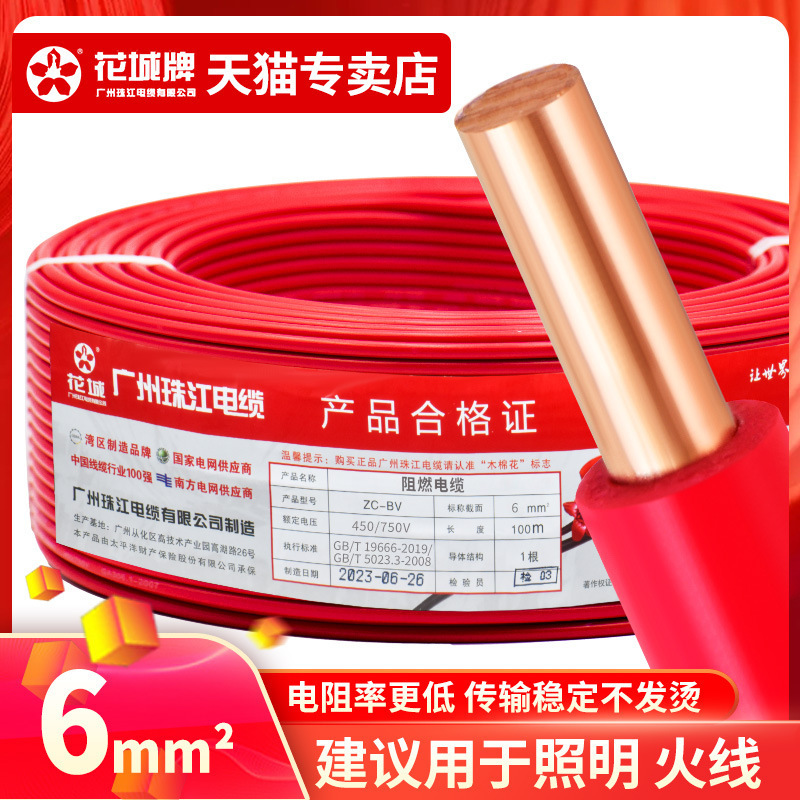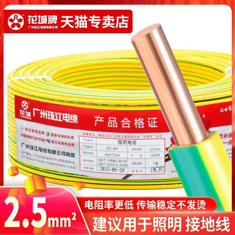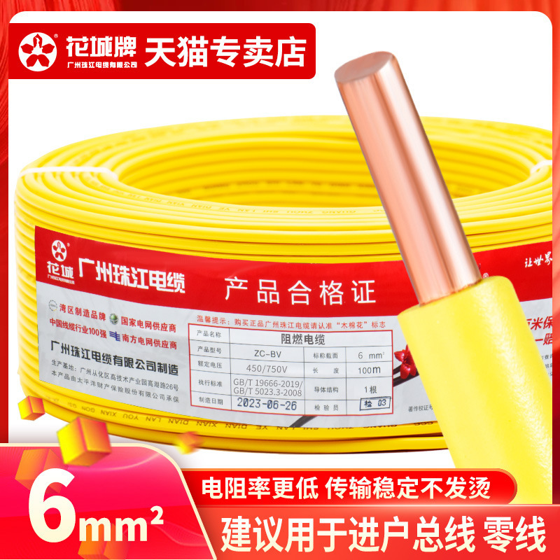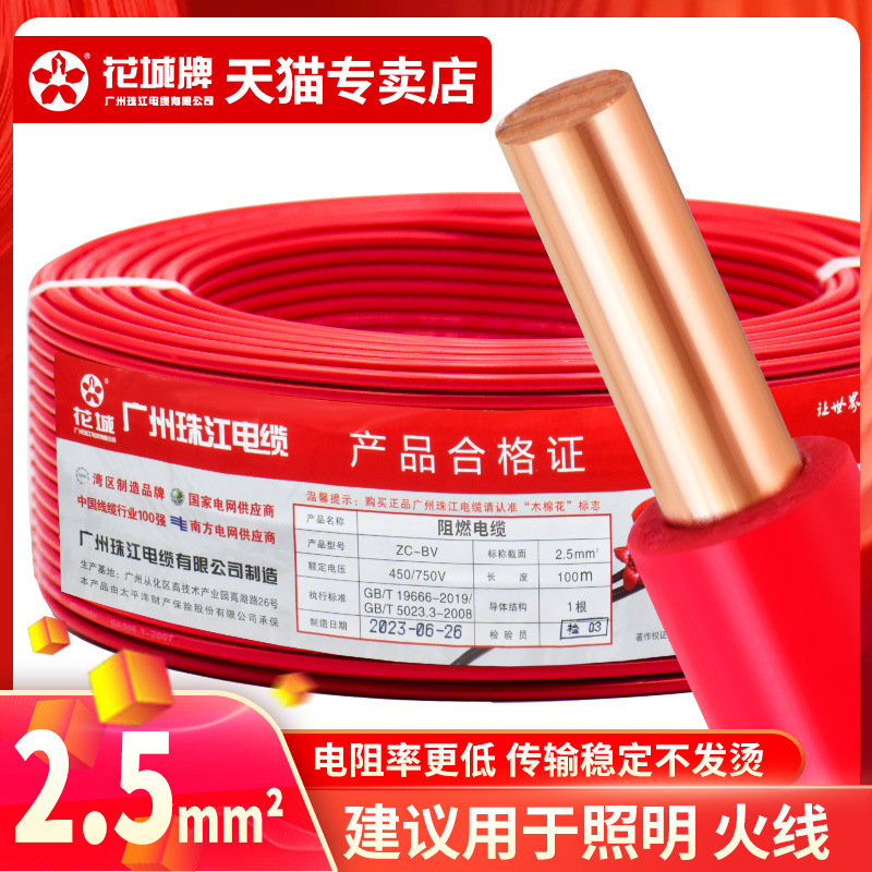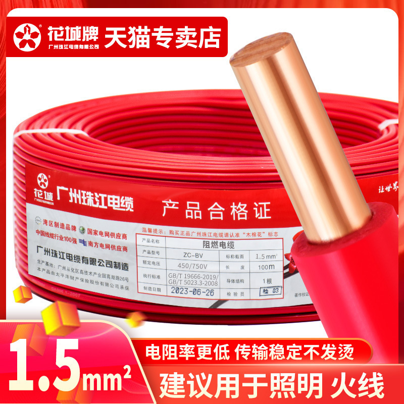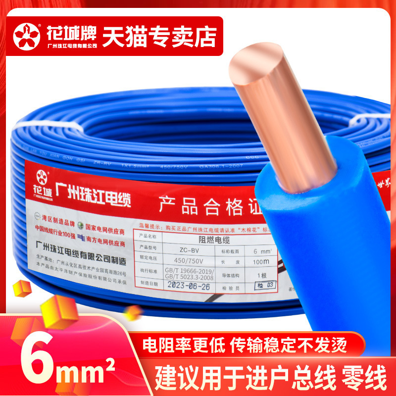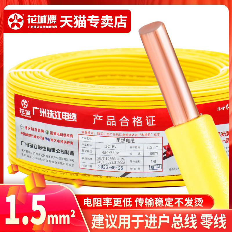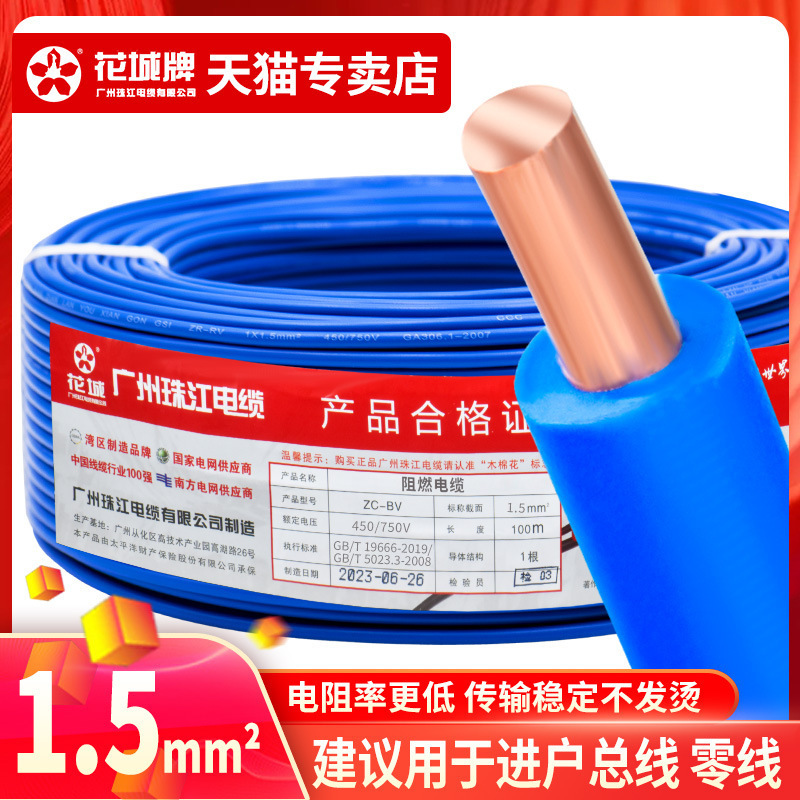 광저우 Zhujiang 전기 와이어 가정용 GB BV1.5 2.5 4 6 사각형 단일 코어 단일 가닥 홈 장식 순수 구리 코어 하드 와이어