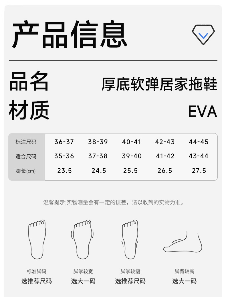 温馨提示:EVA材质拖鞋需避免高温暴晒,长时间高温会导致鞋子产生变形。