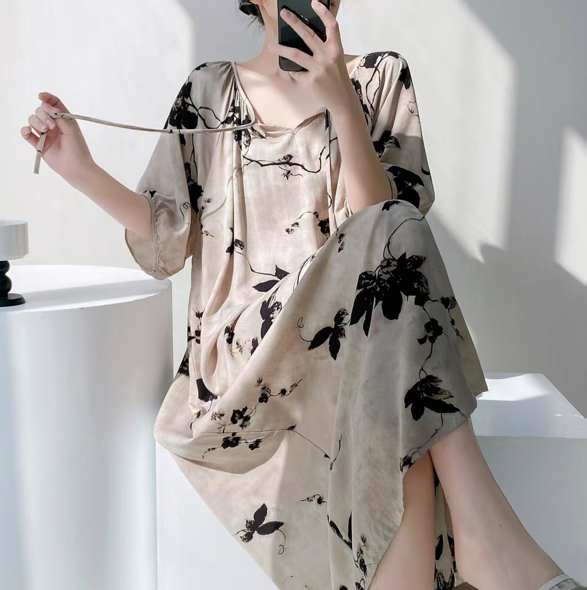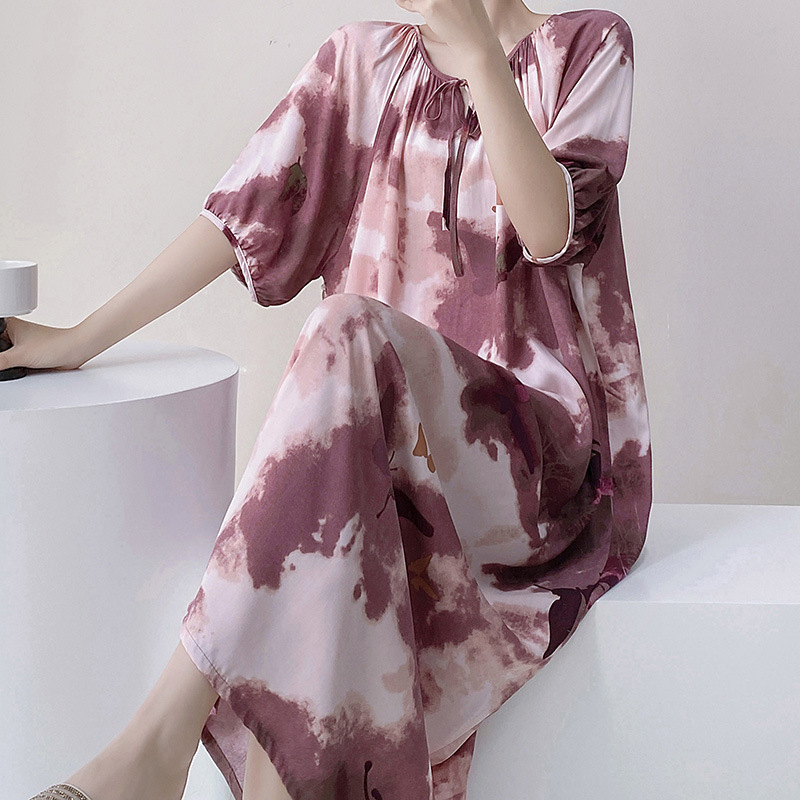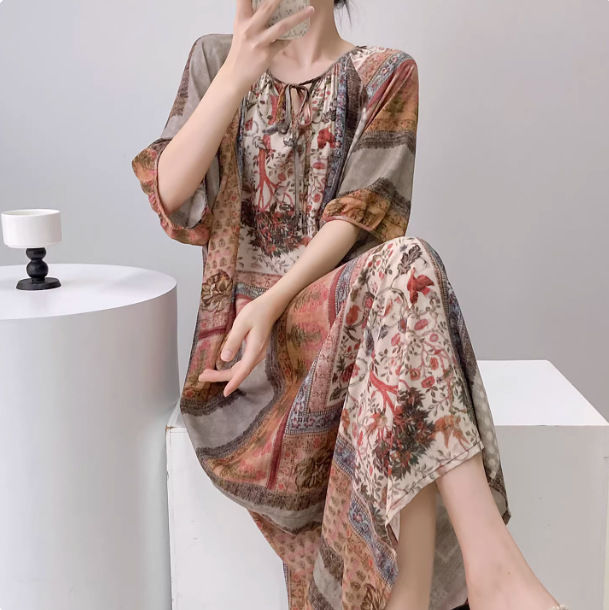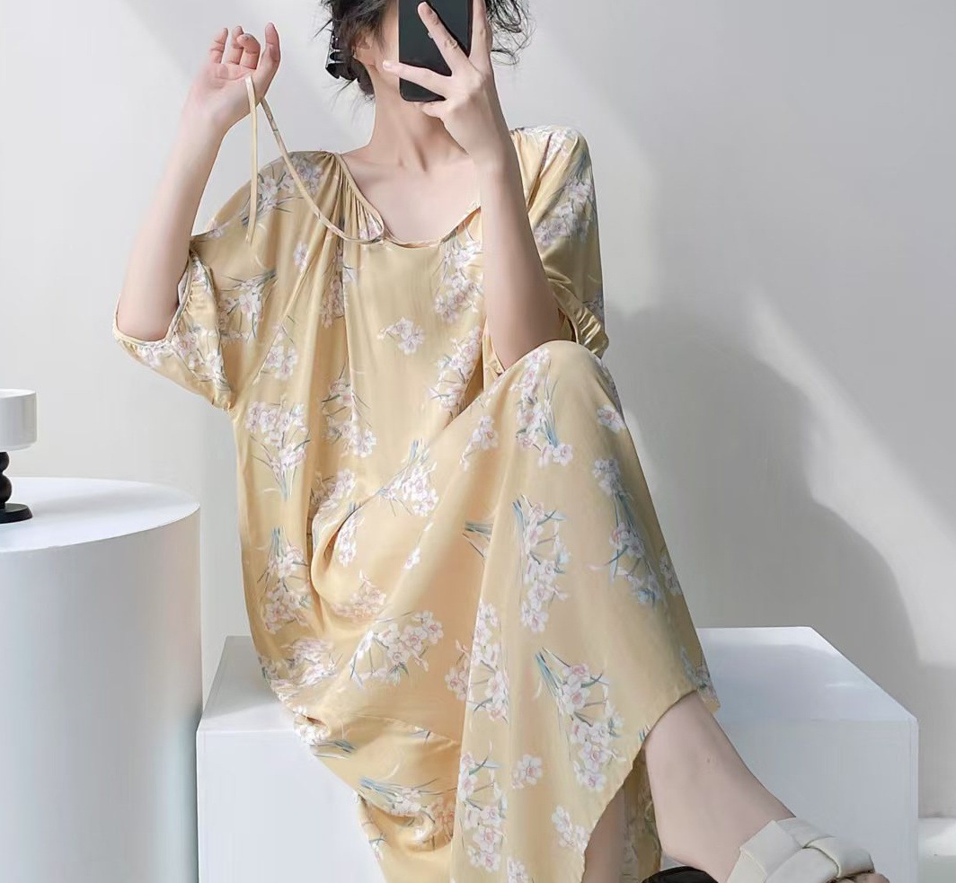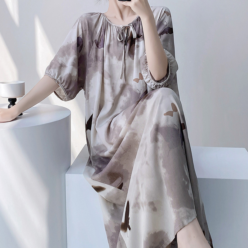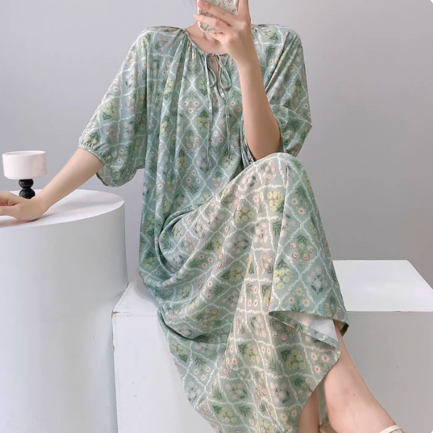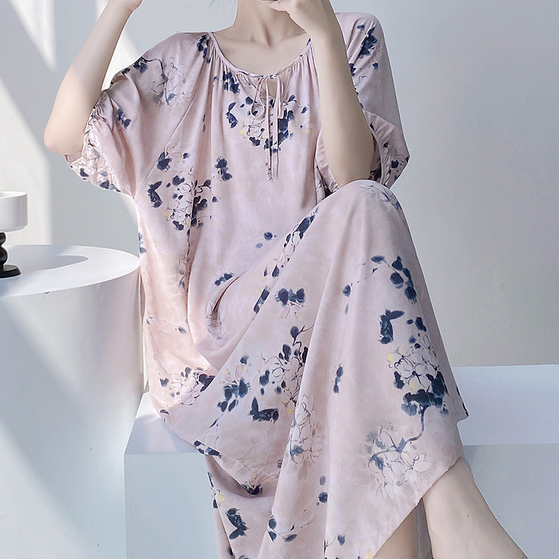 반팔 면 실크 잠옷 여성의 봄과 여름 인쇄 잠옷 느슨한 플러스 사이즈 긴 외형 하이 엔드 스타일 홈 옷스토어 가기