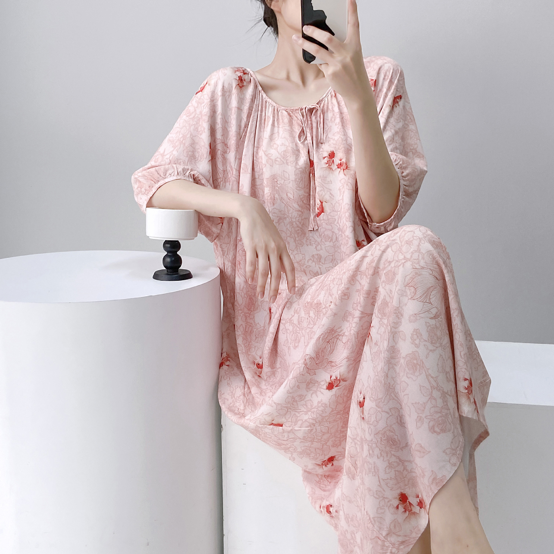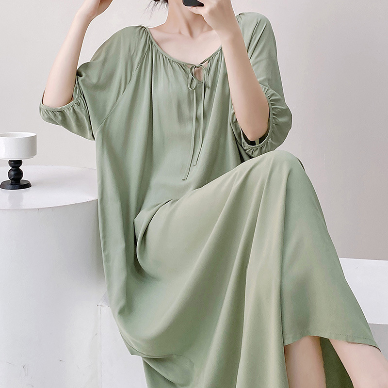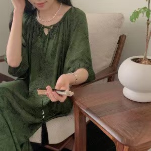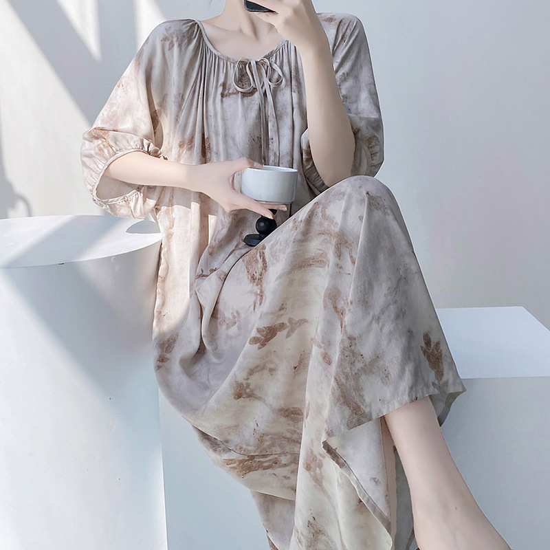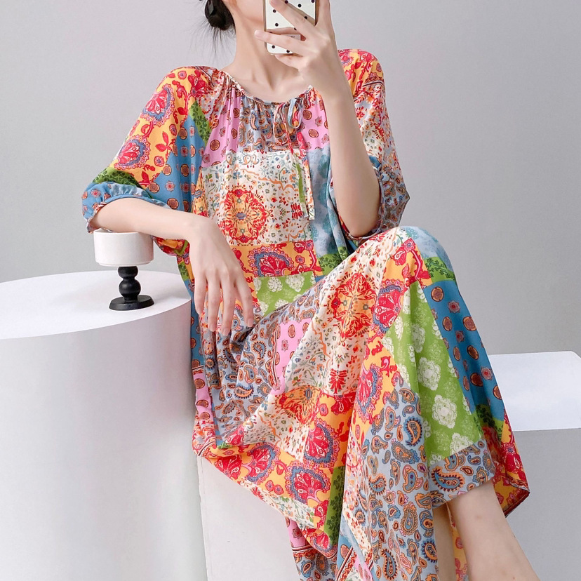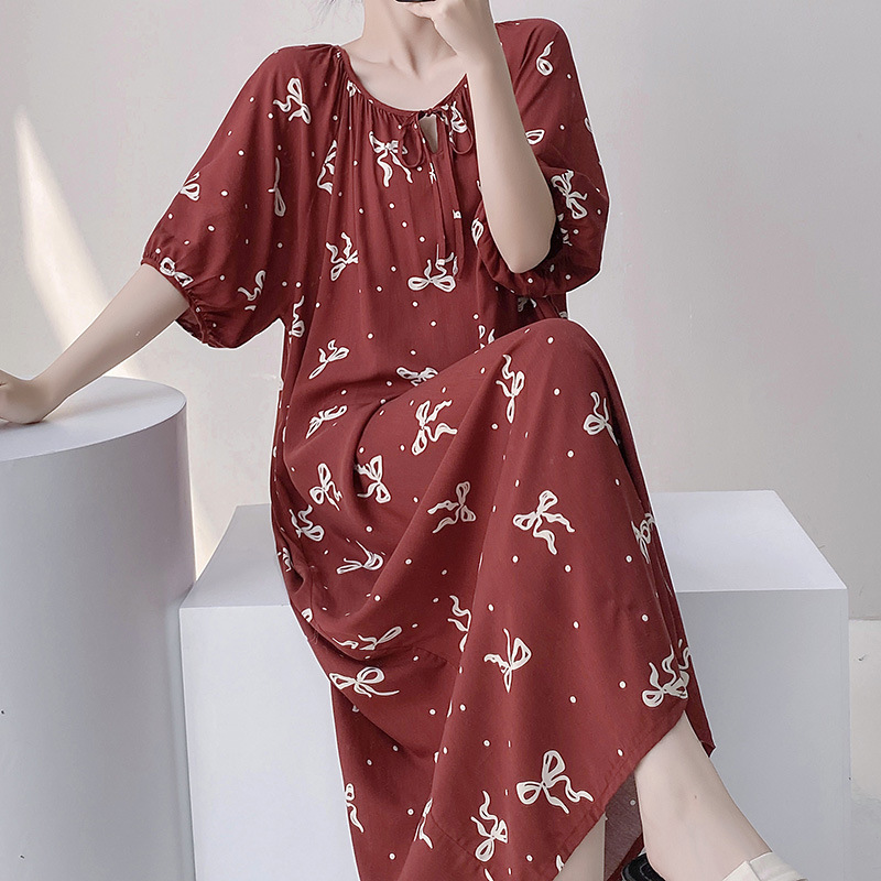반팔 면 실크 잠옷 여성의 봄과 여름 인쇄 잠옷 느슨한 플러스 사이즈 긴 외형 하이 엔드 스타일 홈 옷스토어 가기