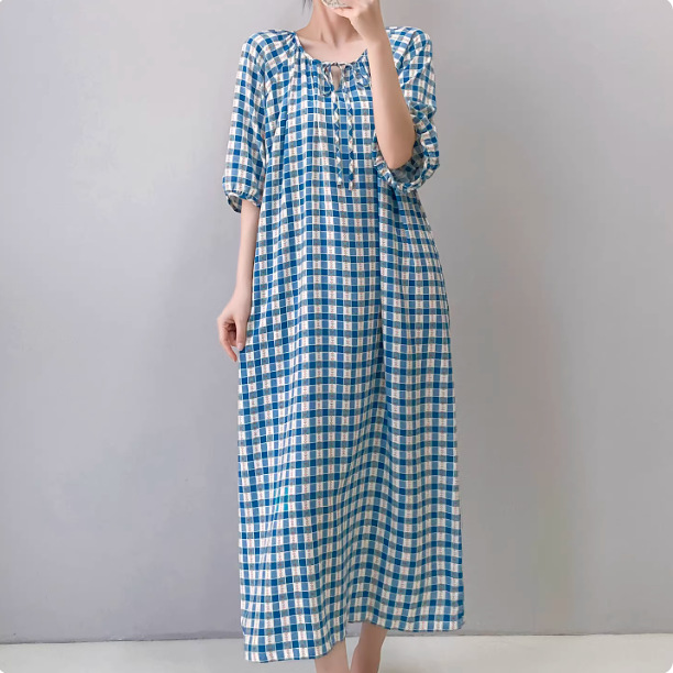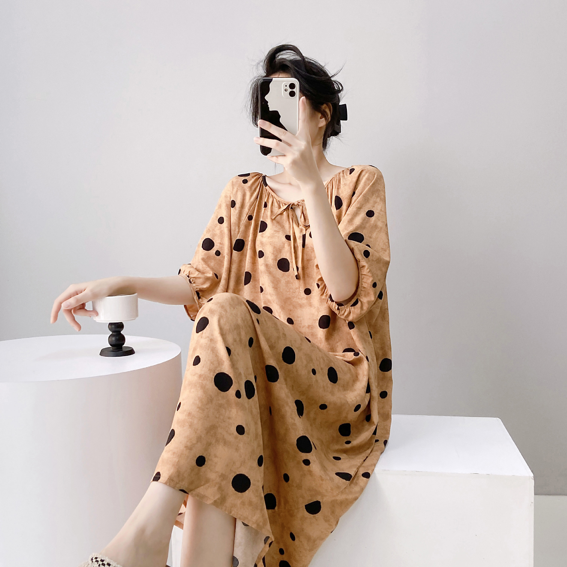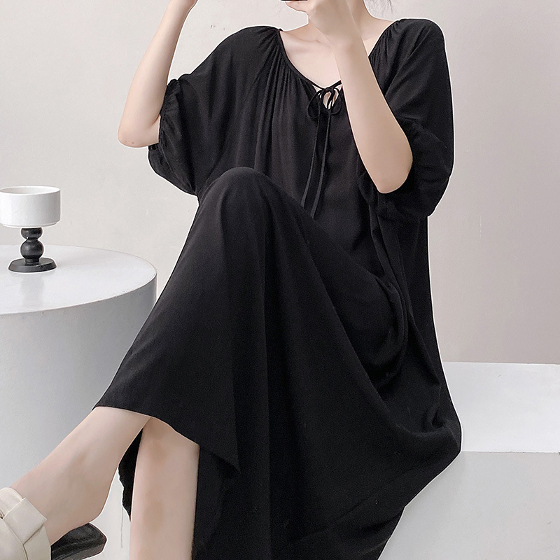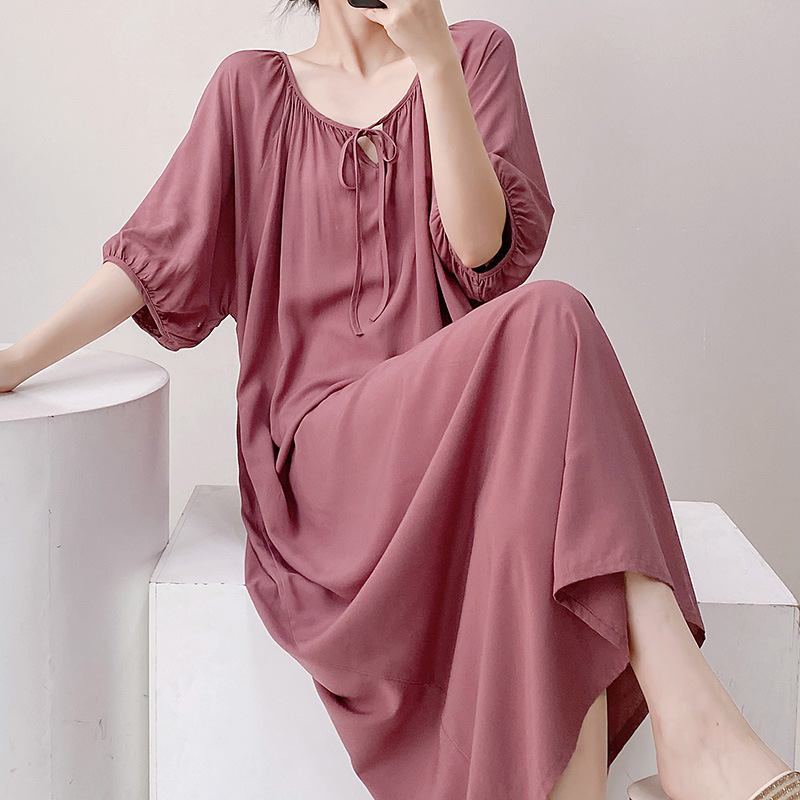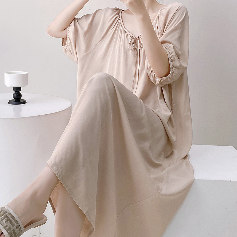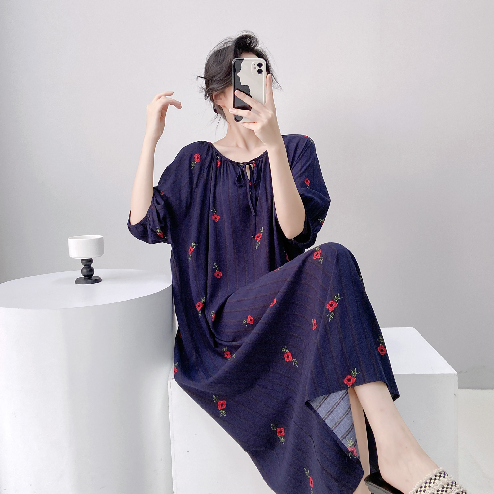 반팔 면 실크 잠옷 여성의 봄과 여름 인쇄 잠옷 느슨한 플러스 사이즈 긴 외형 하이 엔드 스타일 홈 옷스토어 가기