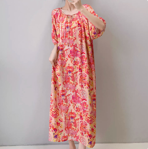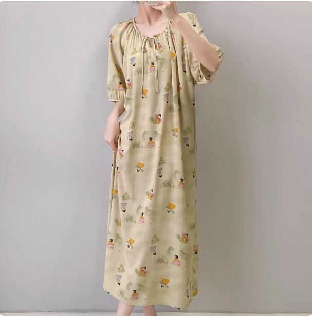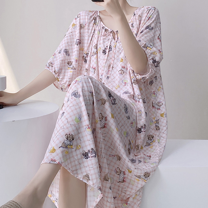 반팔 면 실크 잠옷 여성의 봄과 여름 인쇄 잠옷 느슨한 플러스 사이즈 긴 외형 하이 엔드 스타일 홈 옷