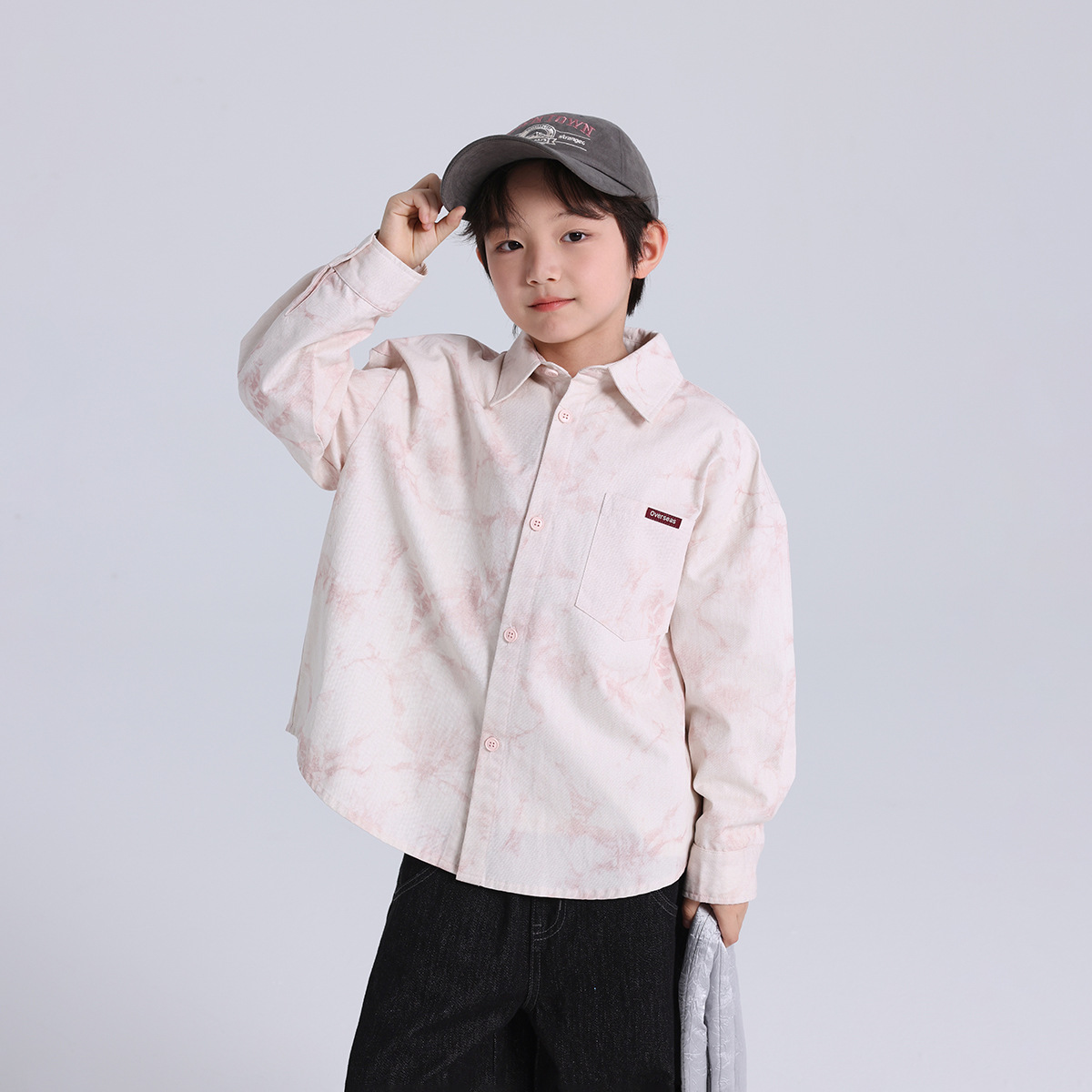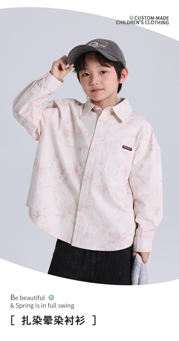 푸딩 하루 봄 어린이 캐주얼 탑 2025 봄 뉴 보이즈 올 매치 핑크 넥타이 염색 코튼 셔츠스토어 가기