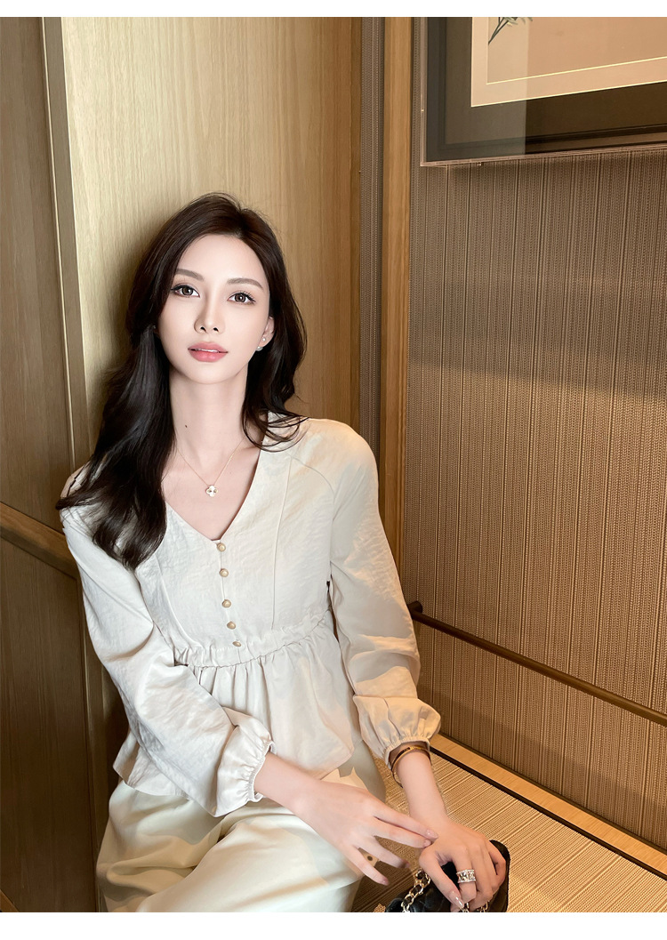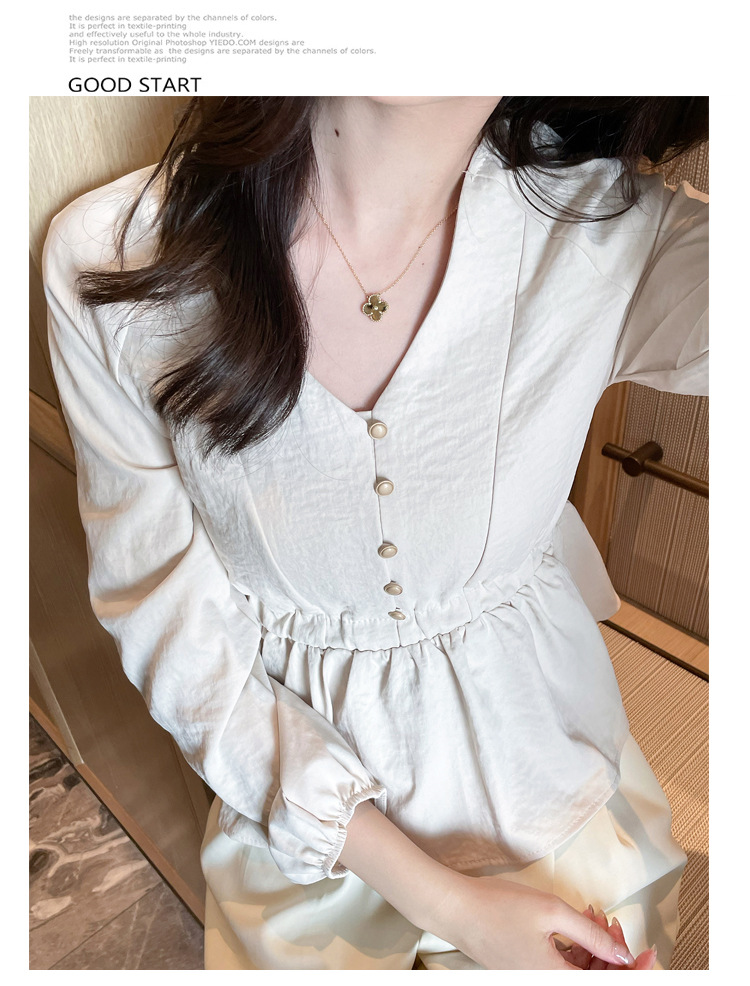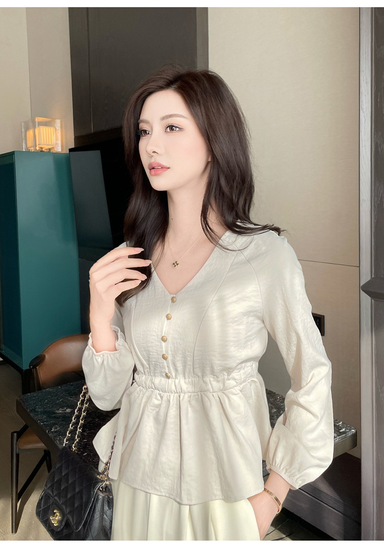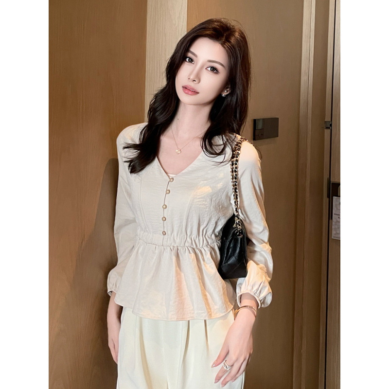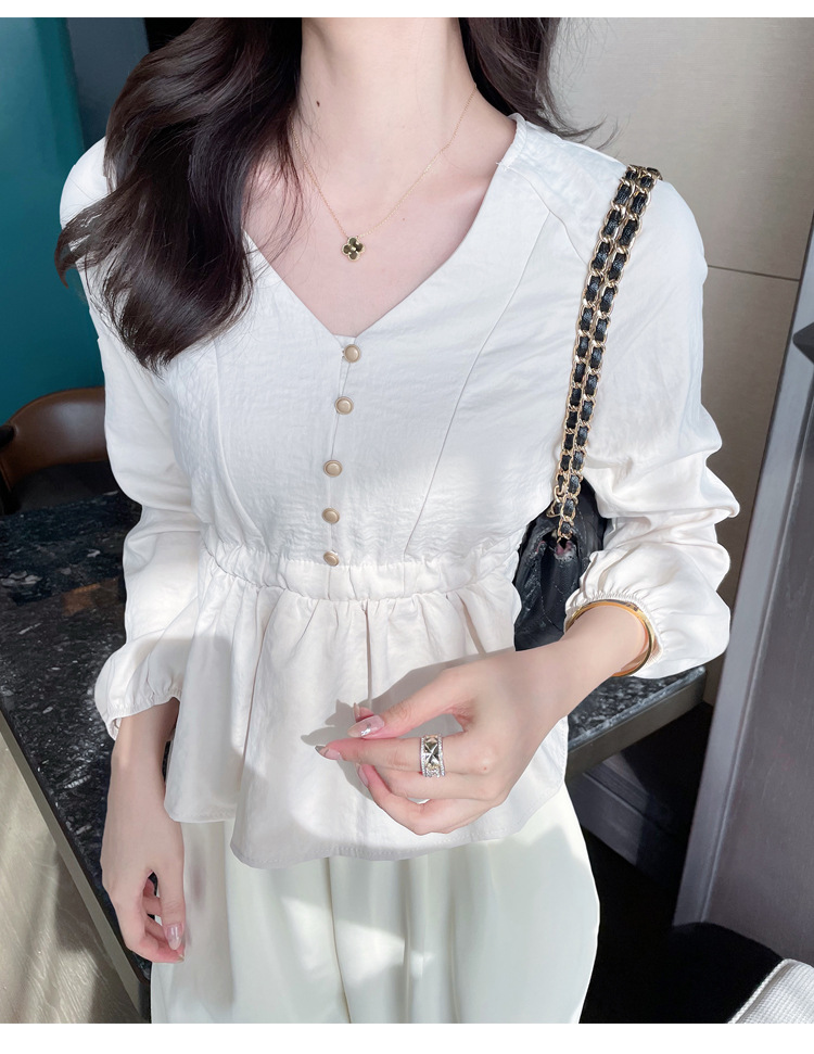 사교계 우아한 여성 최고의 서양 스타일 달콤한 2025 이른 봄 새로운 V-목 타이트 허리 틈새 인기있는 쉬폰 셔츠스토어 가기