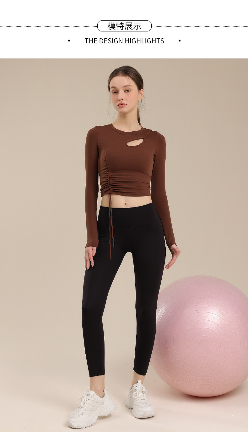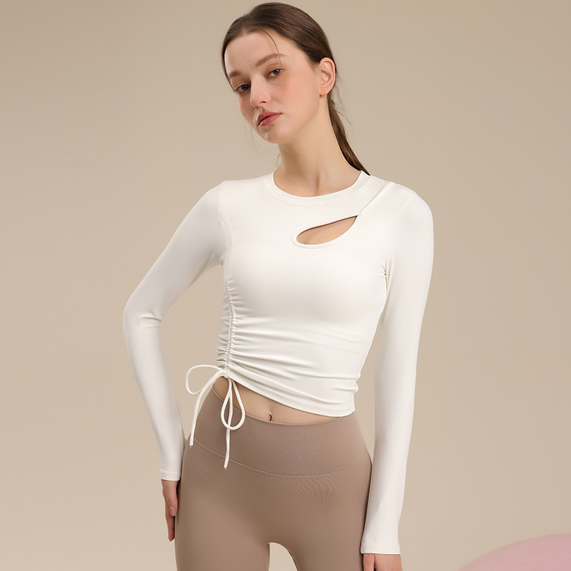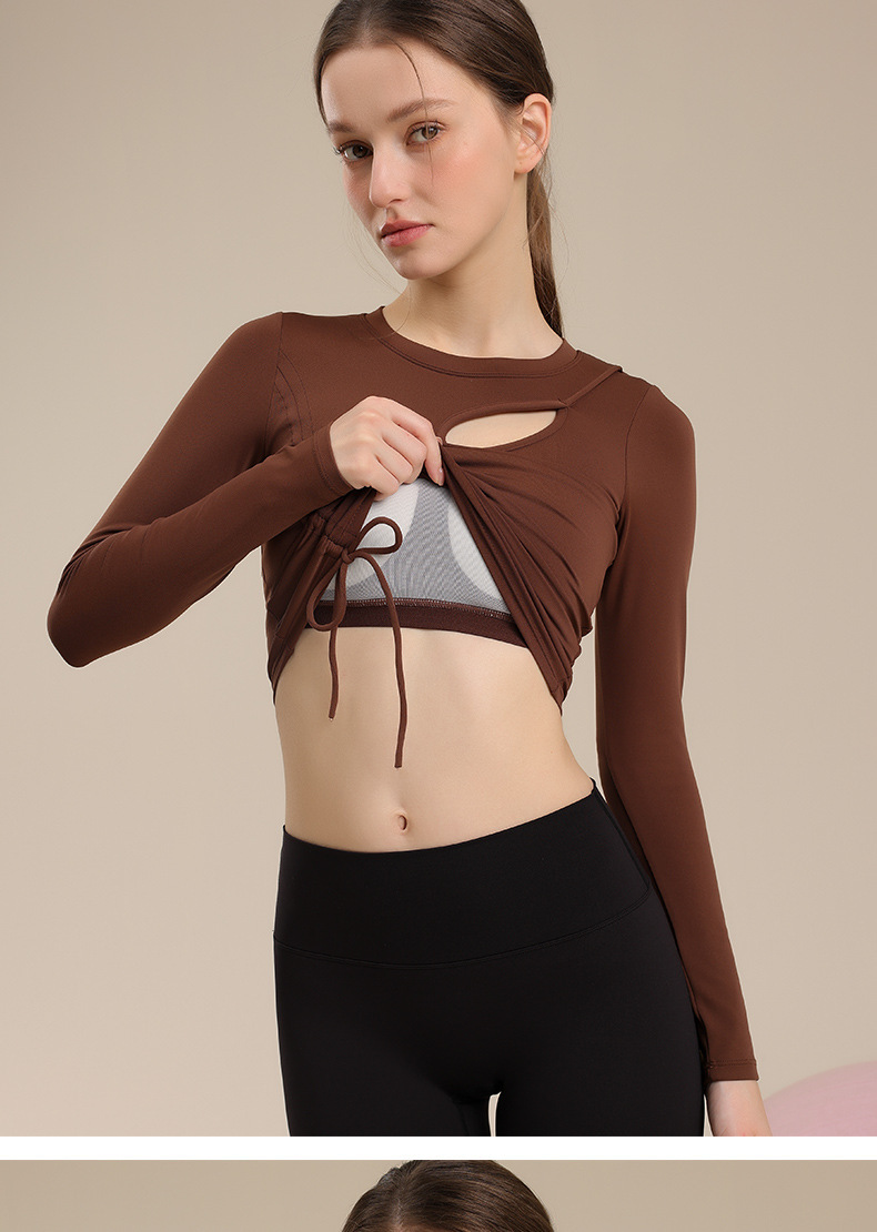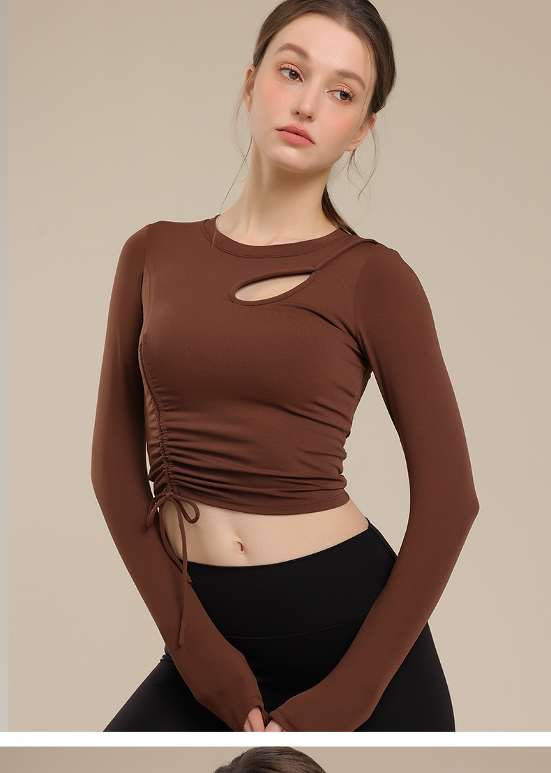 주름진 현악기 벨트 가슴 매트 요가 세트 여성용 중공 통기성 피트니스 아우터 착용 스포츠 탑 필라테스 슬리밍 긴 소매