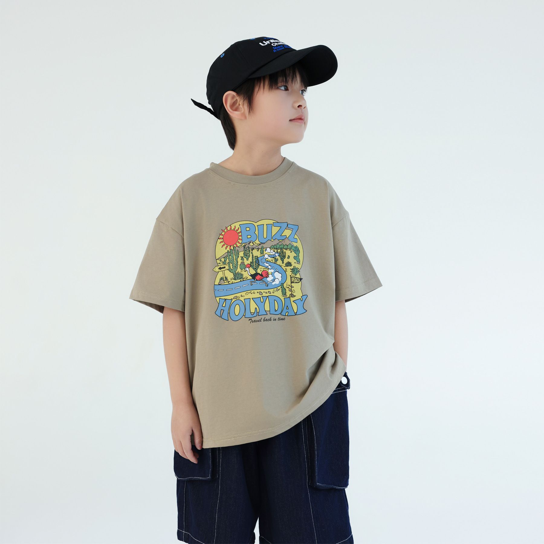 봄과 여름 2025 새로운 어린이 산 인쇄 반소매 최고 소년 서양식 캐주얼 반팔 티셔츠 느슨하고 편안한스토어 가기