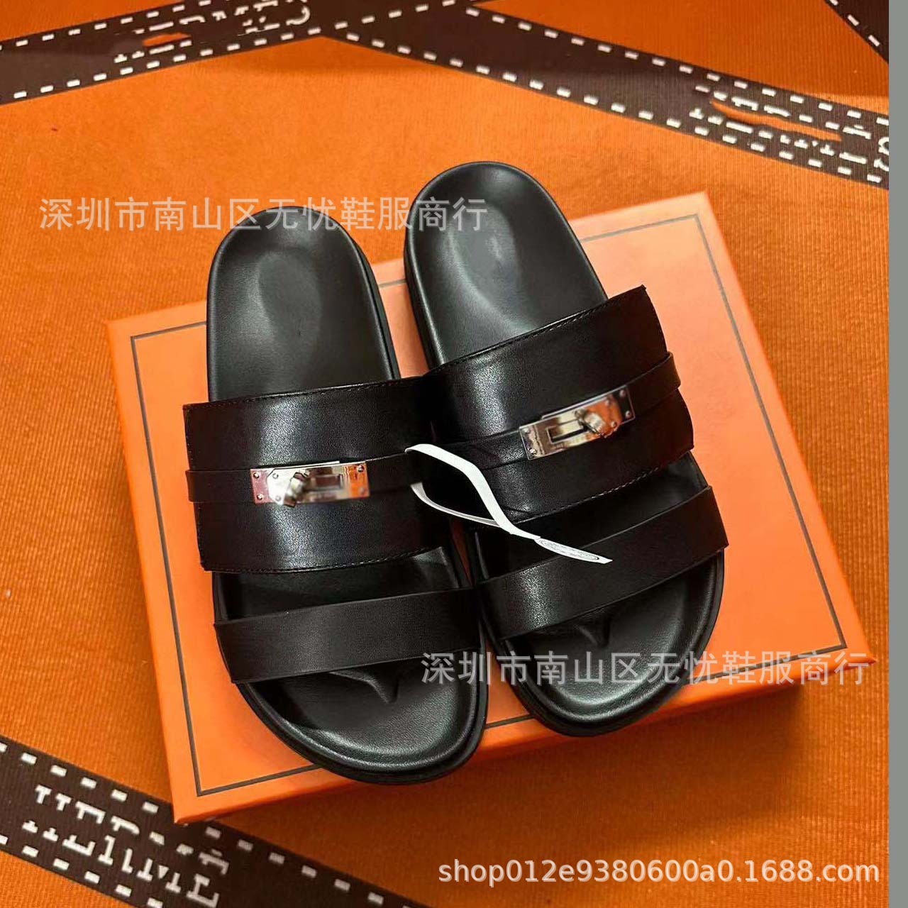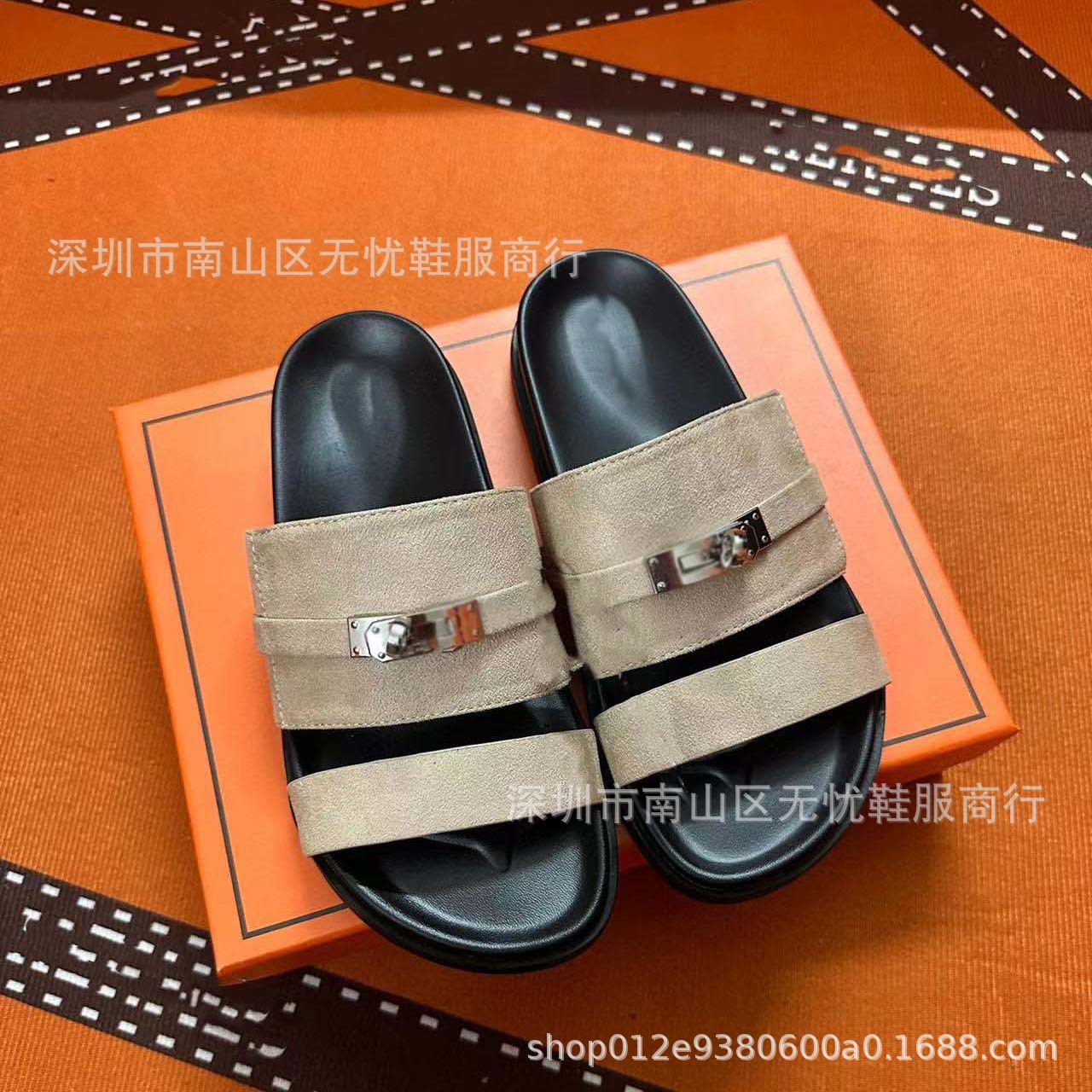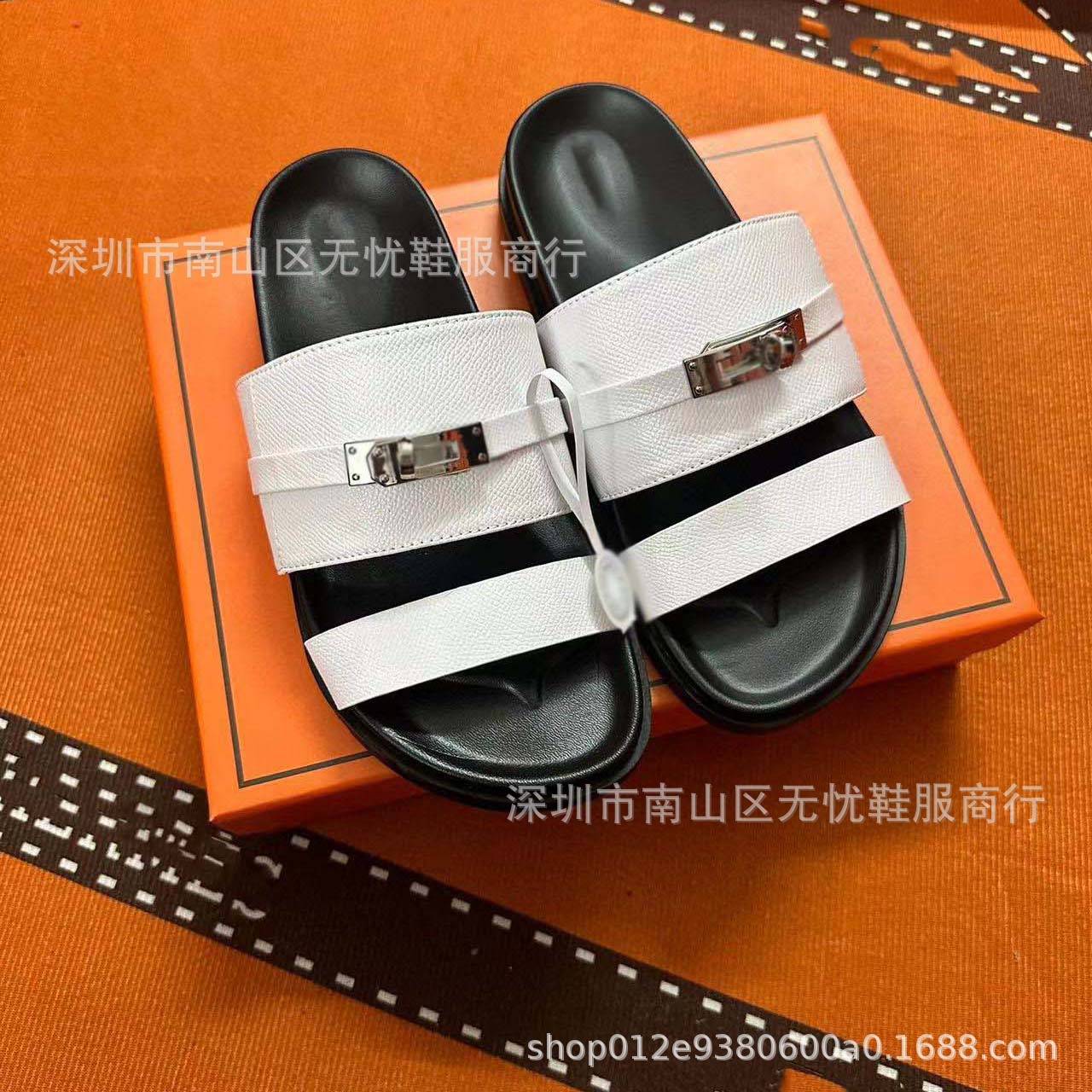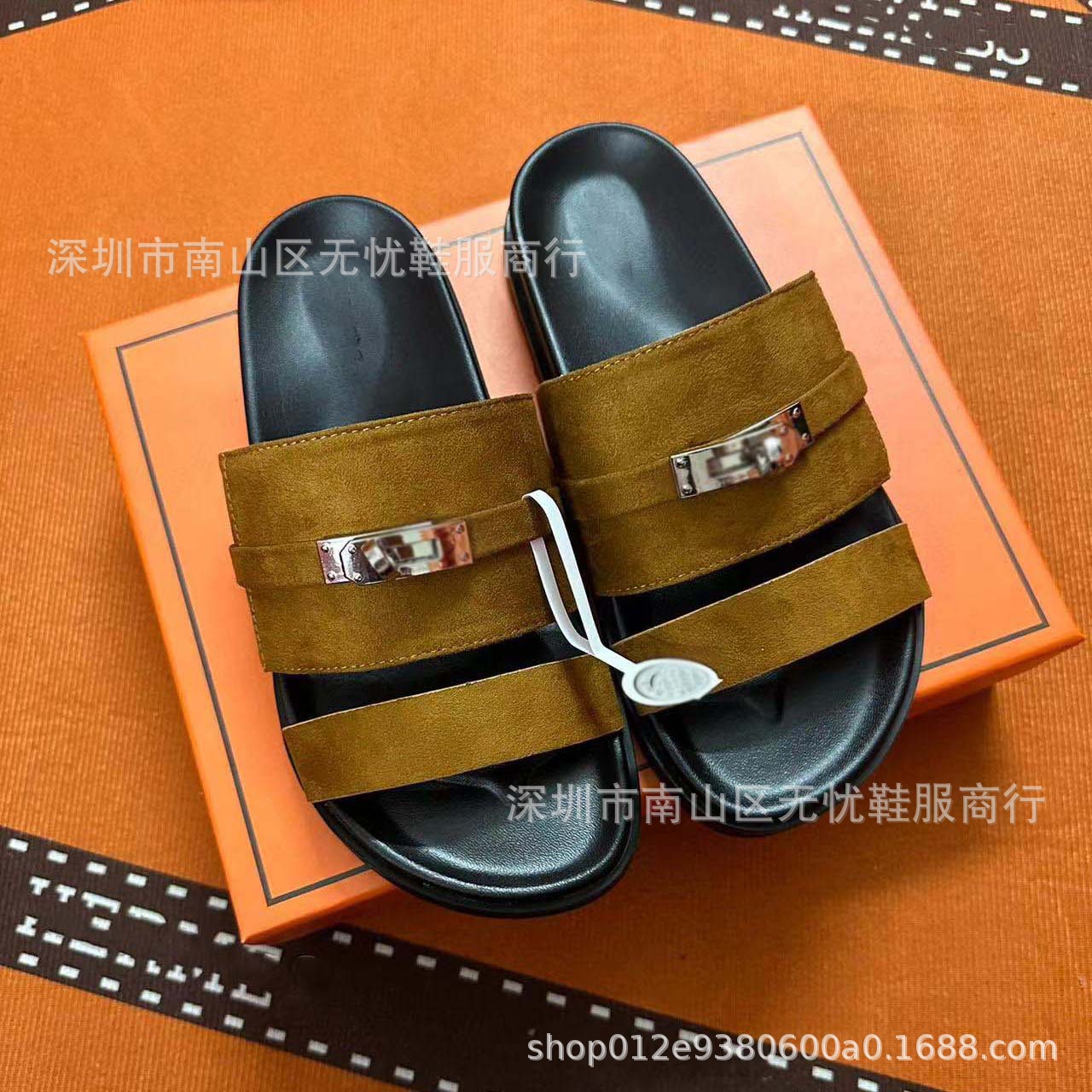 하이 에디션 H 커플의 와이드 스트랩 샌들 메탈 잠금 버클 정품 가죽 아우터 두꺼운 밑창 비치 세컨드 아저씨 신발 캐주얼 슬리퍼