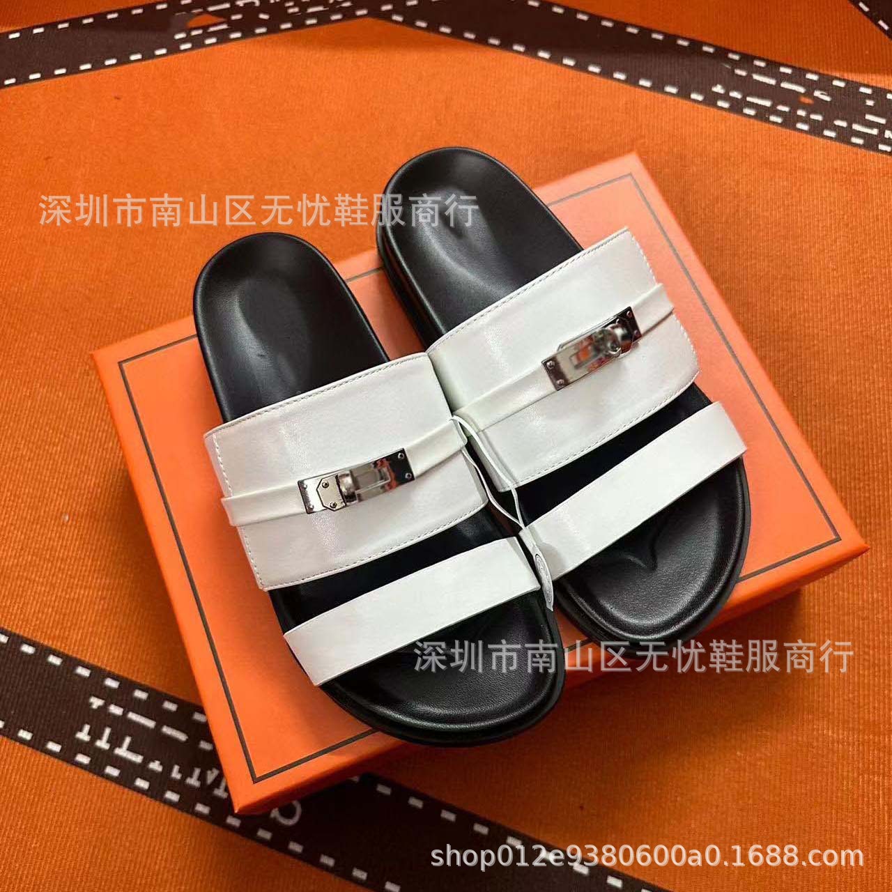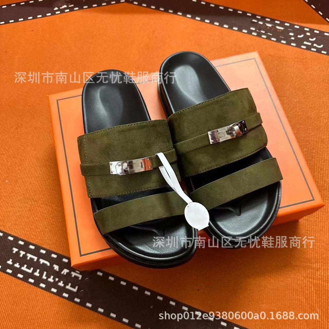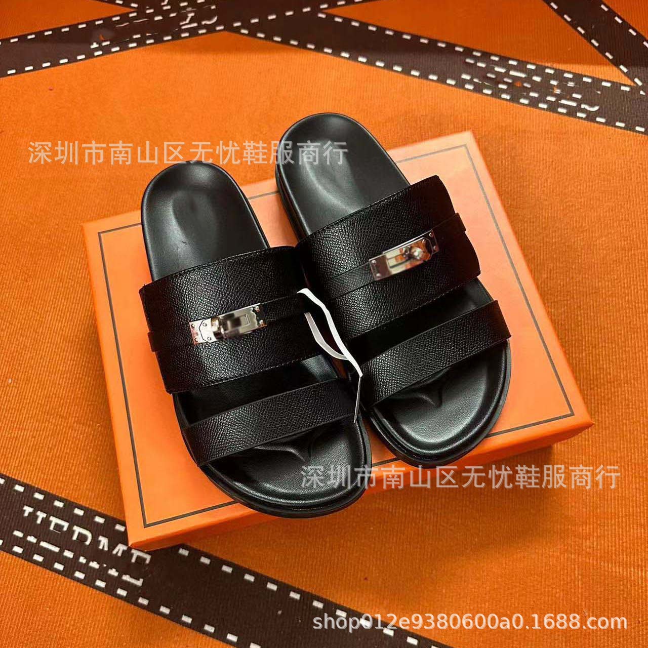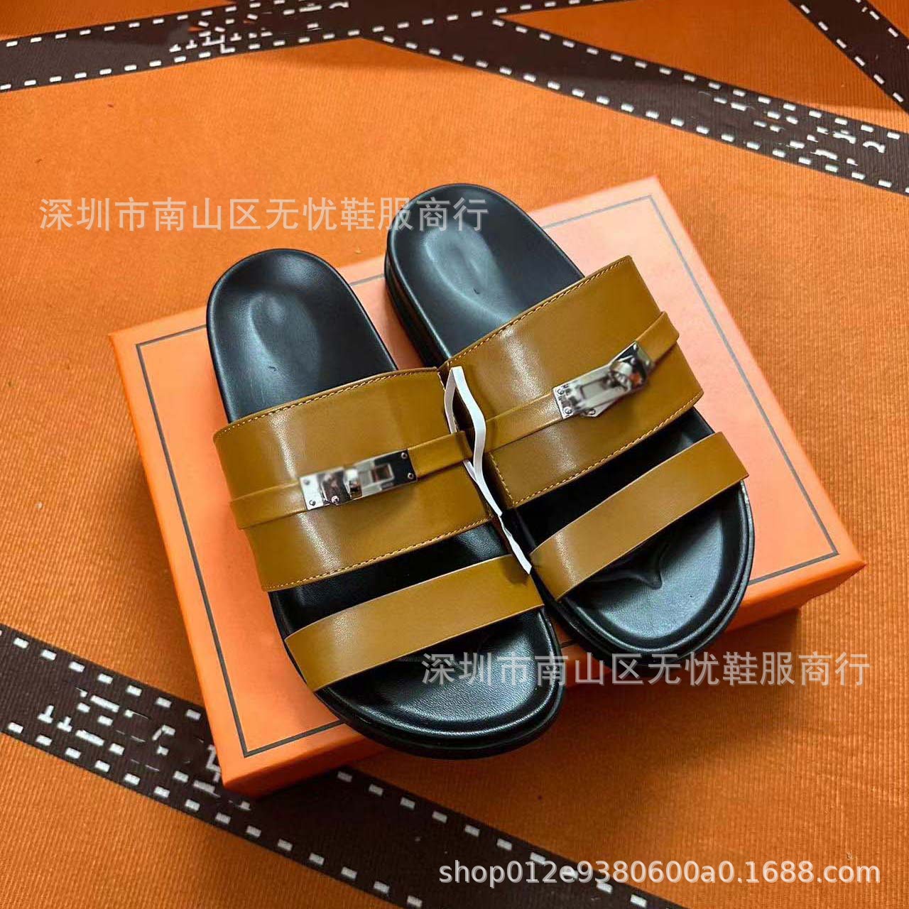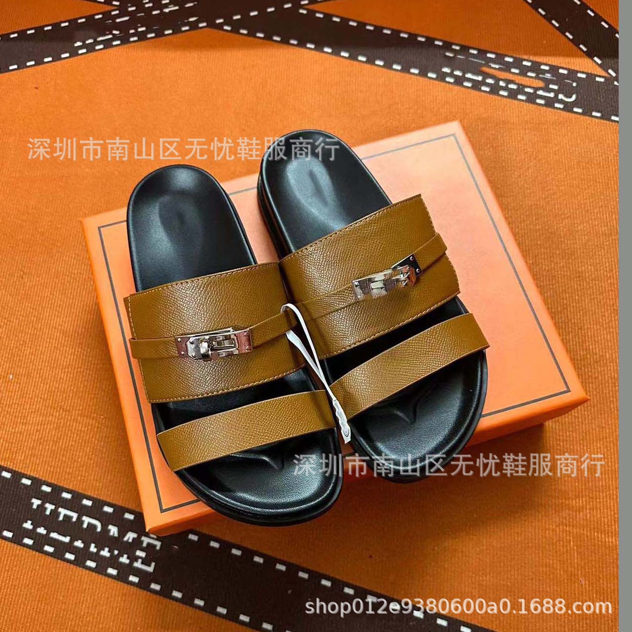 하이 에디션 H 커플의 와이드 스트랩 샌들 메탈 잠금 버클 정품 가죽 아우터 두꺼운 밑창 비치 세컨드 아저씨 신발 캐주얼 슬리퍼