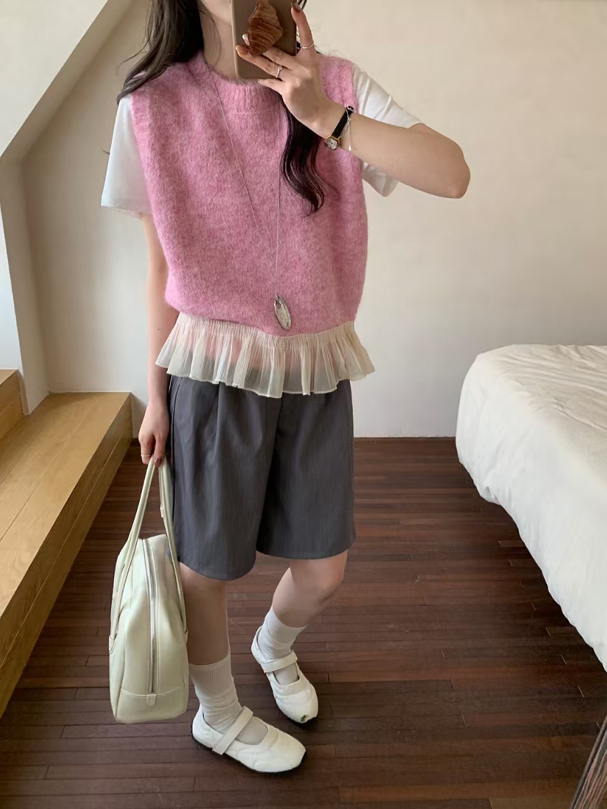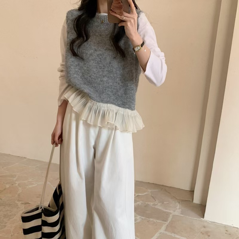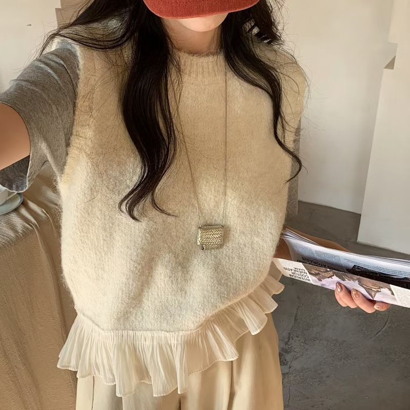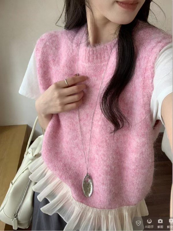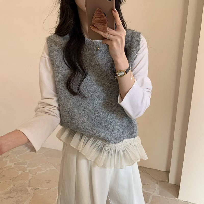 하이 퀄리티 레이스 바느질 니트 조끼 민소매 조끼 여자 봄 내부 스택 라운드 넥 쇼트 탑스토어 가기