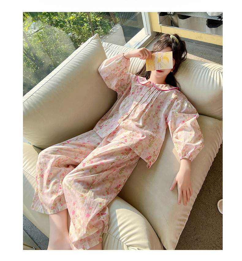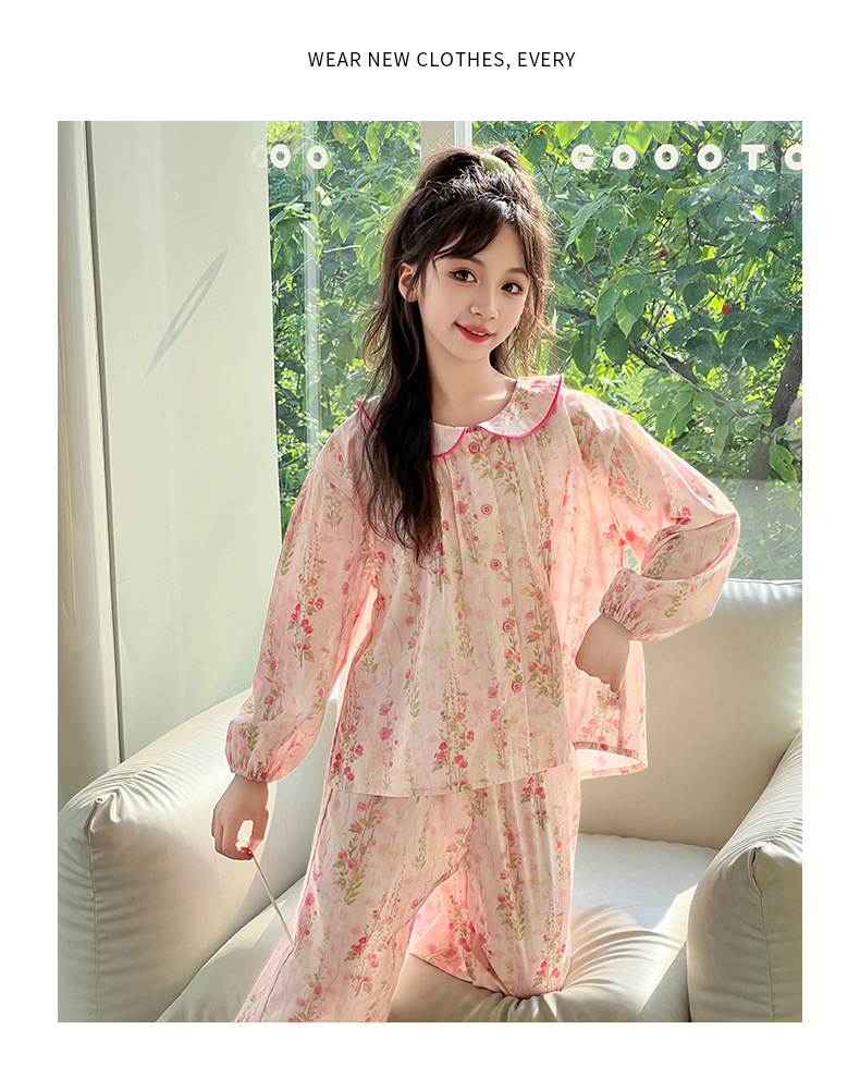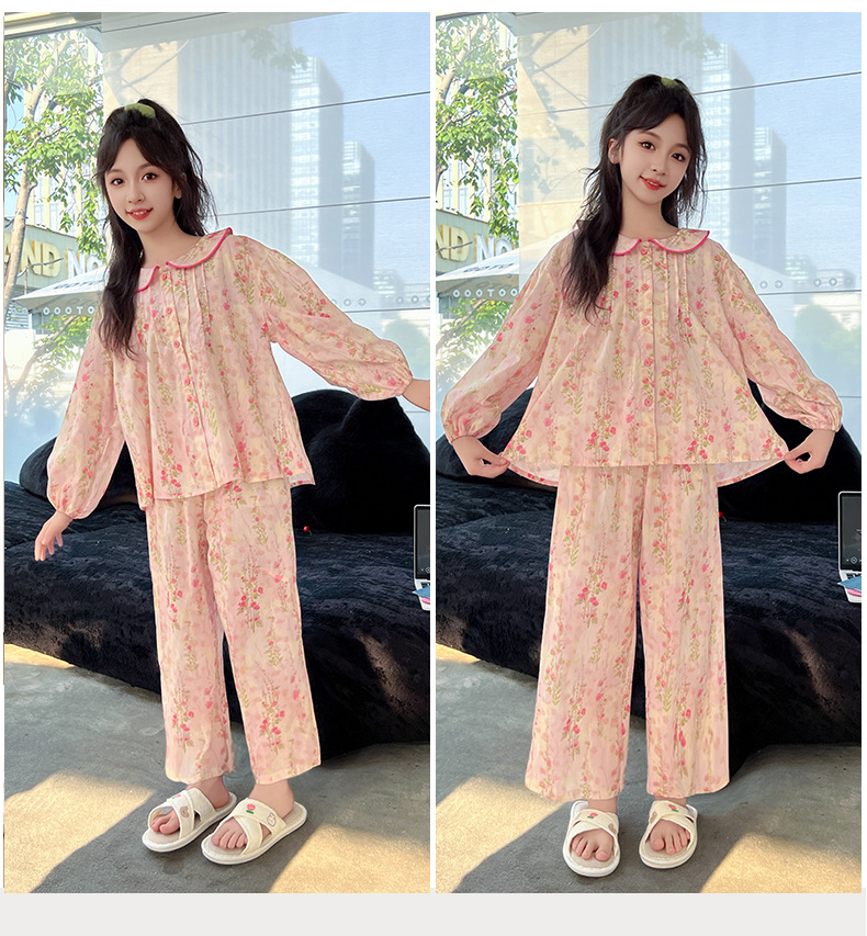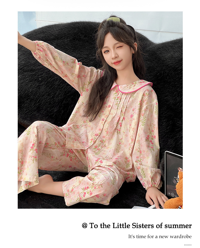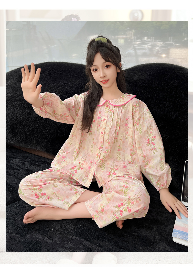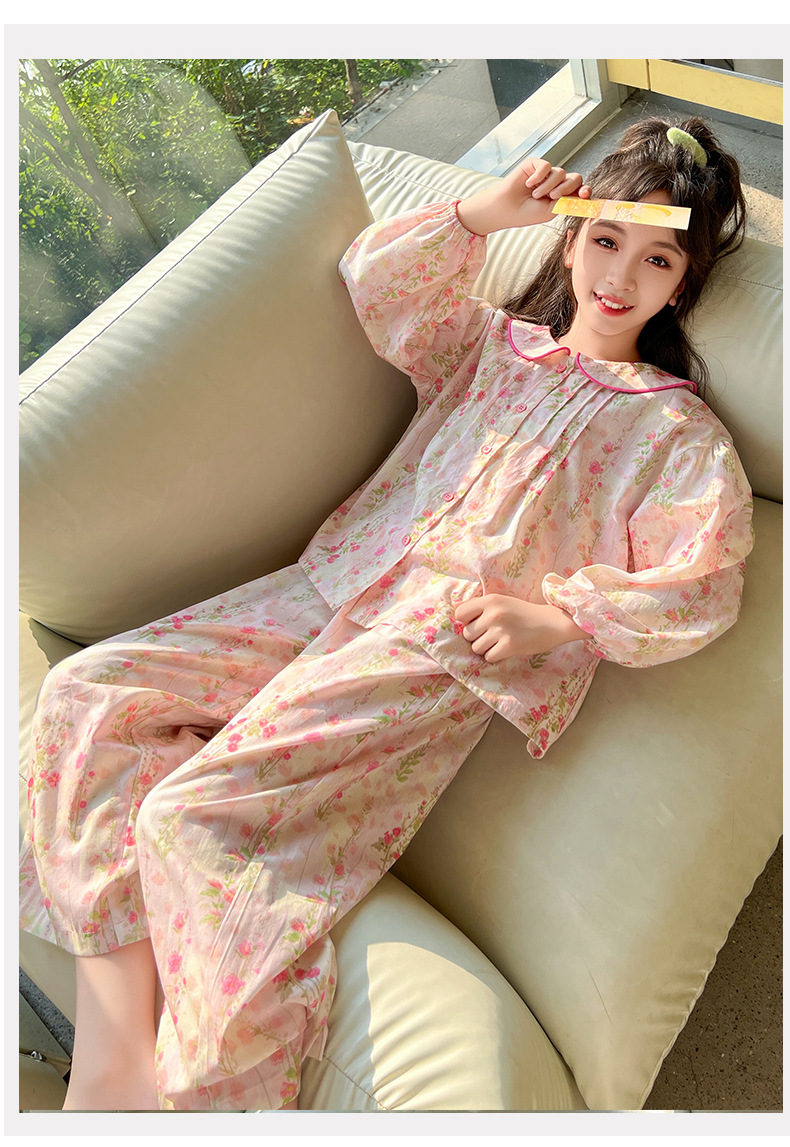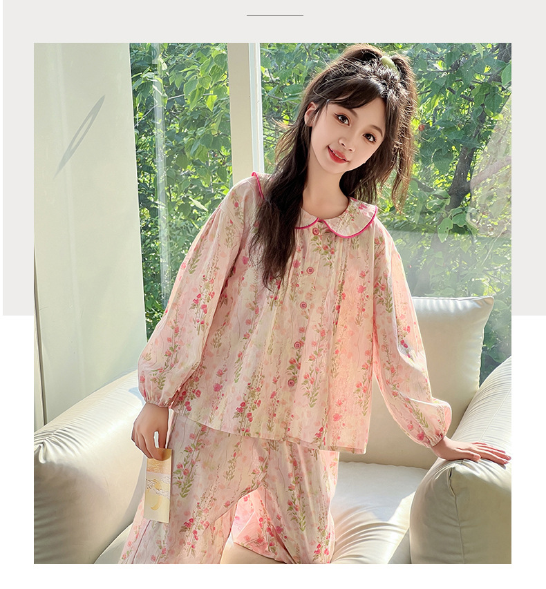 핑크색 잠옷 여아용 한국 스타일 달콤한 인형 칼라 긴팔 홈웨어 세트 중대형 어린이용 순면 꽃무늬 잠옷