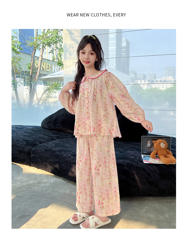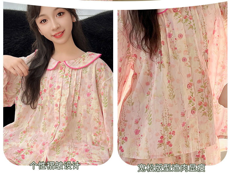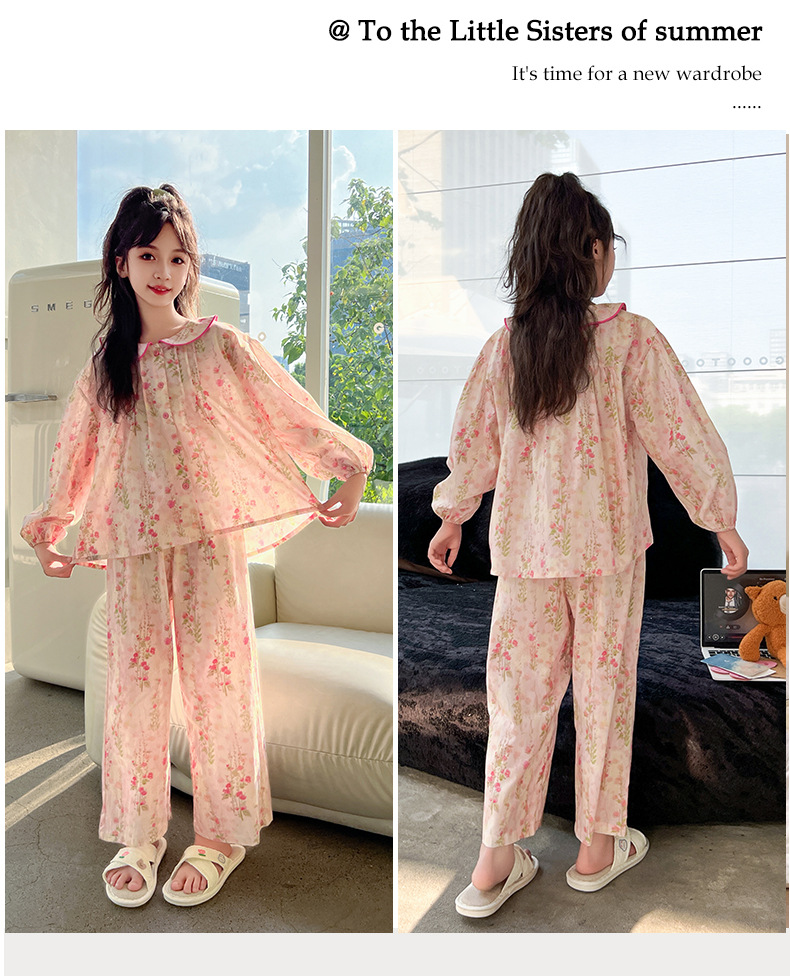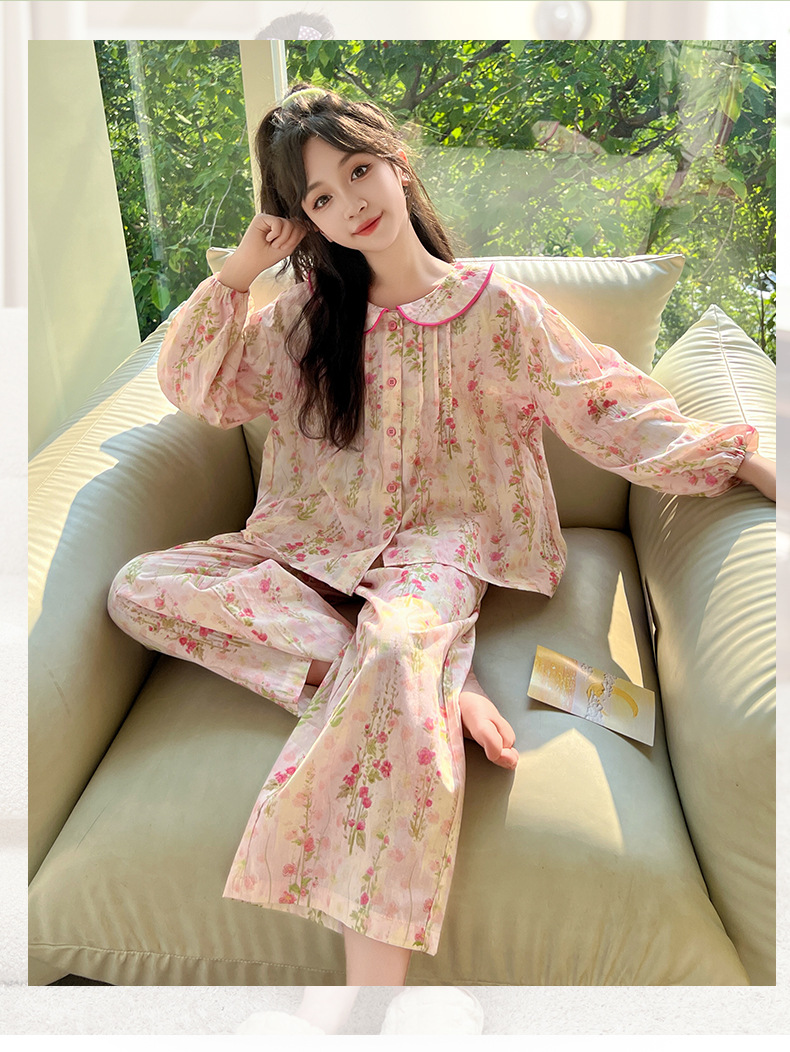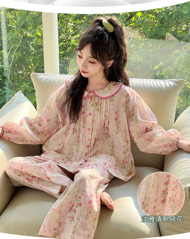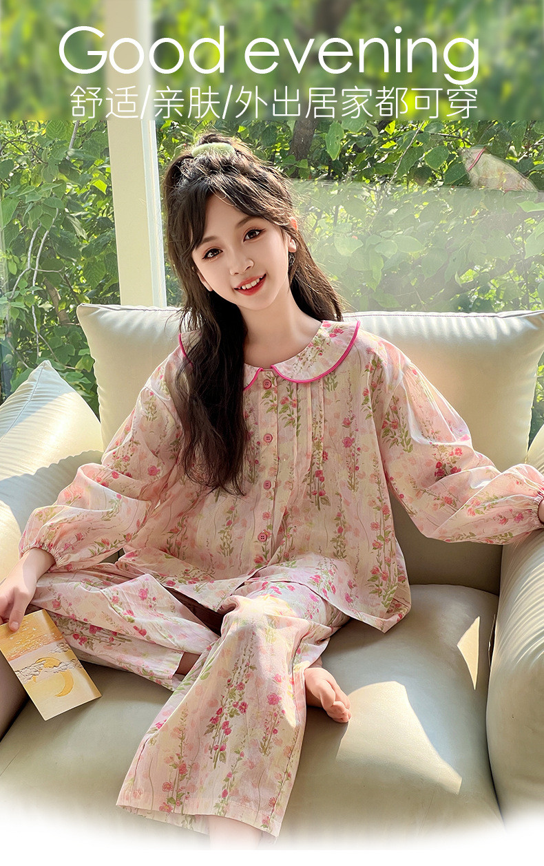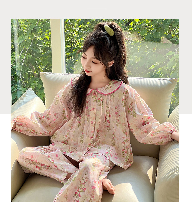 핑크색 잠옷 여아용 한국 스타일 달콤한 인형 칼라 긴팔 홈웨어 세트 중대형 어린이용 순면 꽃무늬 잠옷