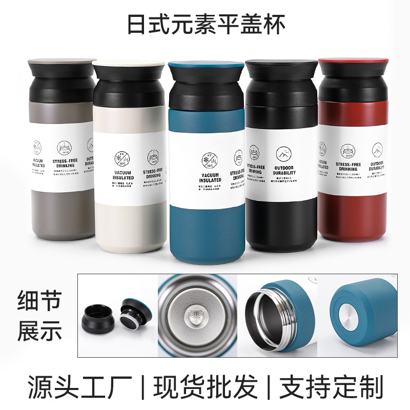 새로운 일본 요소 컵 평면 뚜껑 간단한 동반 물 컵 휴대용 304 스테인레스 스틸 더블 레이어 진공 보온병 컵스토어 가기