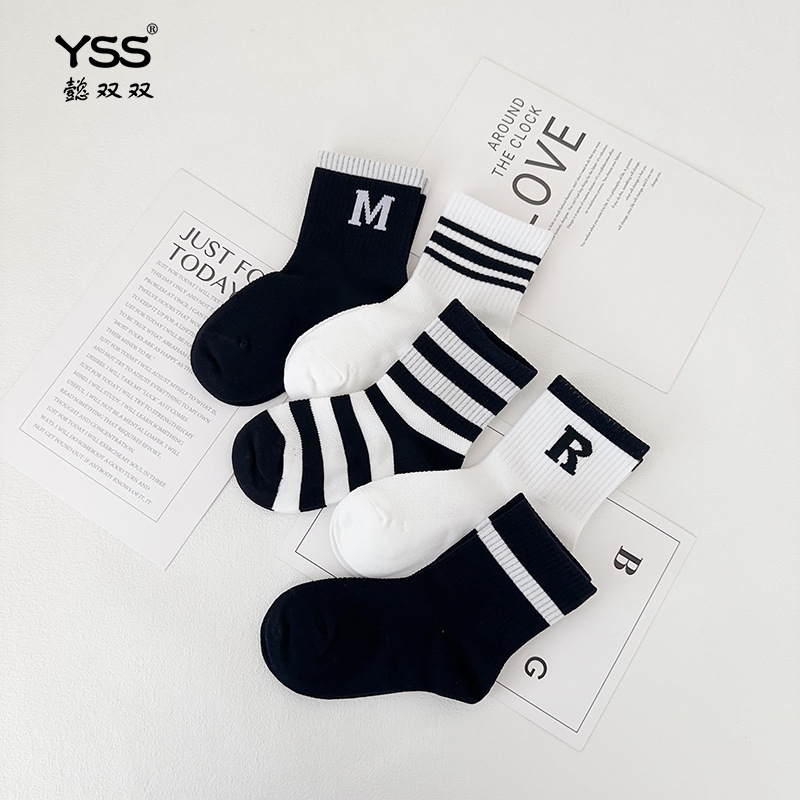 Yi Pair 어린이 양말 여름 새 메쉬 통기성 한국어 편지 미드 튜브 양말 빗 코튼 블랙 및 화이트 스포츠 양말