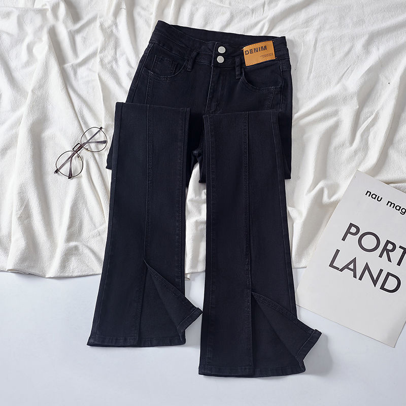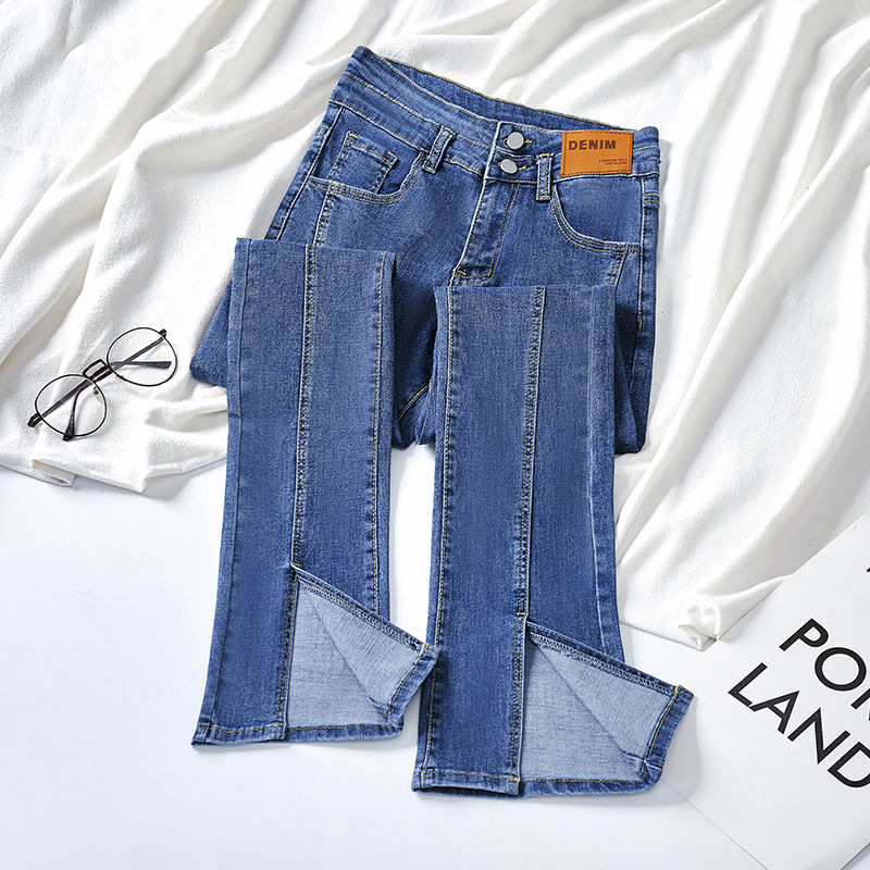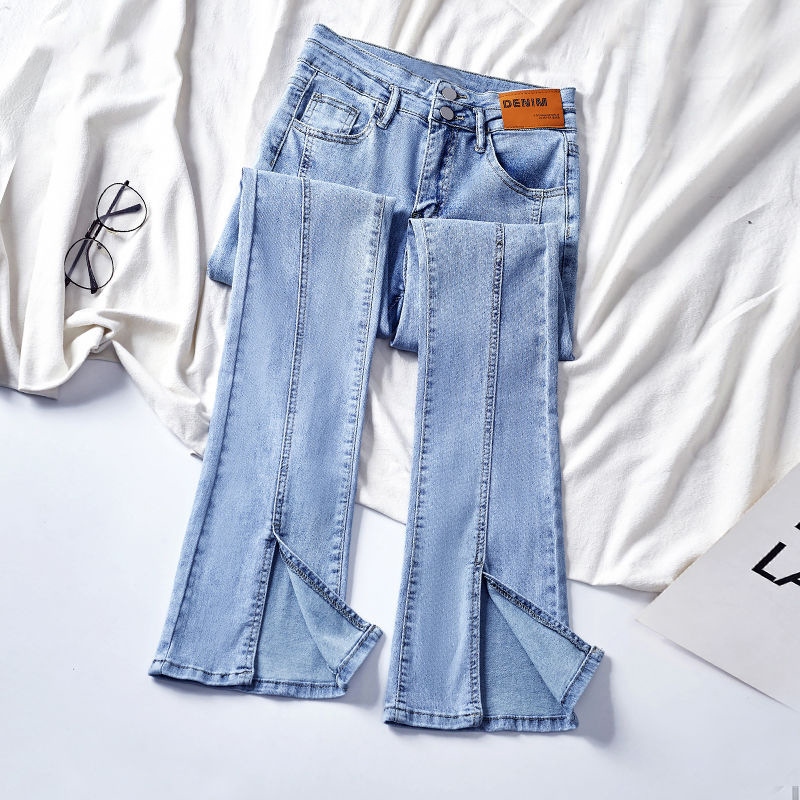 높은 허리 앞 분할 청바지 여성의 봄과 여름 탄성 타이트 디자인 높은 거리 넓은 다리 마이크로 혼 긴 바지스토어 가기