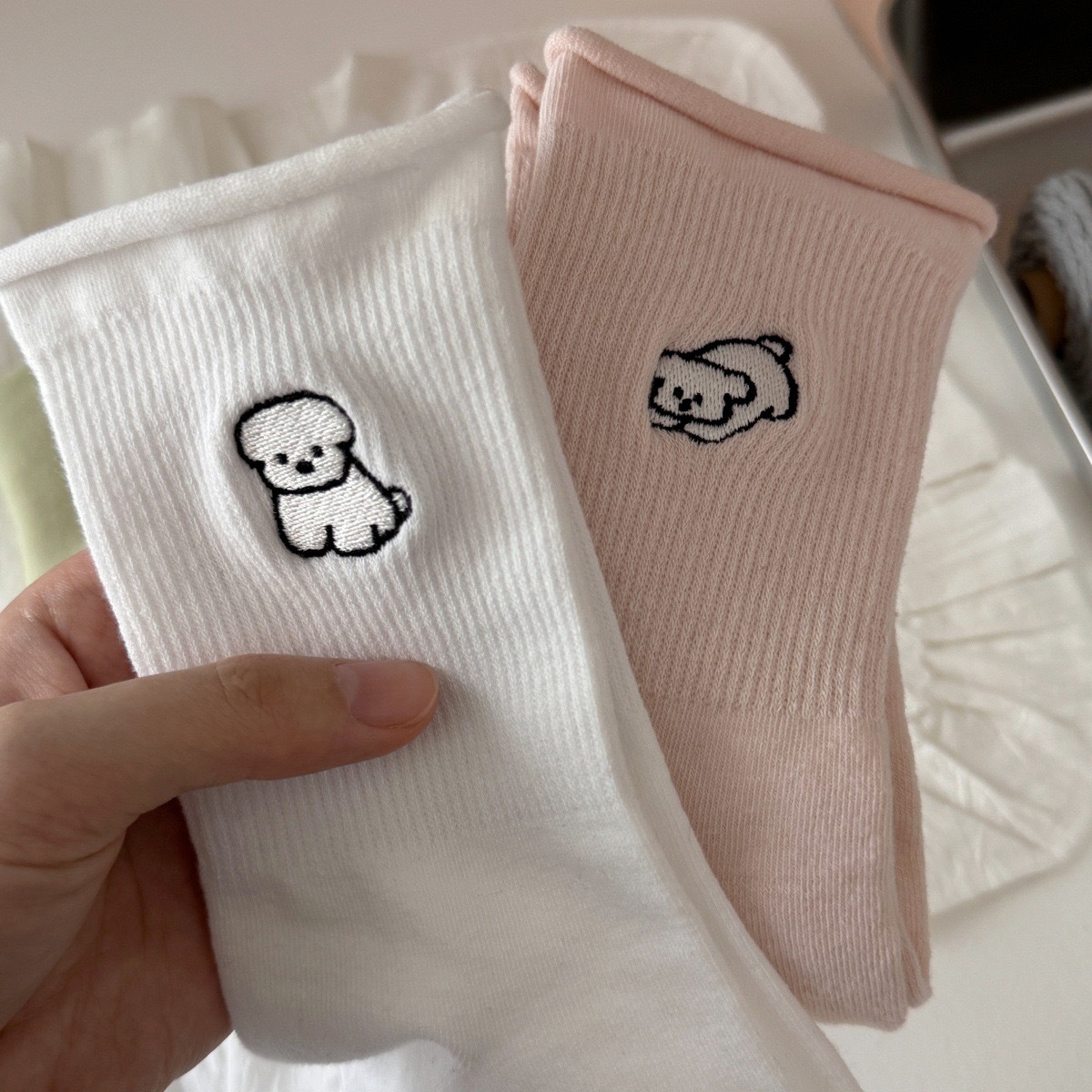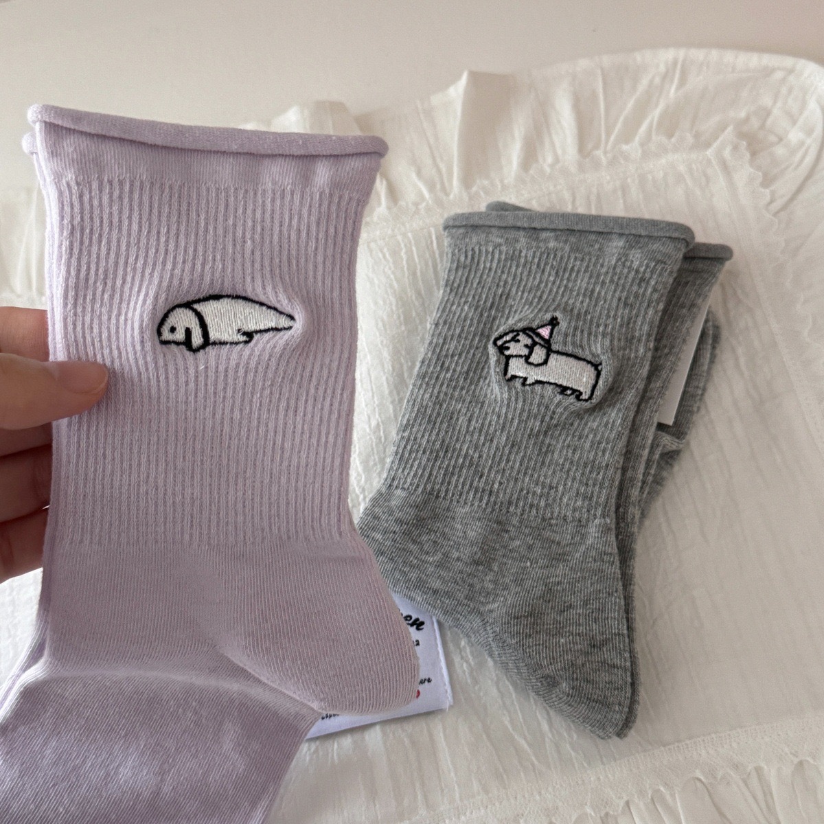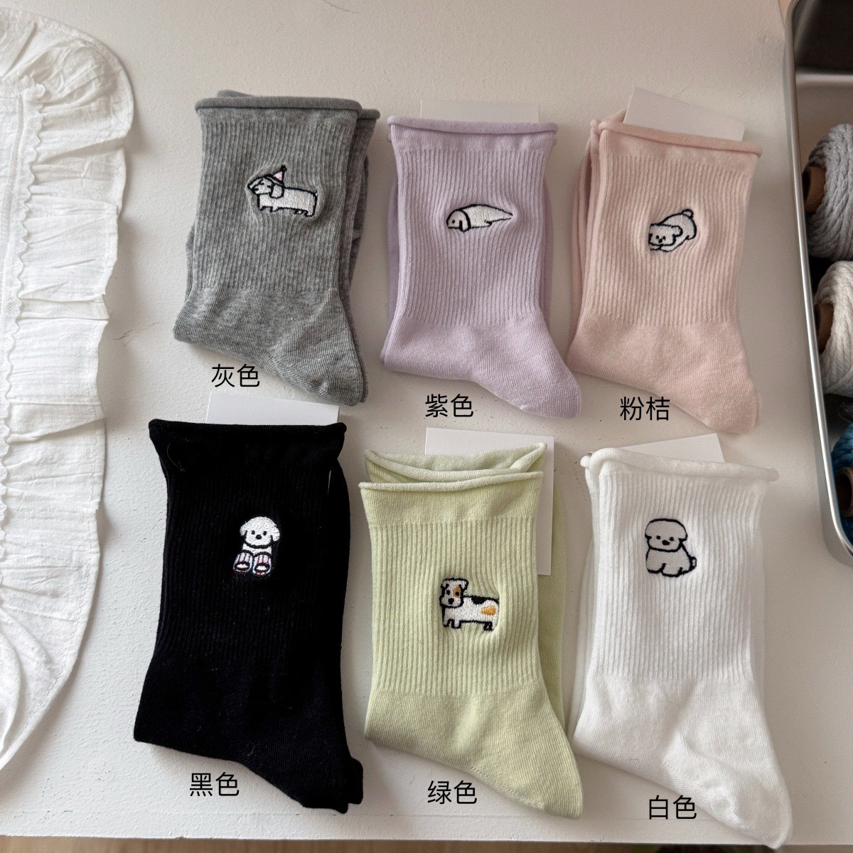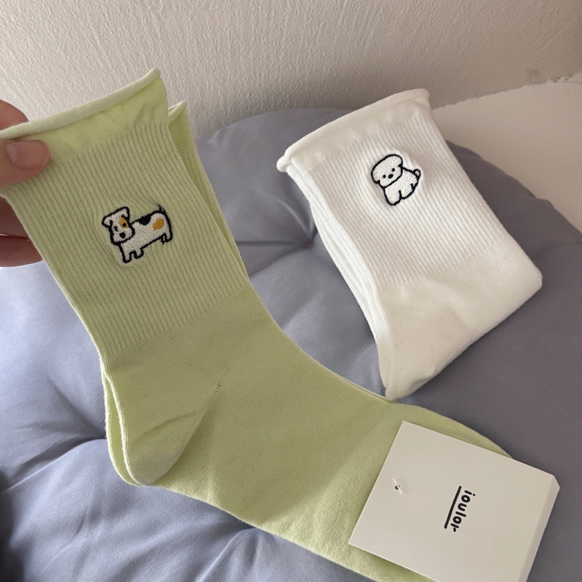 IOULOR 뼈없는 컬러 자수 귀여운 강아지 튜브 양말 올 매치 캐주얼 만화 일본 헴 봄과 가을 면화 양말