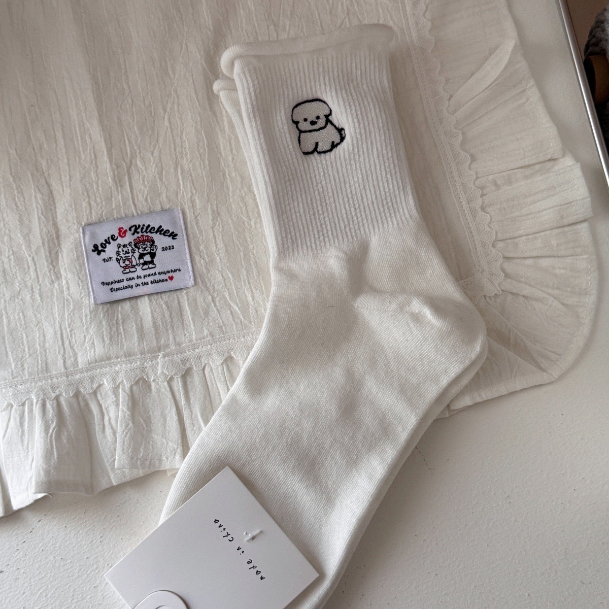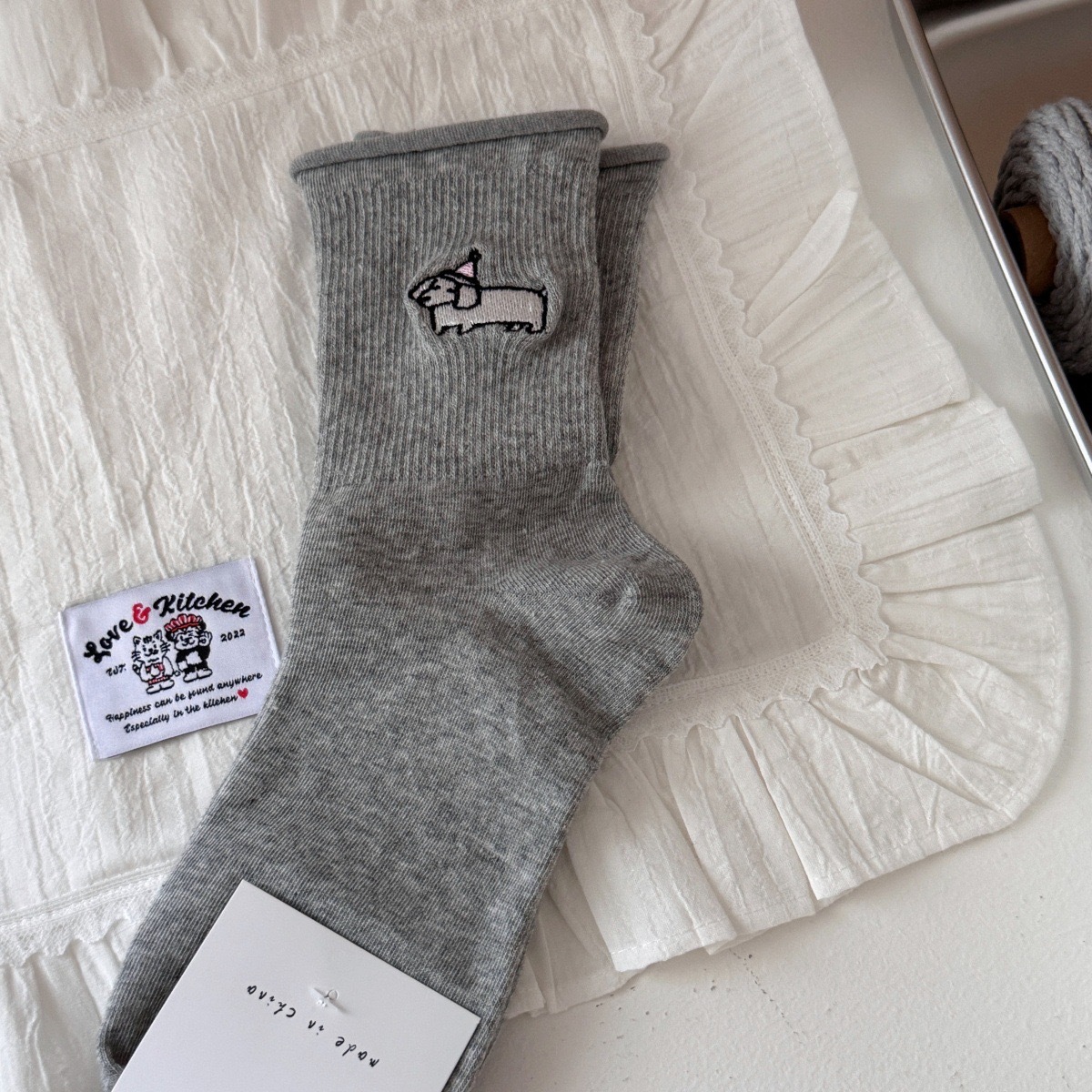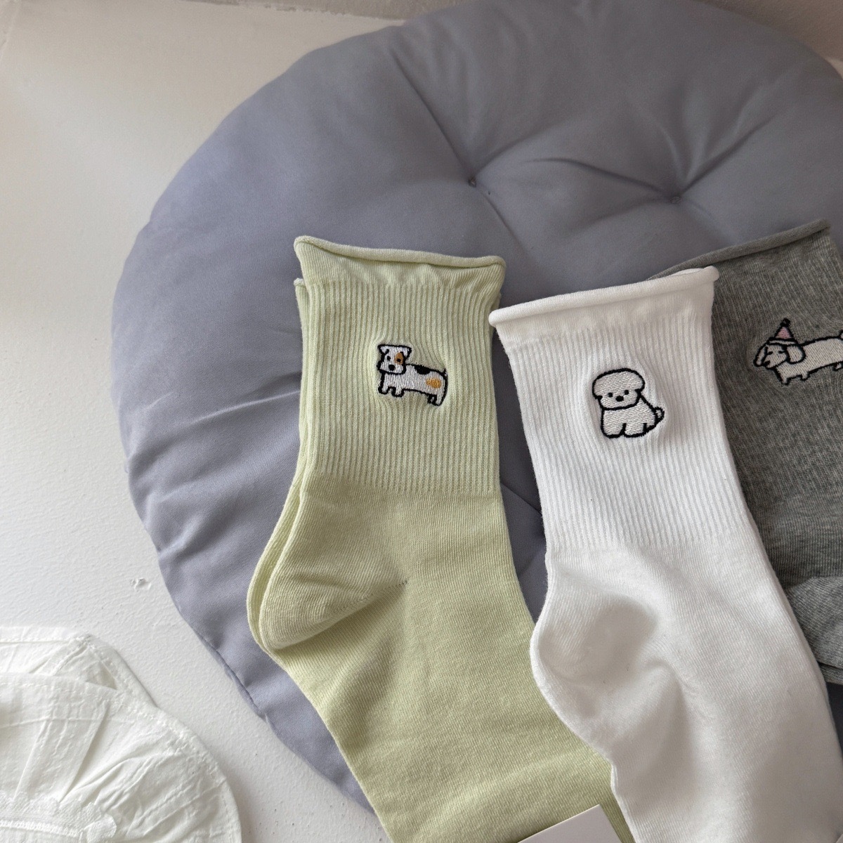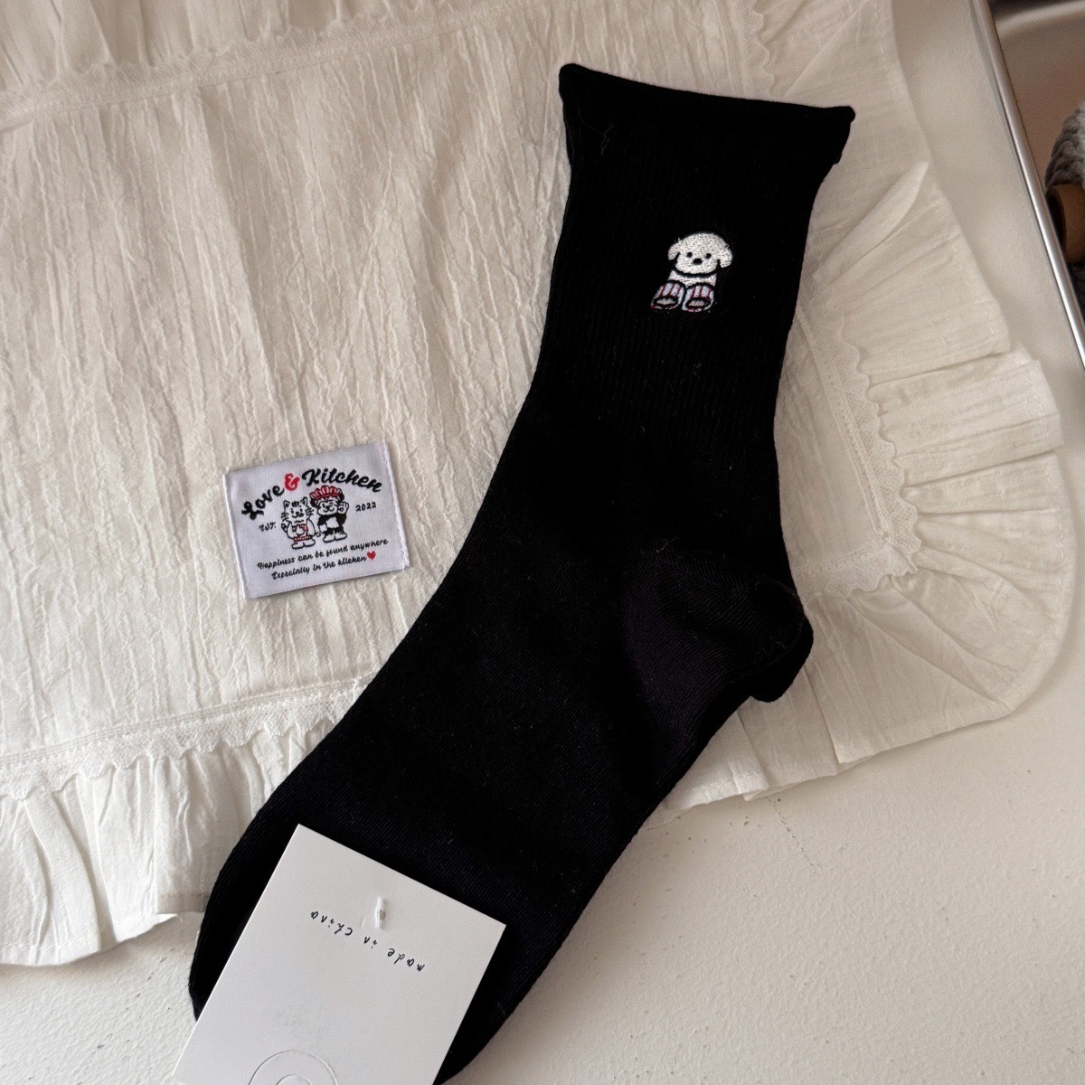 IOULOR 뼈없는 컬러 자수 귀여운 강아지 튜브 양말 올 매치 캐주얼 만화 일본 헴 봄과 가을 면화 양말