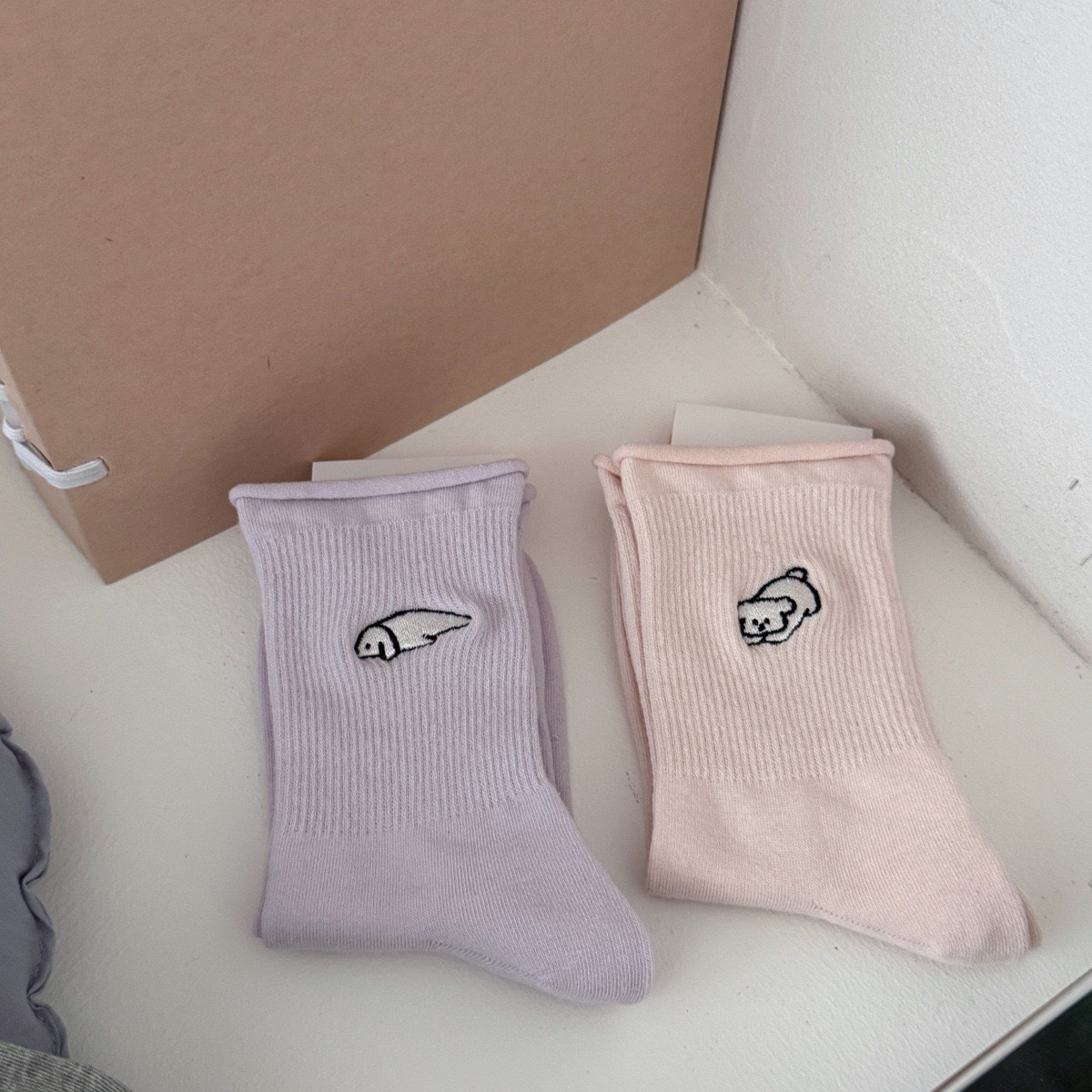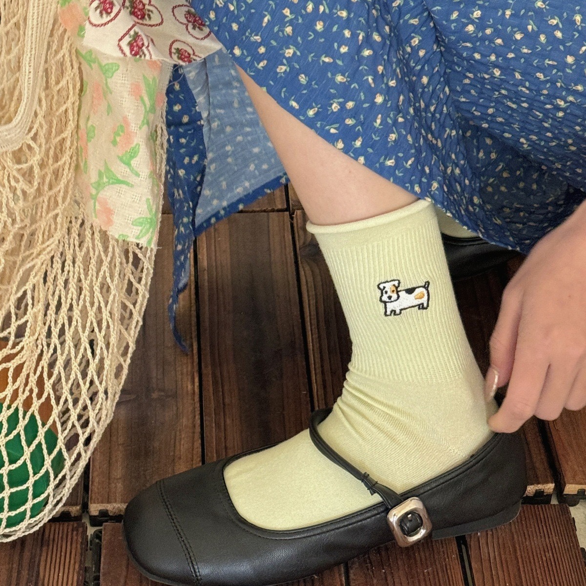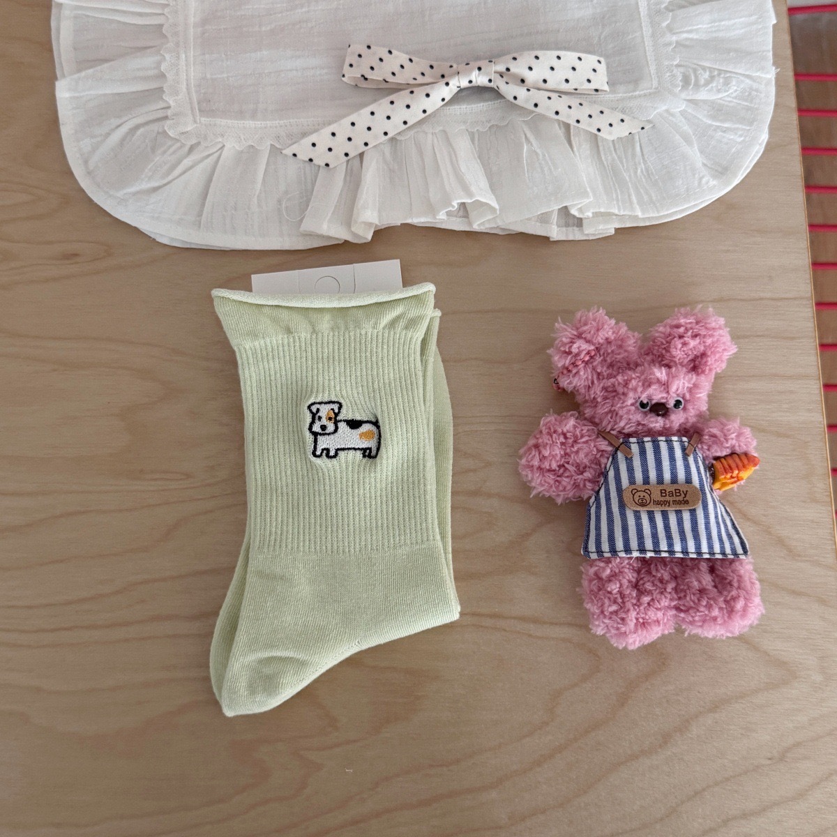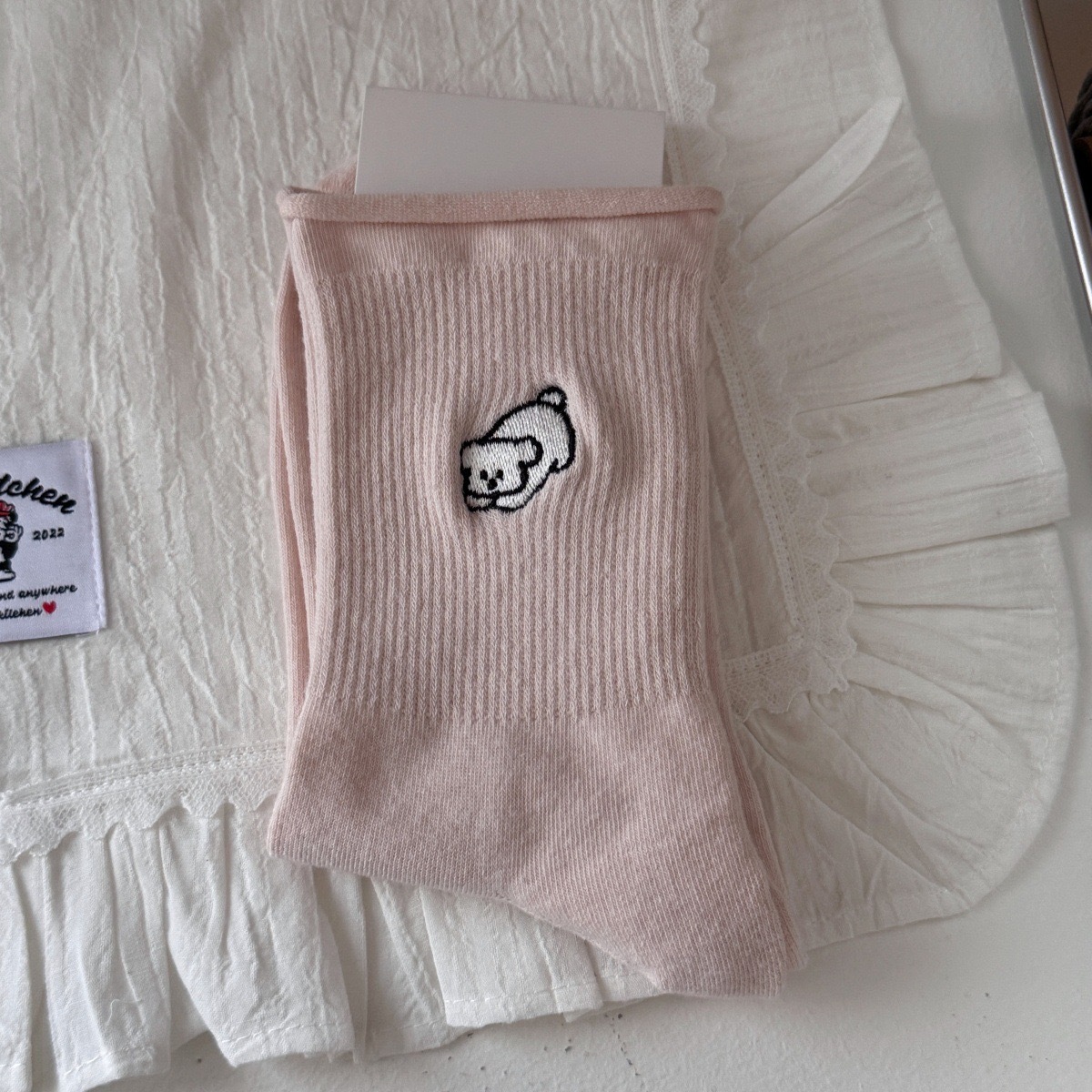 IOULOR 뼈없는 컬러 자수 귀여운 강아지 튜브 양말 올 매치 캐주얼 만화 일본 헴 봄과 가을 면화 양말