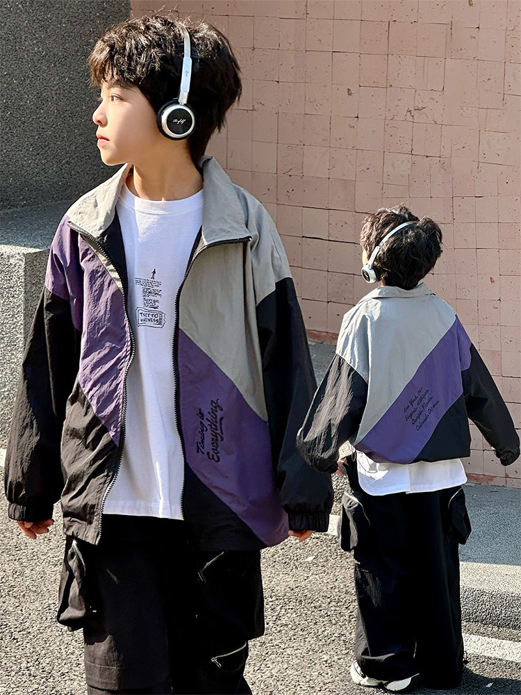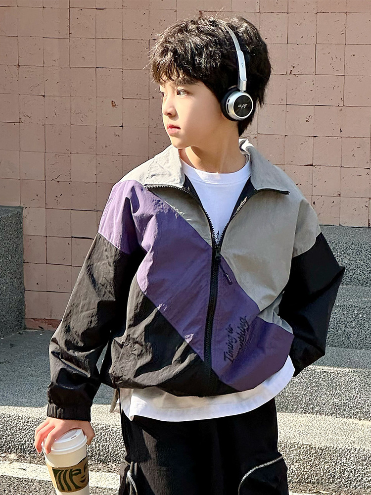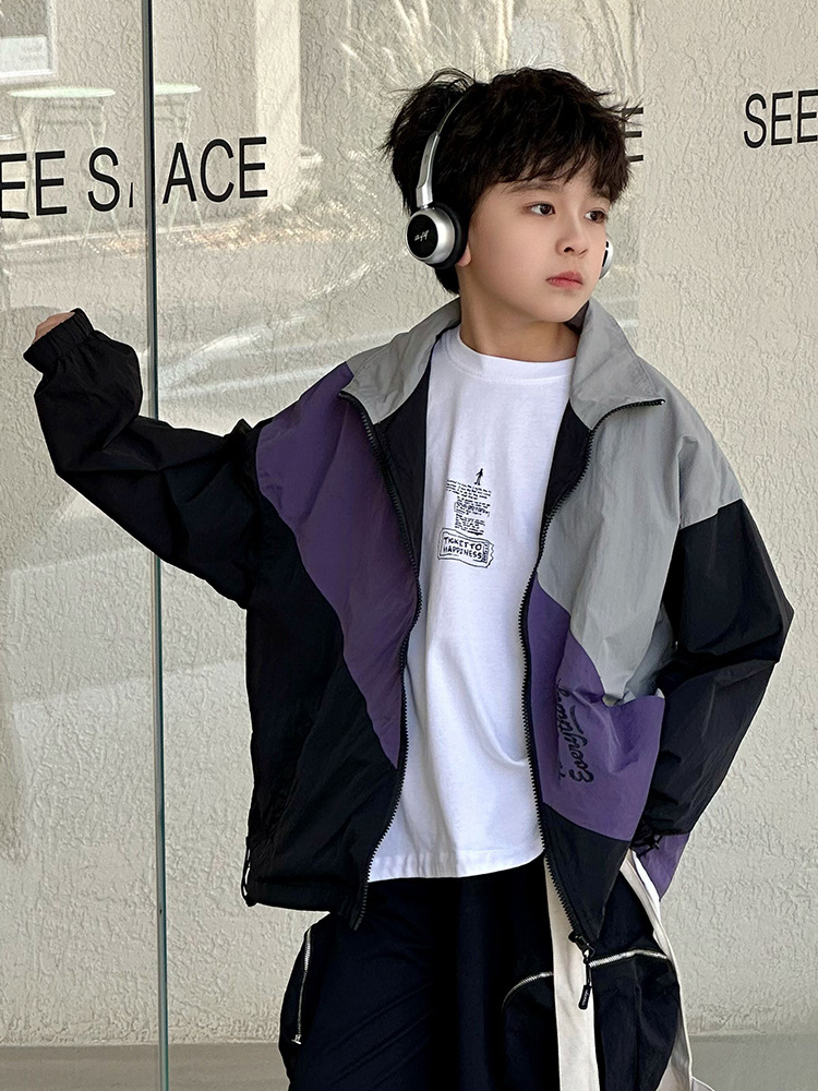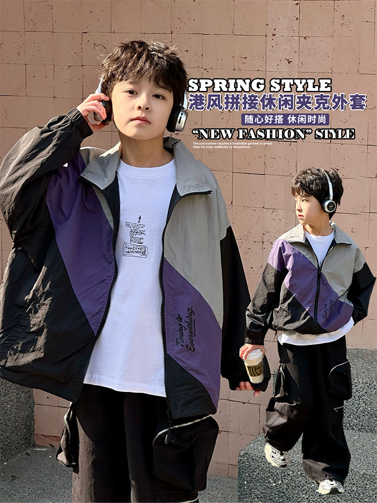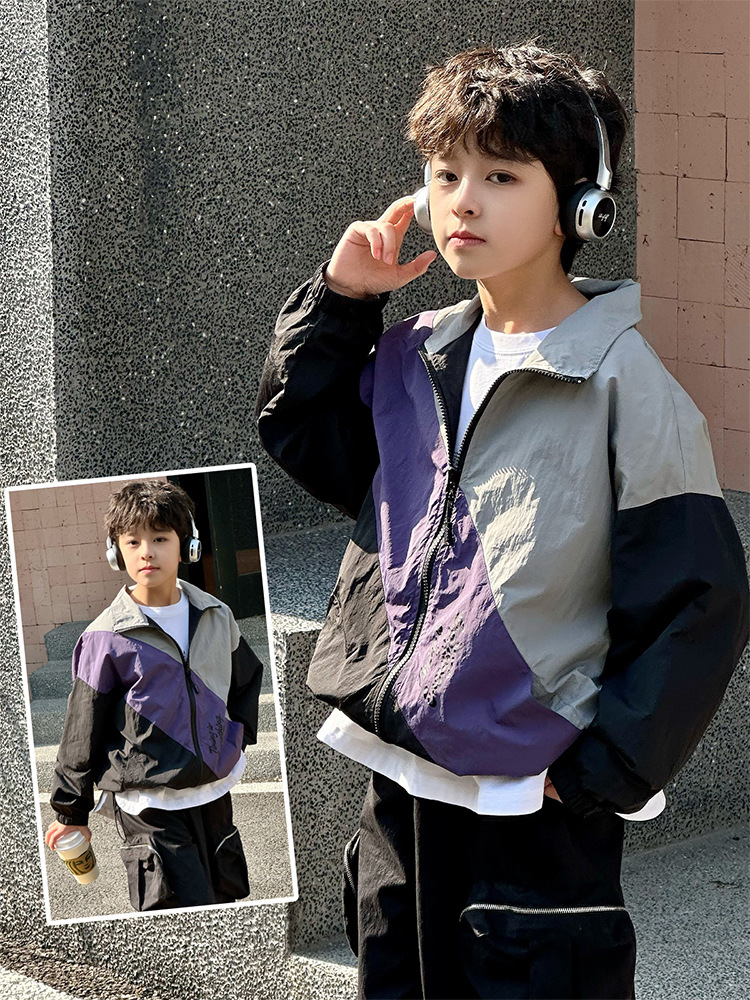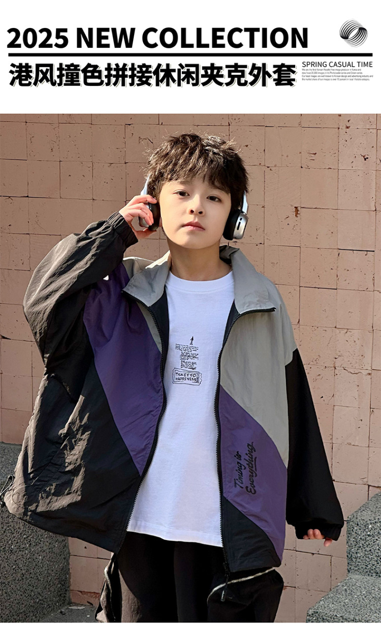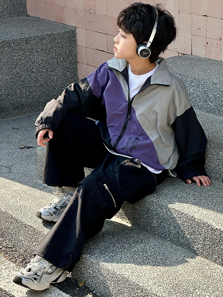 어린이 콘트라스트 탑 2025 봄 새로운 외국 스타일의 세련된 튀김 거리 소년 얇은 코트, 바지스토어 가기