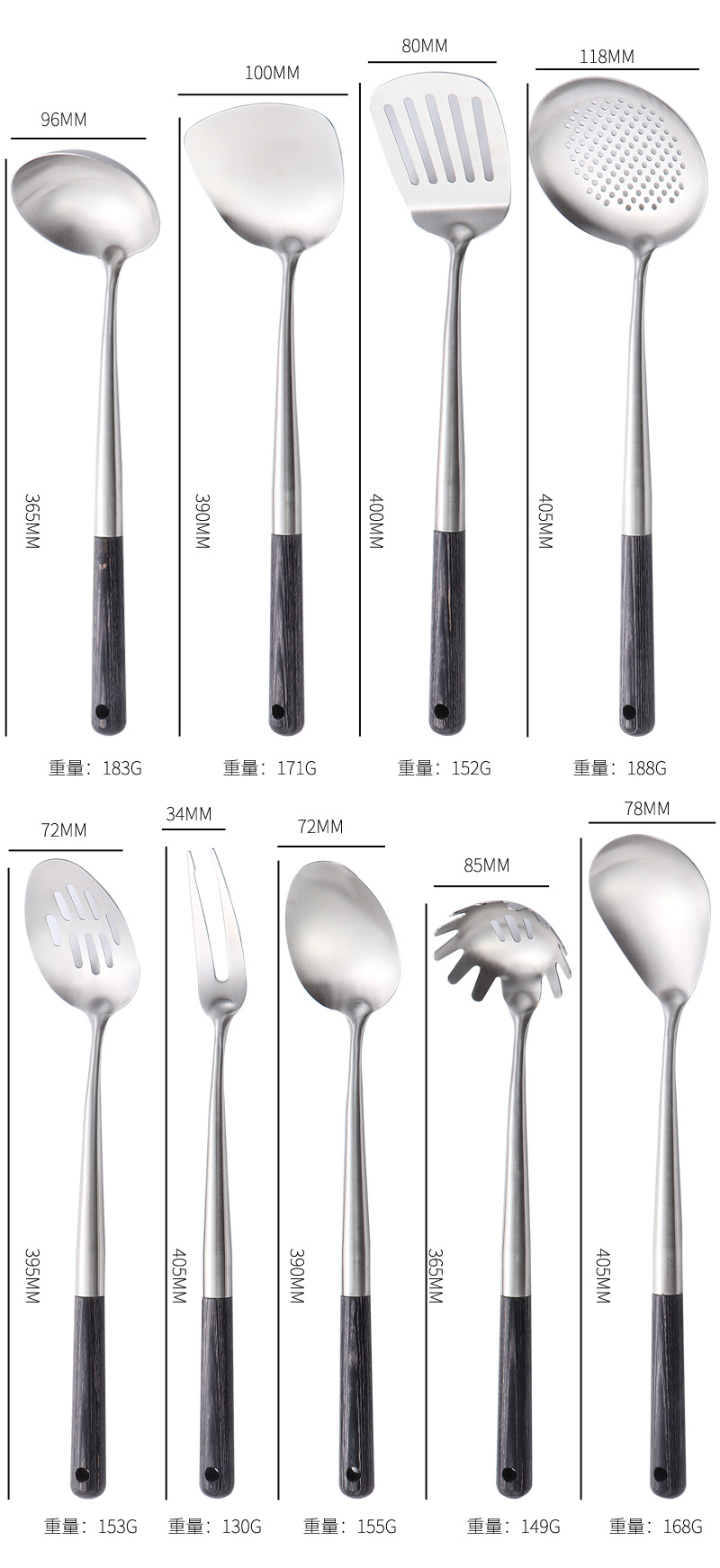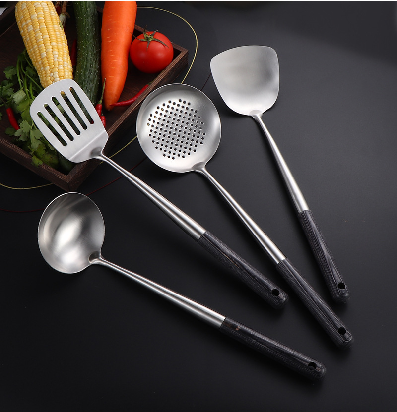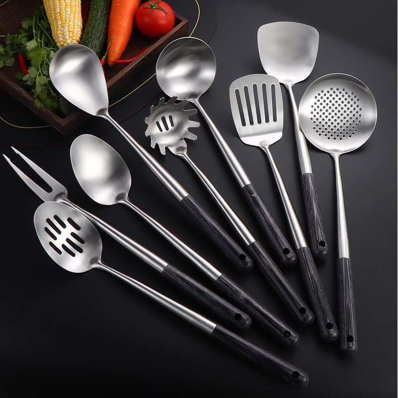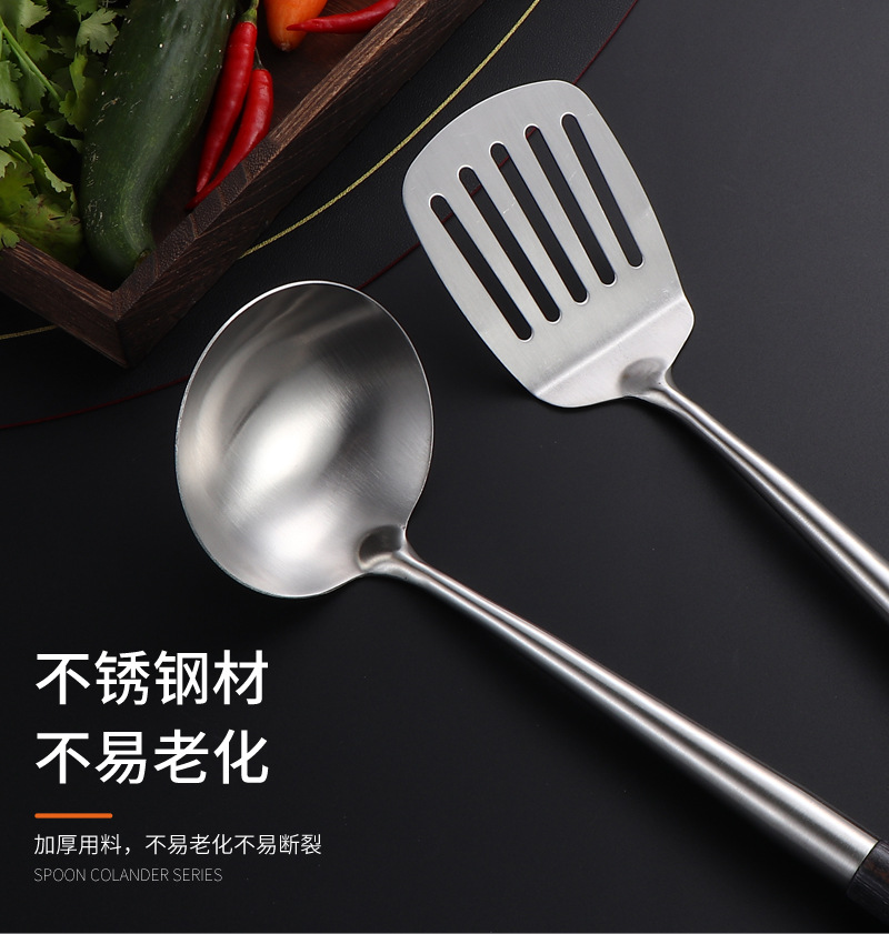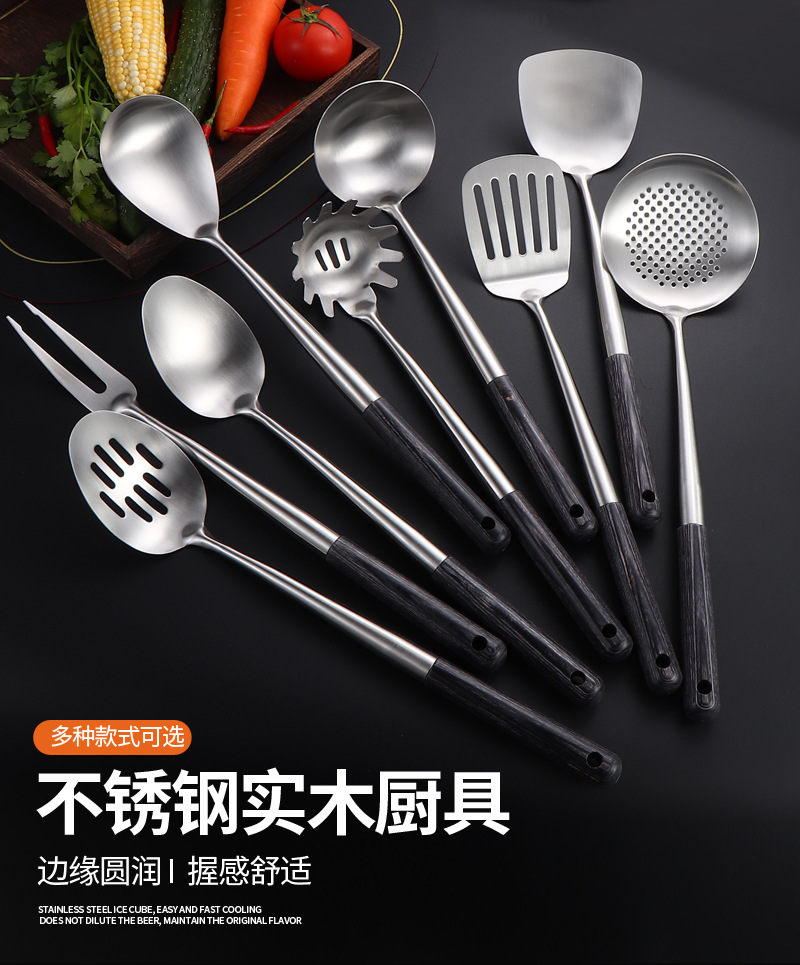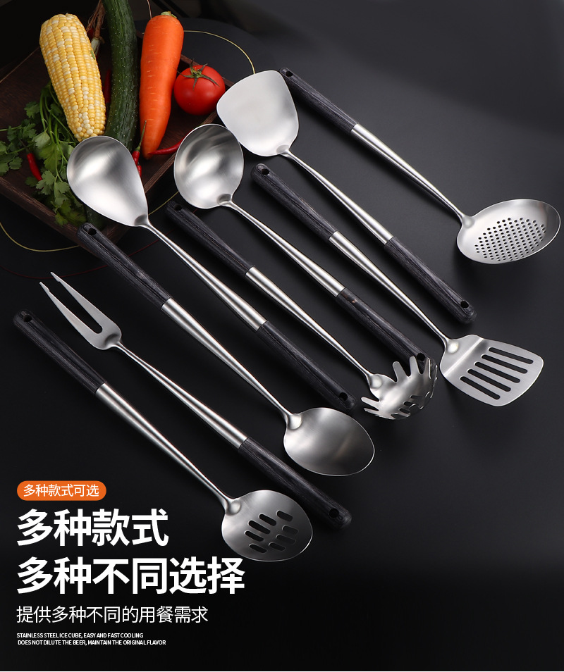 국경 304 스테인레스 스틸 나무 손잡이 주방 용품 세트 요리 도구 주걱 수프 숟가락 고기 포크 국수 숟가락 큰 누출